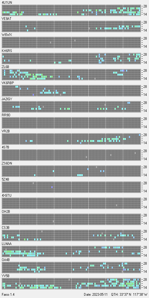 This is a record of NCDXF Beacon received at W6SI station using FAROS 1.4 monitor software. There are 18 beacons throughout the world, it records each ham band between 20m to 10m bands, including WARC bands. Each row on the given beacon block represents the band, 20, 17, 15, 12 and 10 meters, from the bottom to the top. The chart shows the relative signal strength (S/N ratio) of the received beacon. |