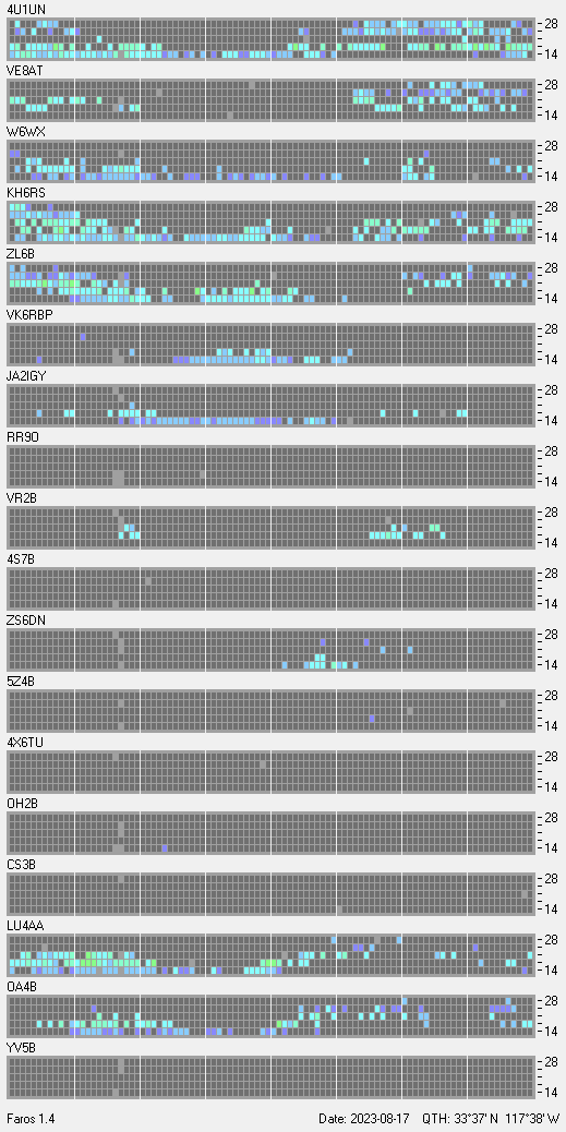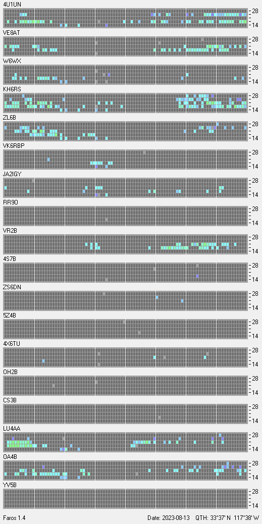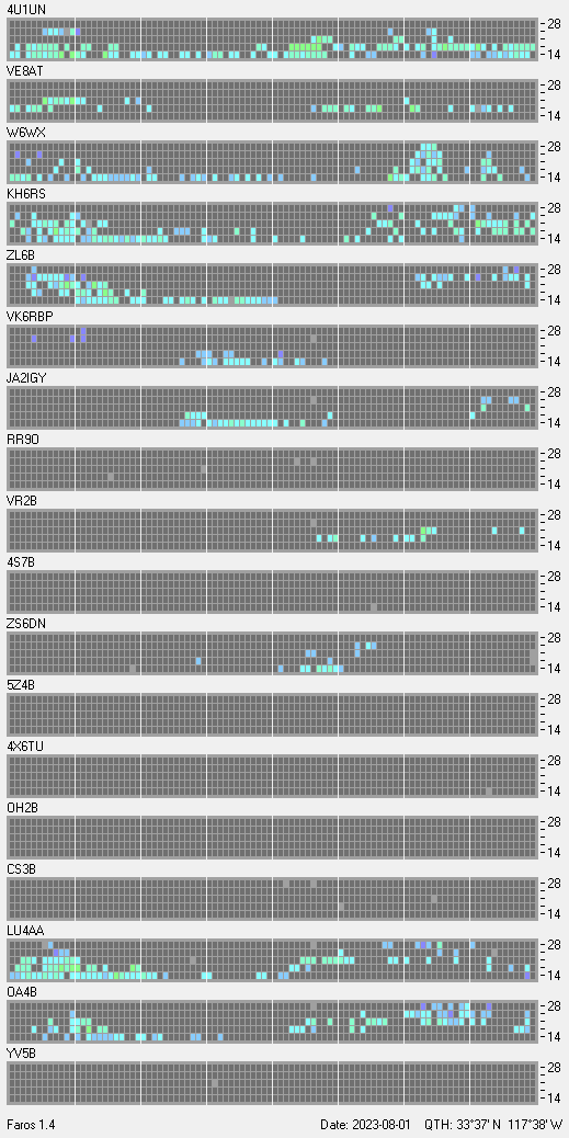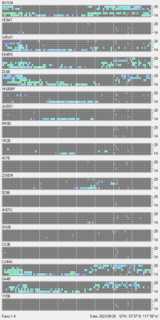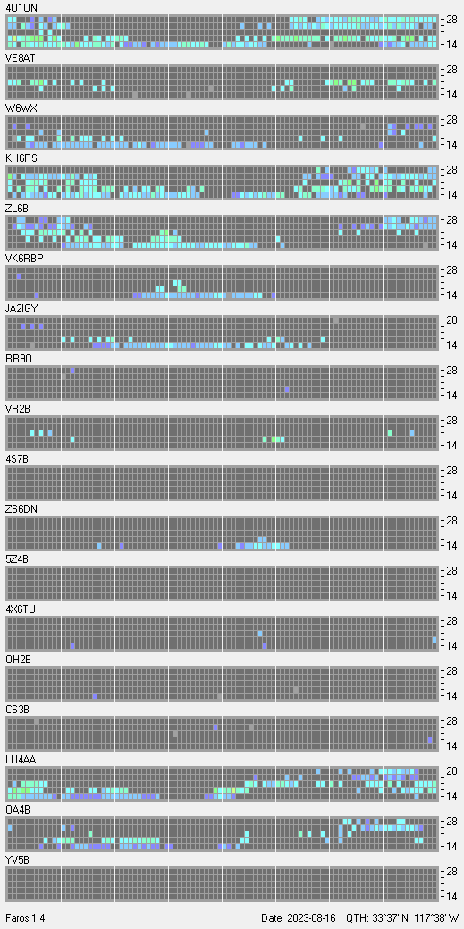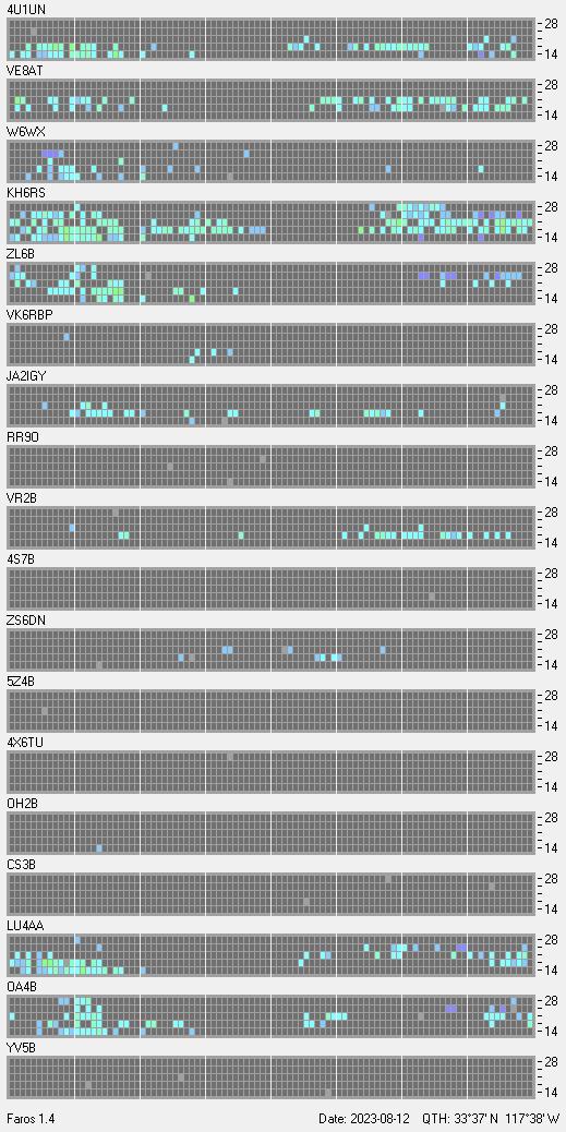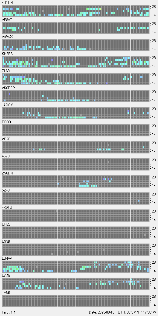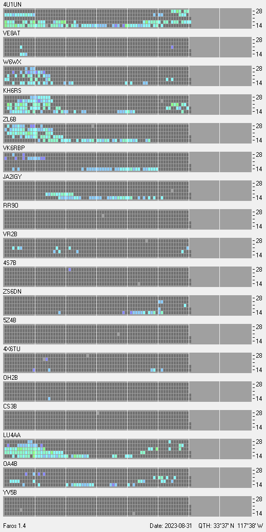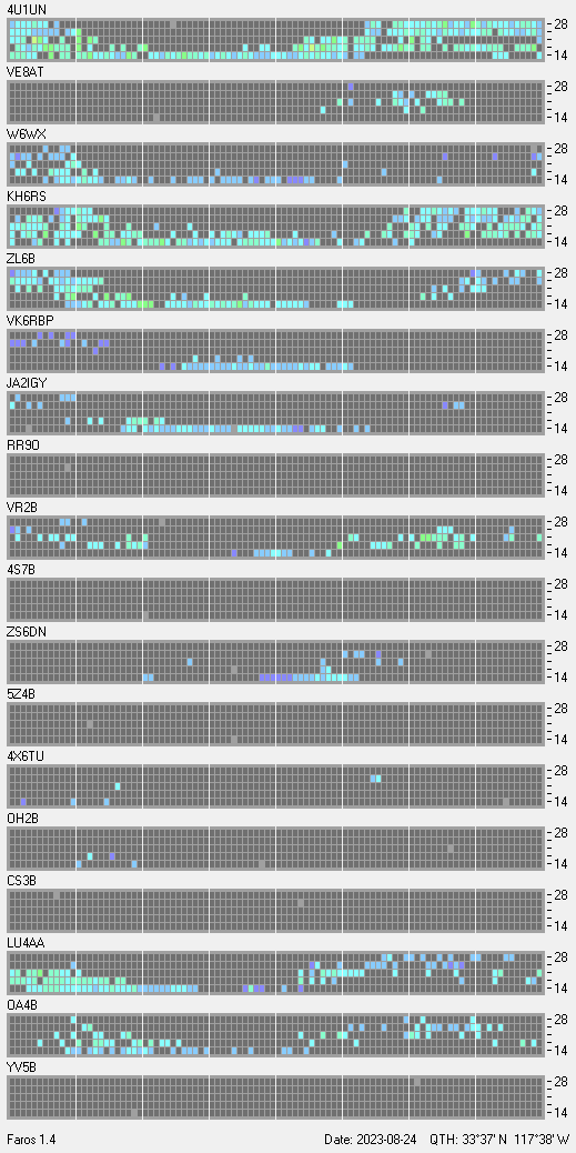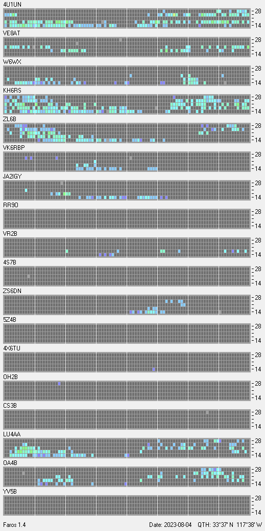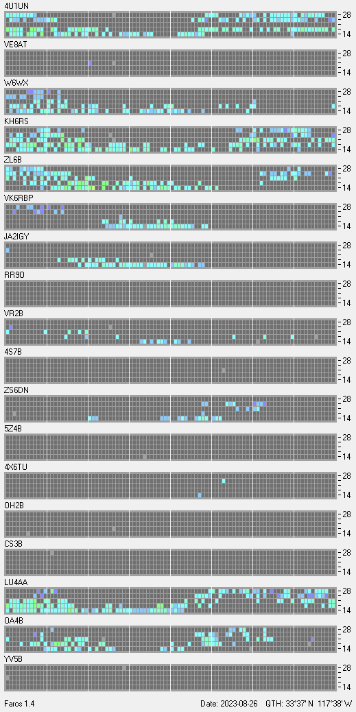 This is a record of NCDXF Beacon received at W6SI station using FAROS 1.4 monitor software. There are 18 beacons throughout the world, it records each ham band between 20m to 10m bands, including WARC bands. Each row on the given beacon block represents the band, 20, 17, 15, 12 and 10 meters, from the bottom to the top. The chart shows the relative signal strength (S/N ratio) of the received beacon. |