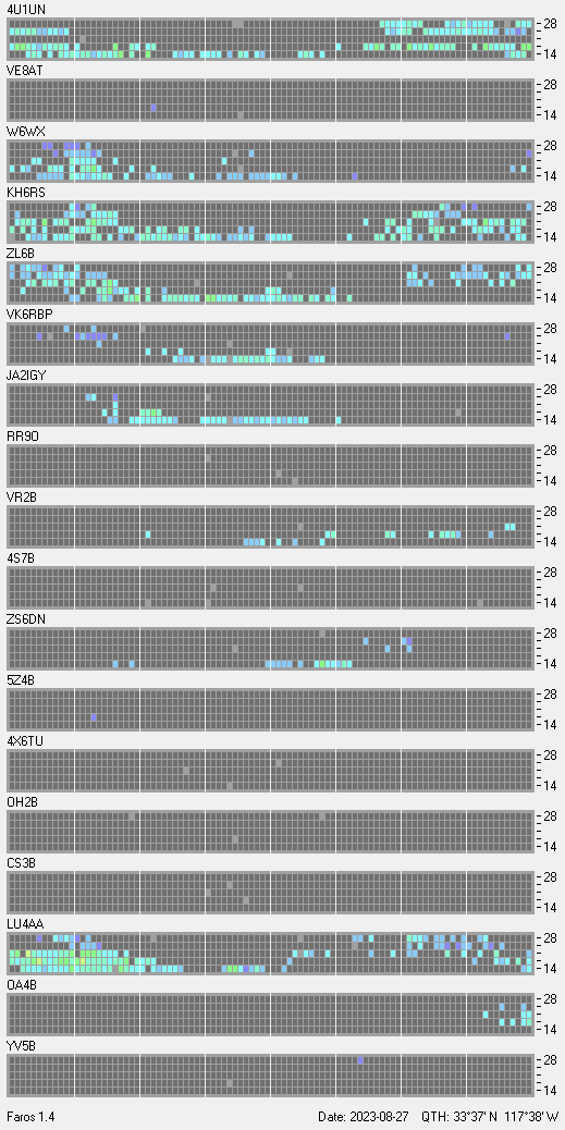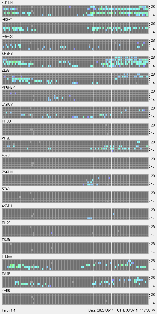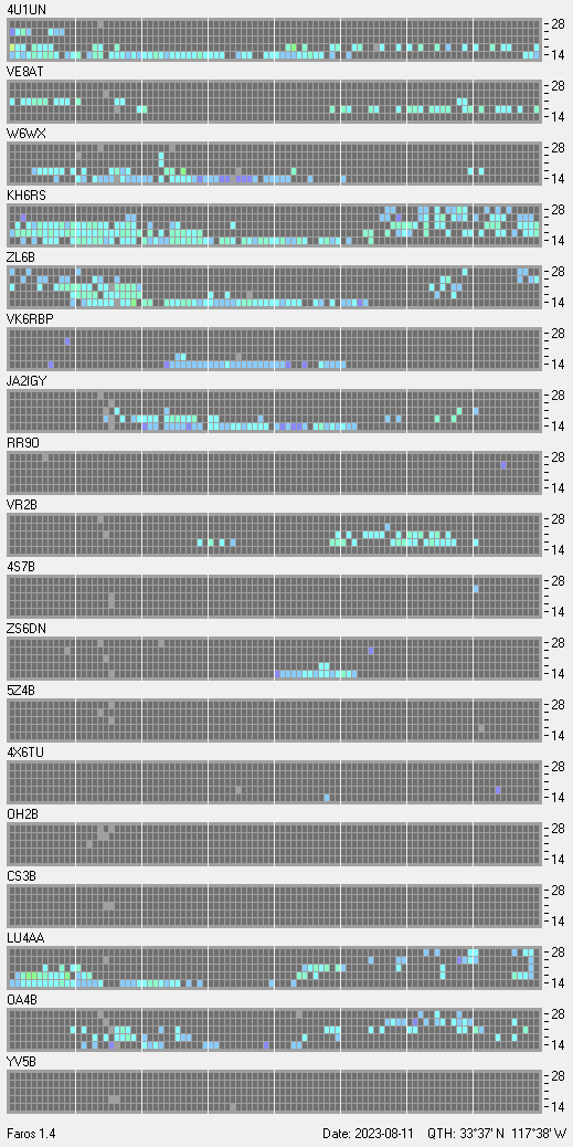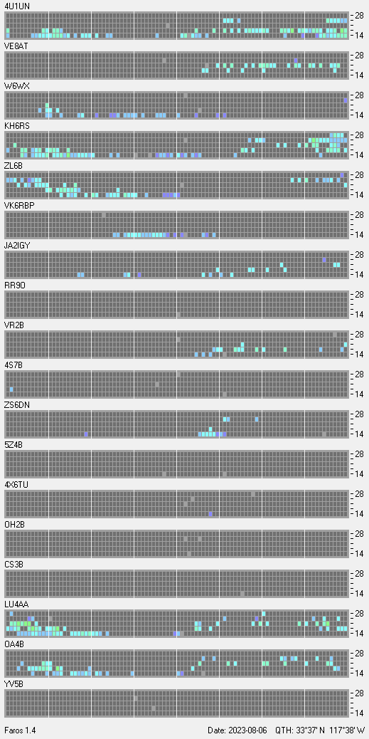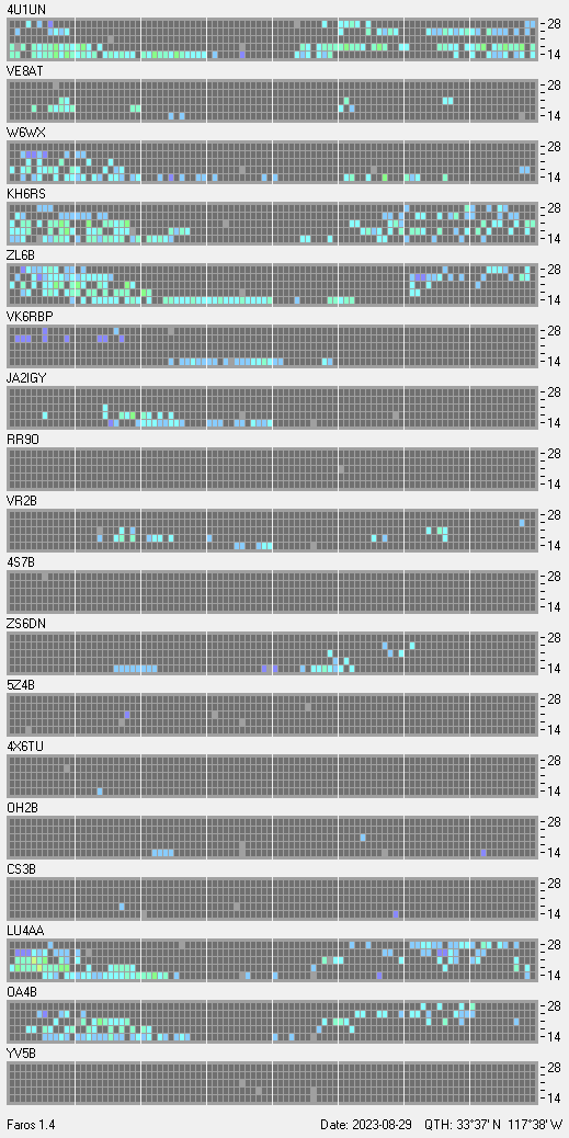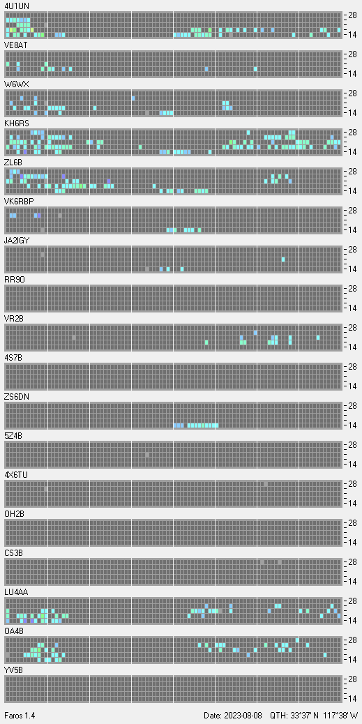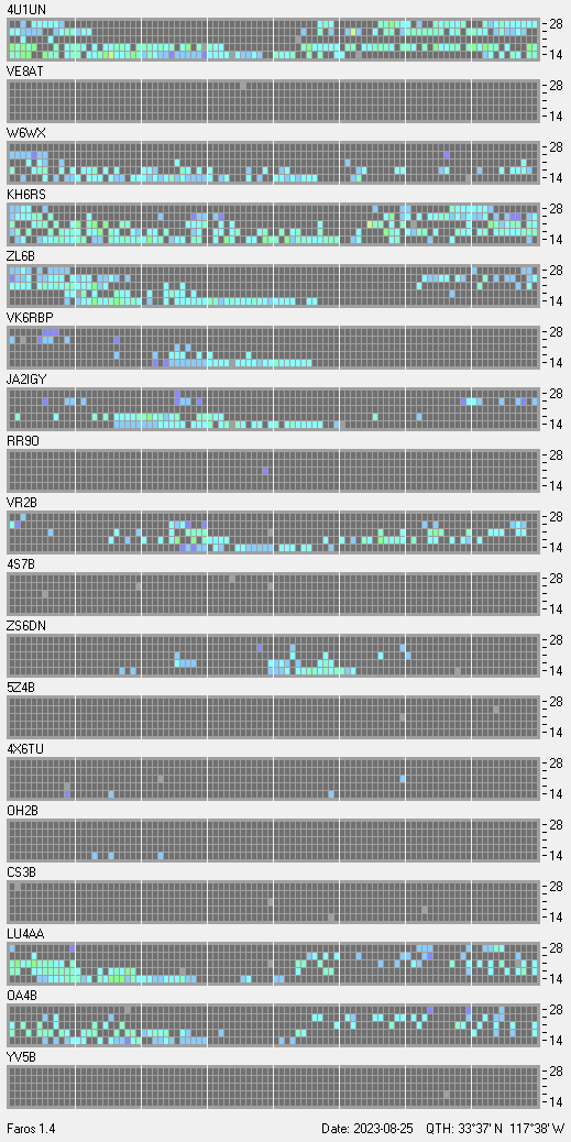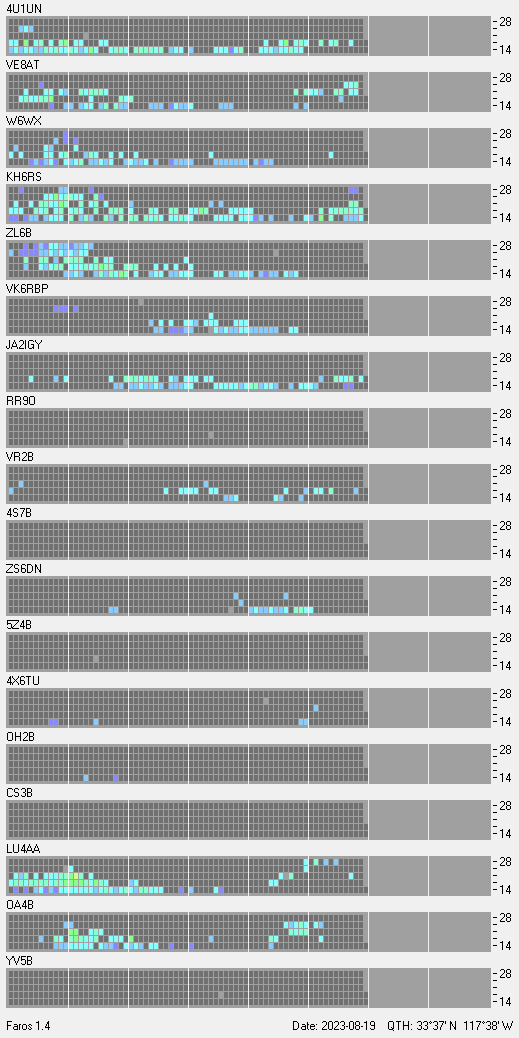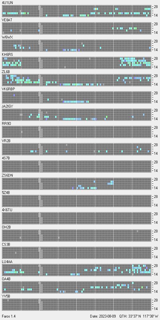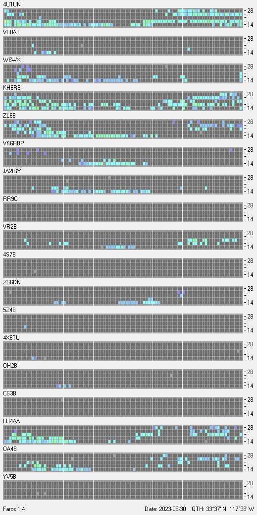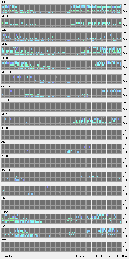 This is a record of NCDXF Beacon received at W6SI station using FAROS 1.4 monitor software. There are 18 beacons throughout the world, it records each ham band between 20m to 10m bands, including WARC bands. Each row on the given beacon block represents the band, 20, 17, 15, 12 and 10 meters, from the bottom to the top. The chart shows the relative signal strength (S/N ratio) of the received beacon. |