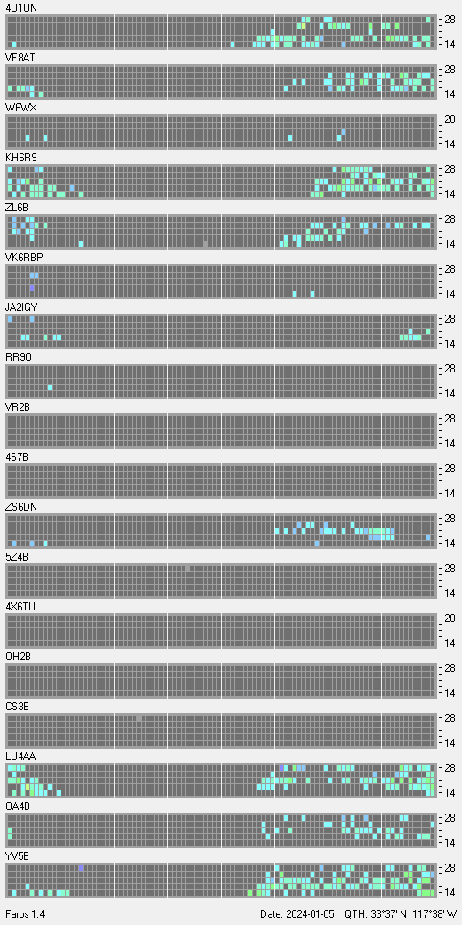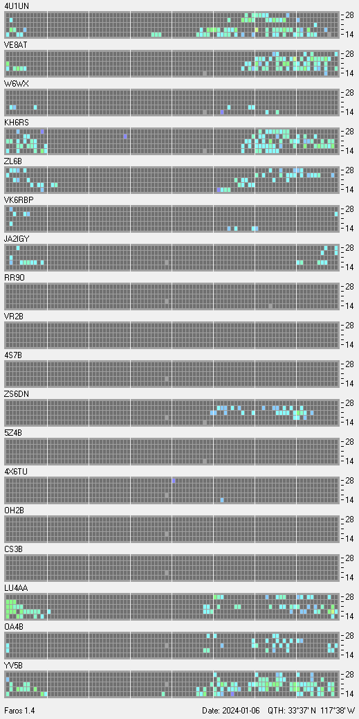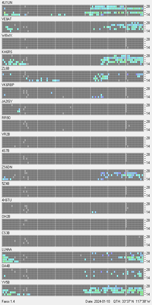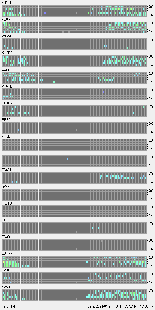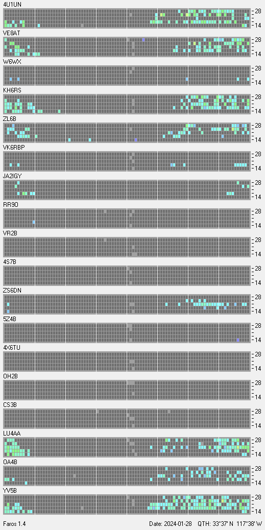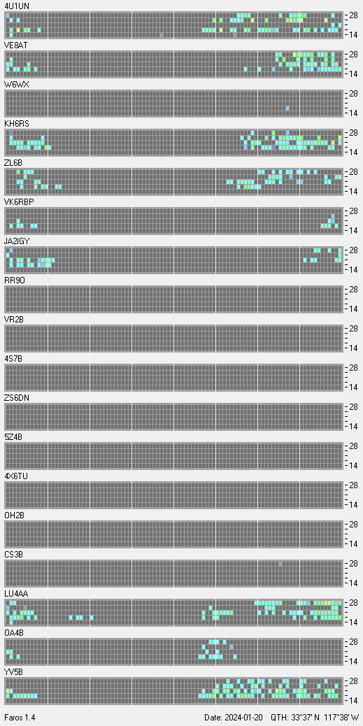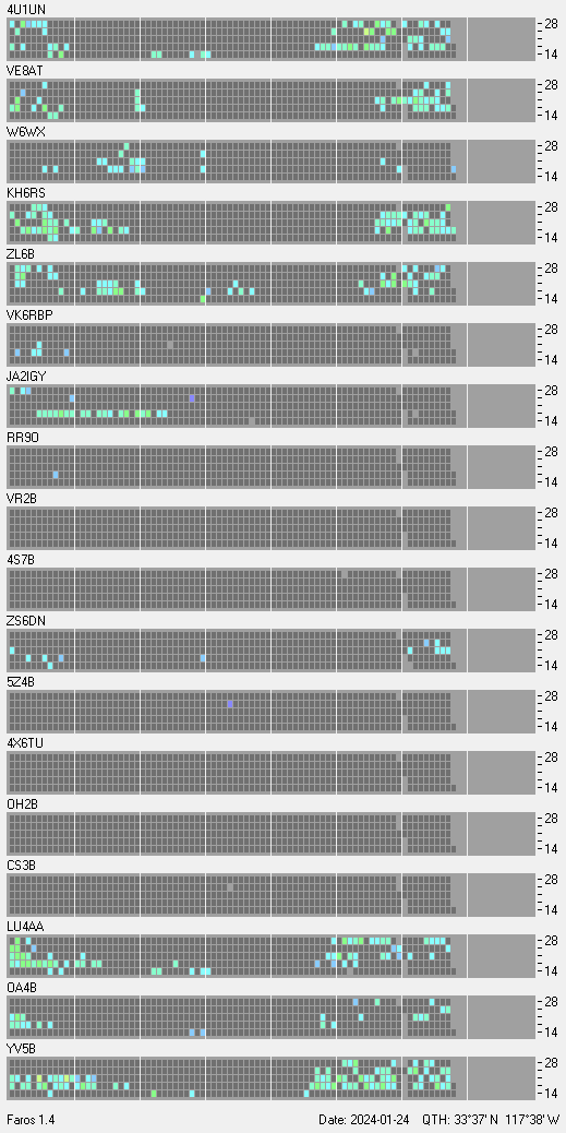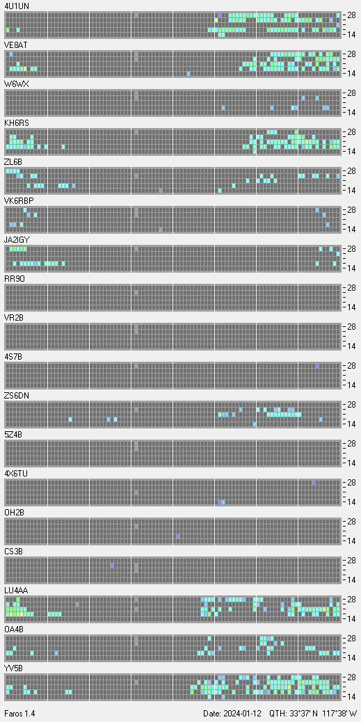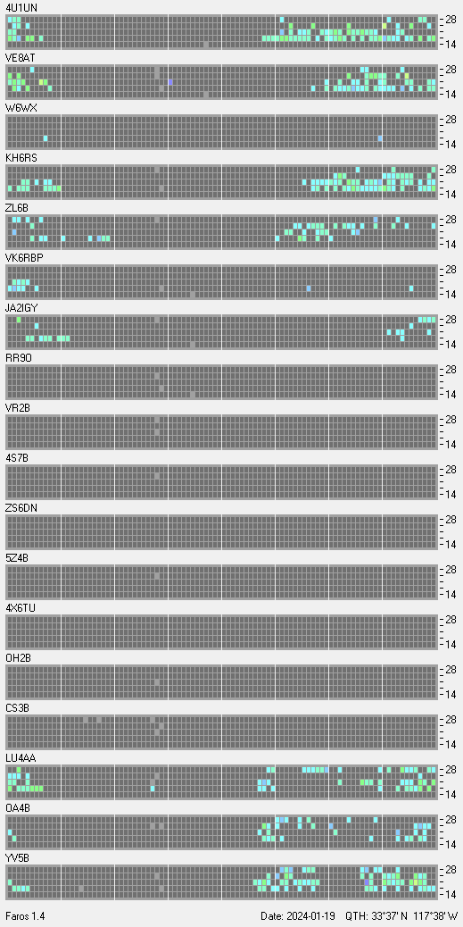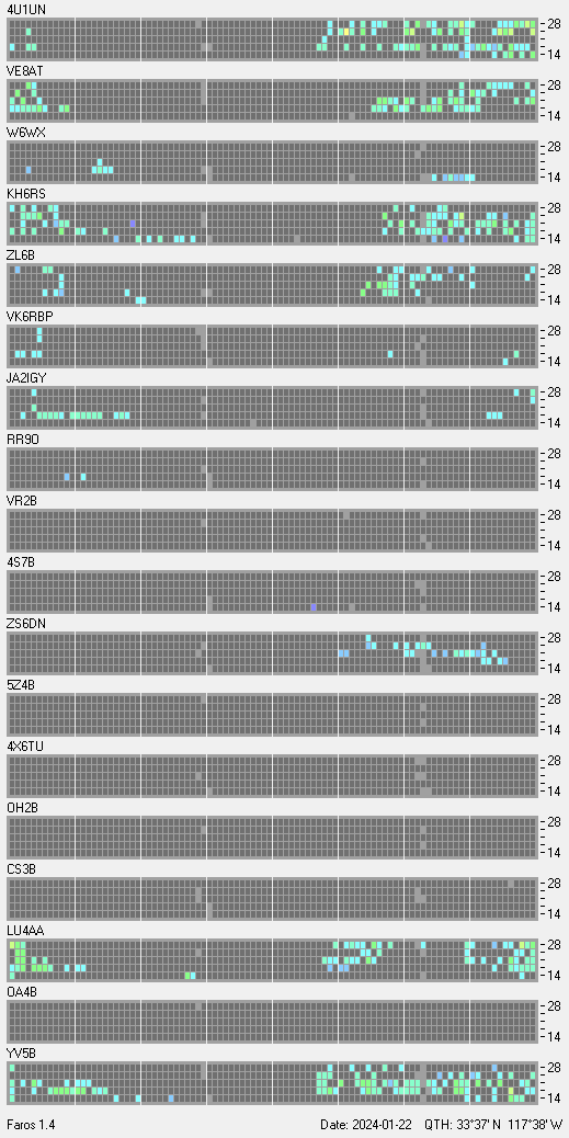 This is a record of NCDXF Beacon received at W6SI station using FAROS 1.4 monitor software. There are 18 beacons throughout the world, it records each ham band between 20m to 10m bands, including WARC bands. Each row on the given beacon block represents the band, 20, 17, 15, 12 and 10 meters, from the bottom to the top. The chart shows the relative signal strength (S/N ratio) of the received beacon. |