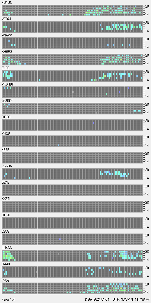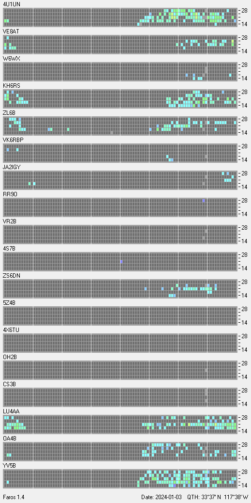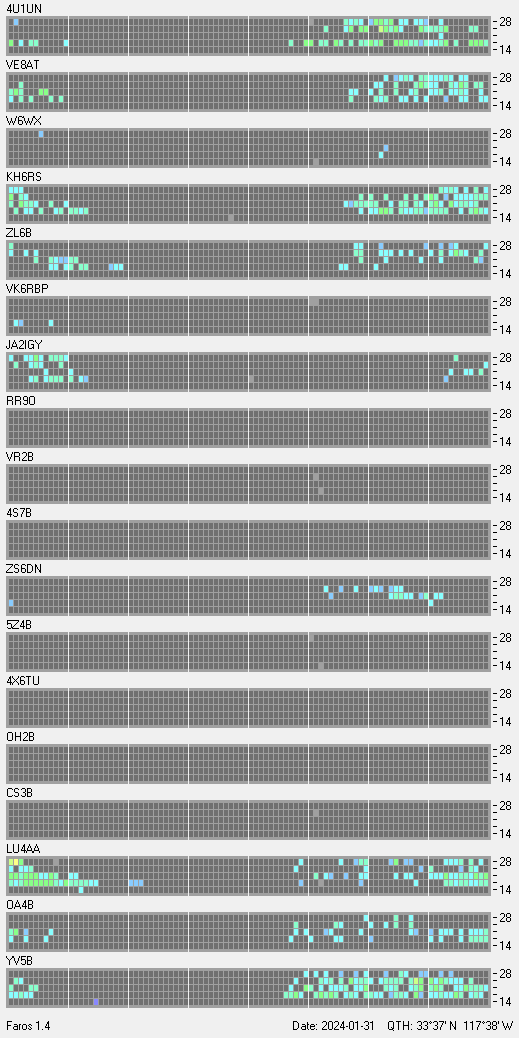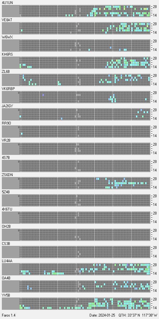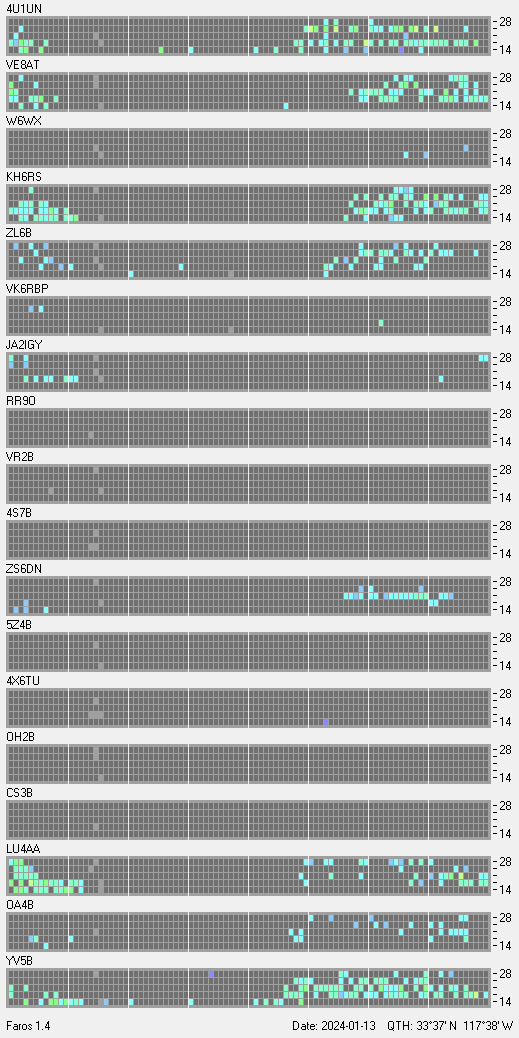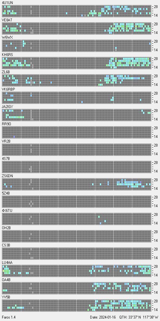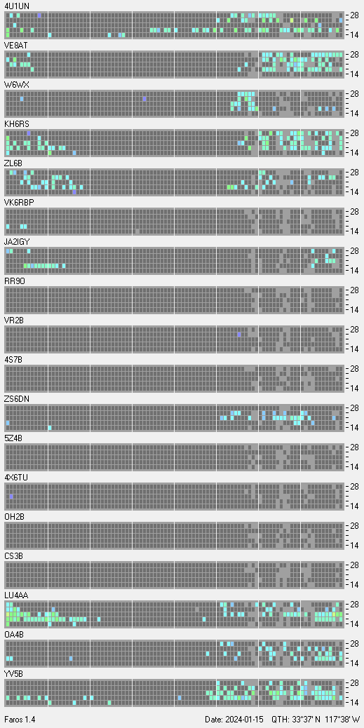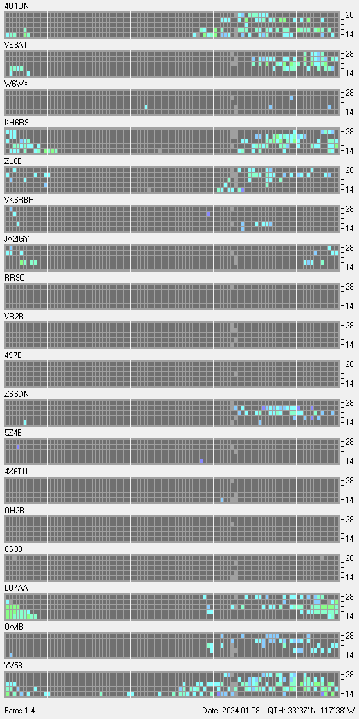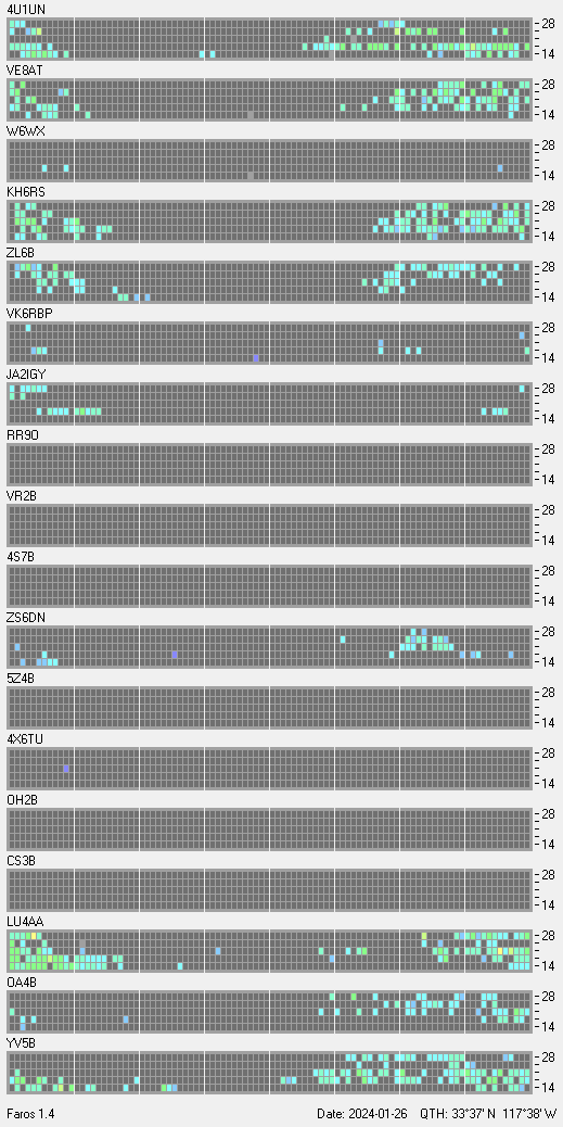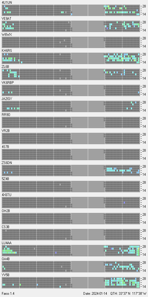 This is a record of NCDXF Beacon received at W6SI station using FAROS 1.4 monitor software. There are 18 beacons throughout the world, it records each ham band between 20m to 10m bands, including WARC bands. Each row on the given beacon block represents the band, 20, 17, 15, 12 and 10 meters, from the bottom to the top. The chart shows the relative signal strength (S/N ratio) of the received beacon. |