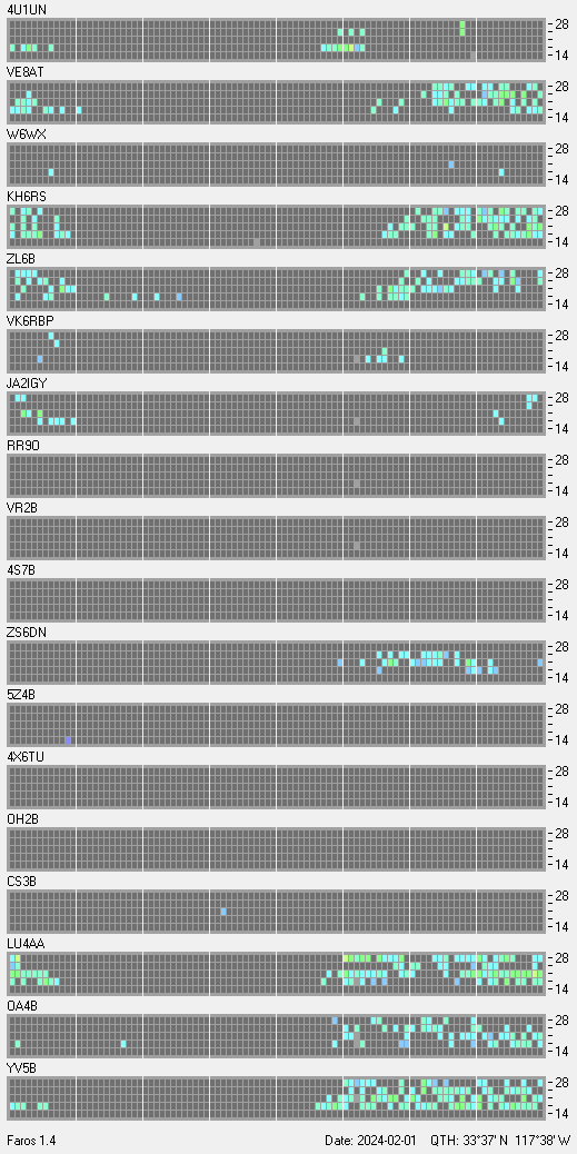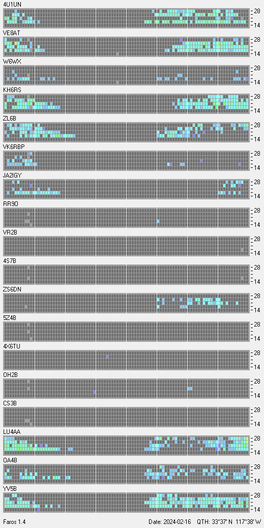 This is a record of NCDXF Beacon received at W6SI station using FAROS 1.4 monitor software. There are 18 beacons throughout the world, it records each ham band between 20m to 10m bands, including WARC bands. Each row on the given beacon block represents the band, 20, 17, 15, 12 and 10 meters, from the bottom to the top. The chart shows the relative signal strength (S/N ratio) of the received beacon. |