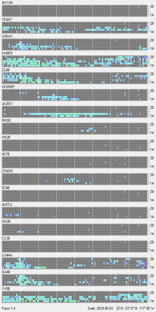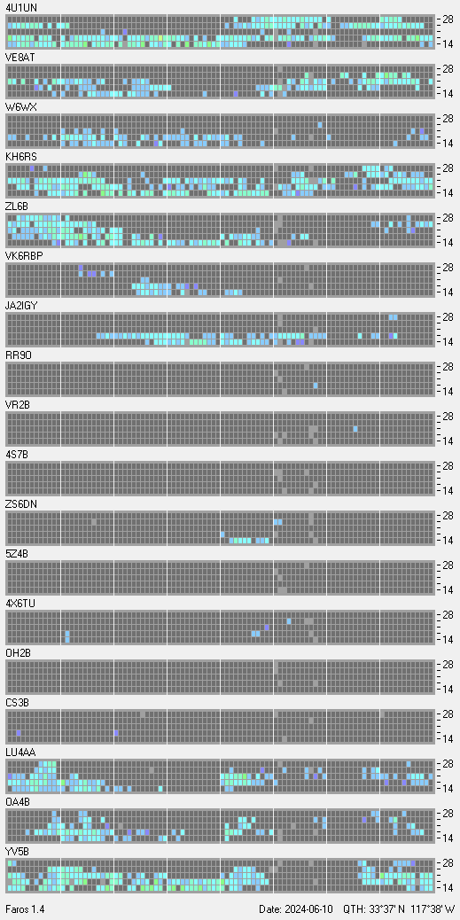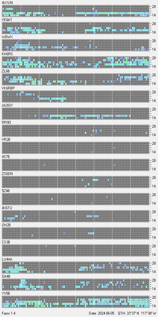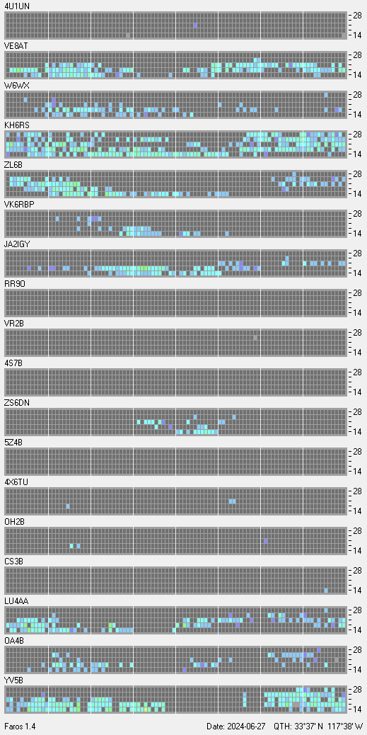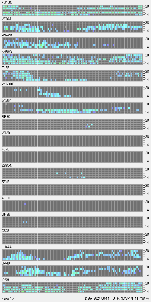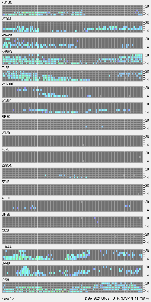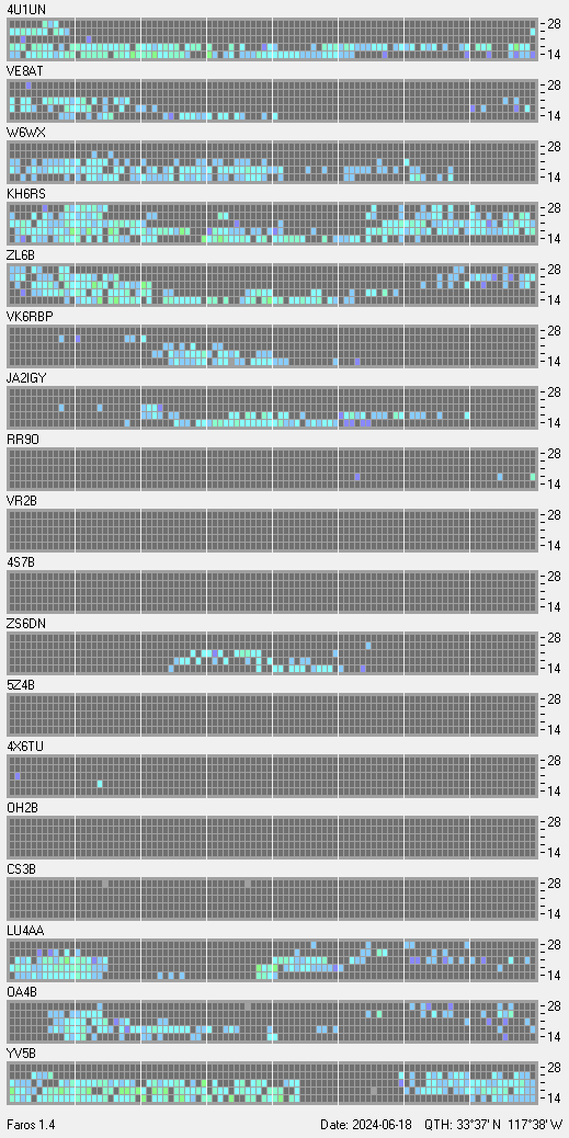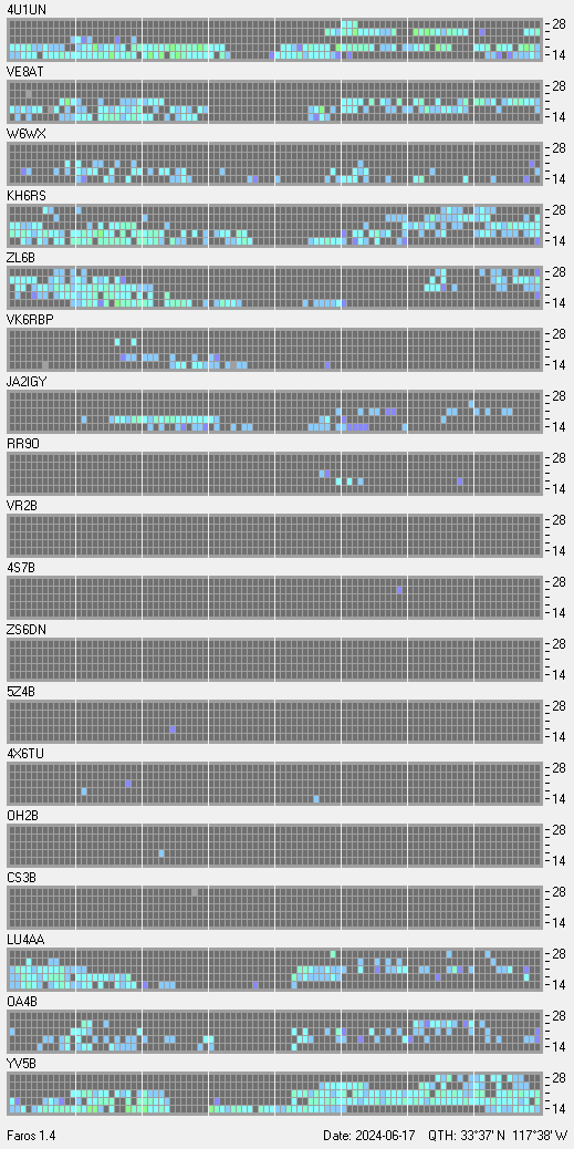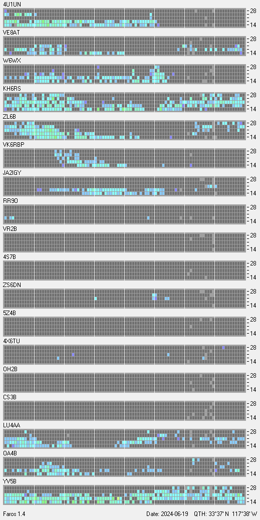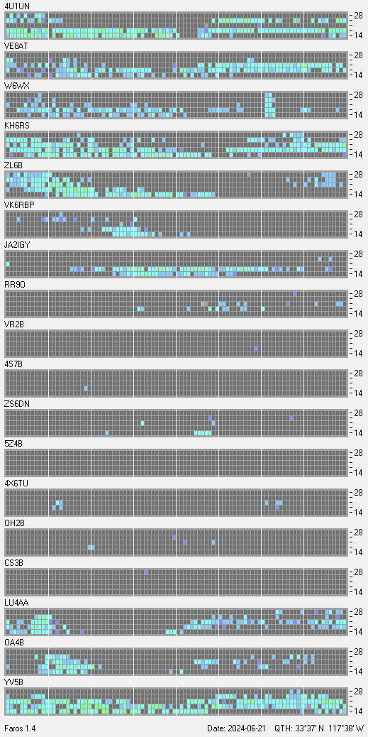 This is a record of NCDXF Beacon received at W6SI station using FAROS 1.4 monitor software. There are 18 beacons throughout the world, it records each ham band between 20m to 10m bands, including WARC bands. Each row on the given beacon block represents the band, 20, 17, 15, 12 and 10 meters, from the bottom to the top. The chart shows the relative signal strength (S/N ratio) of the received beacon. |