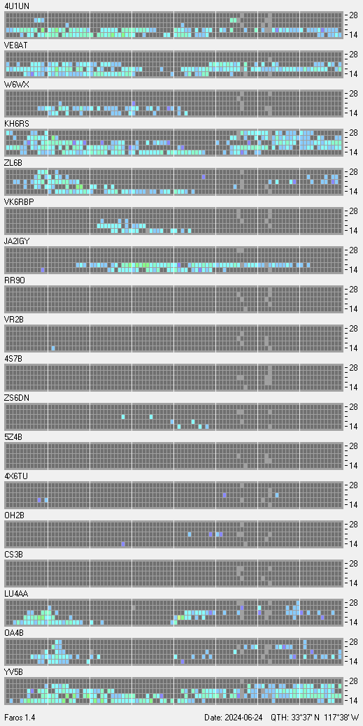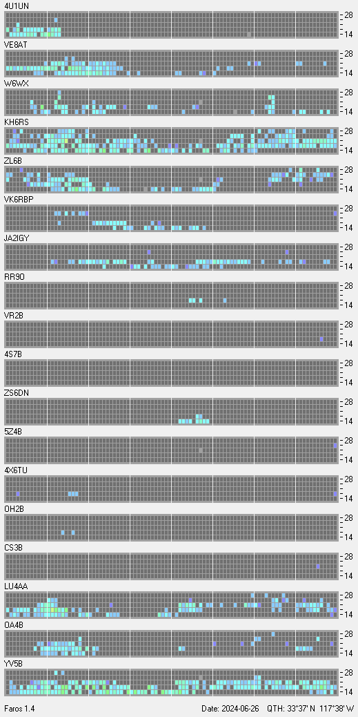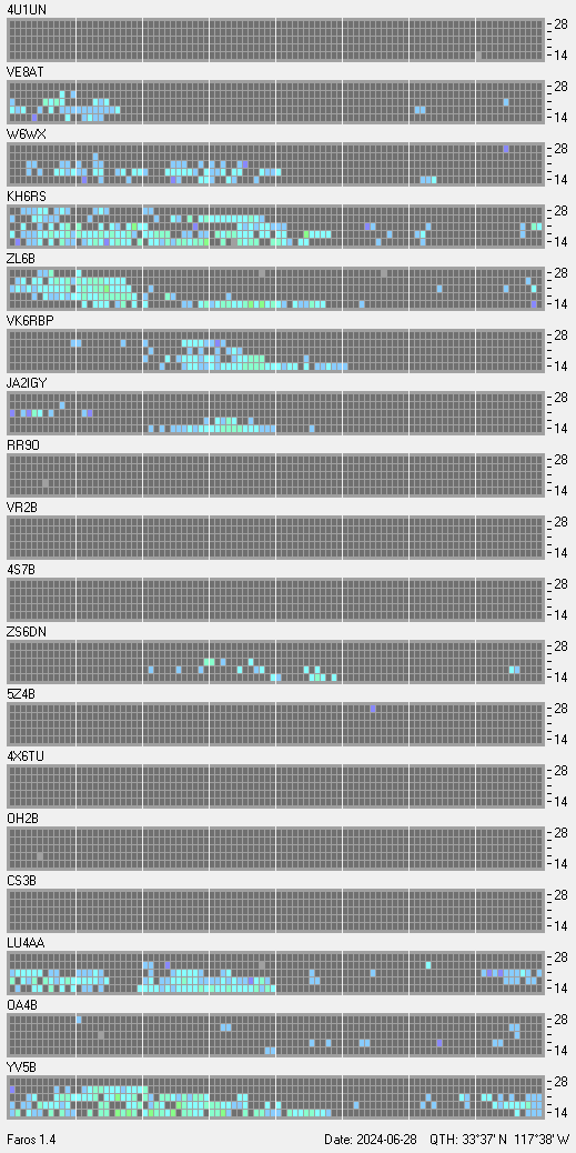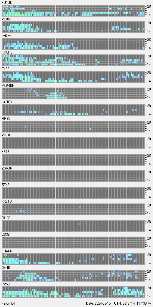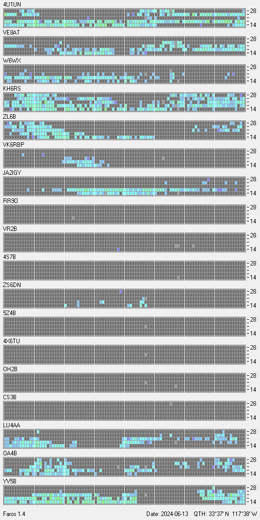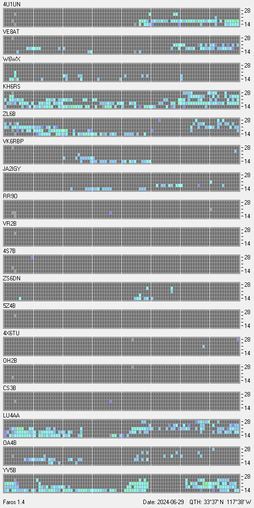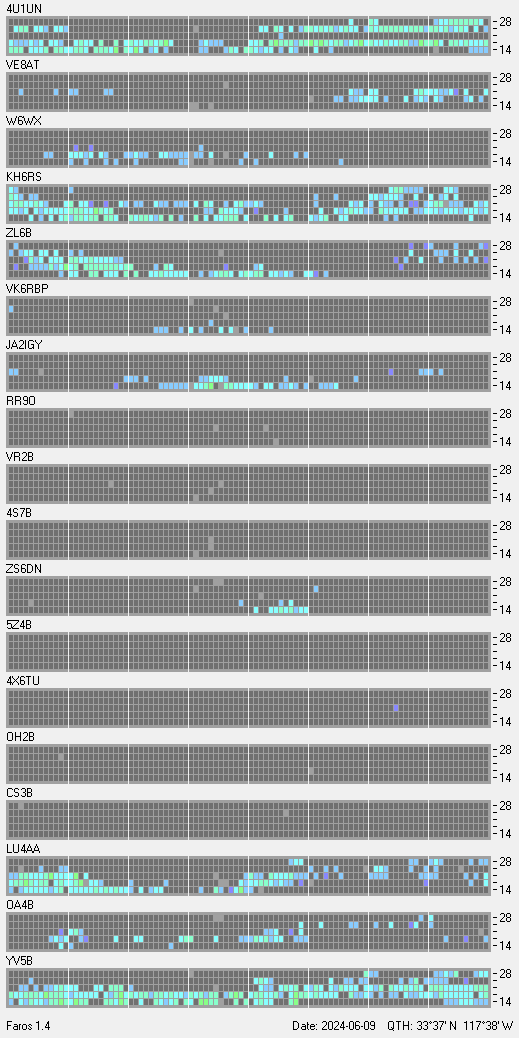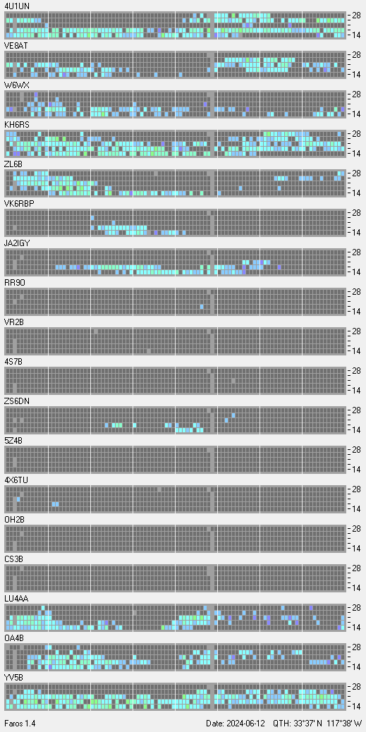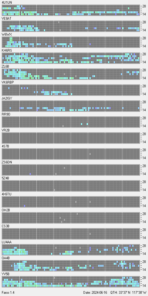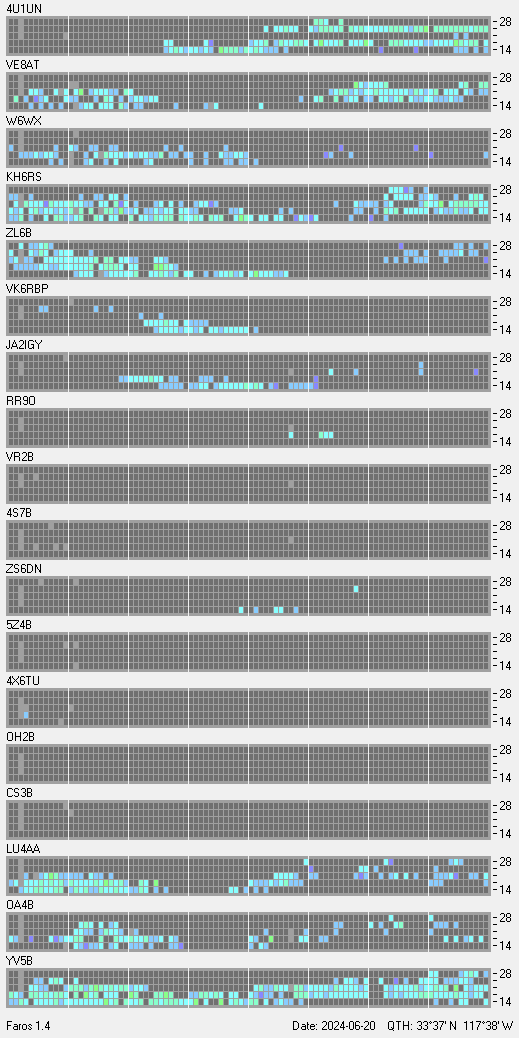 This is a record of NCDXF Beacon received at W6SI station using FAROS 1.4 monitor software. There are 18 beacons throughout the world, it records each ham band between 20m to 10m bands, including WARC bands. Each row on the given beacon block represents the band, 20, 17, 15, 12 and 10 meters, from the bottom to the top. The chart shows the relative signal strength (S/N ratio) of the received beacon. |