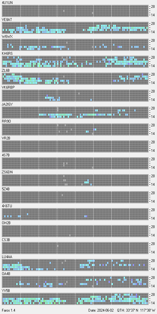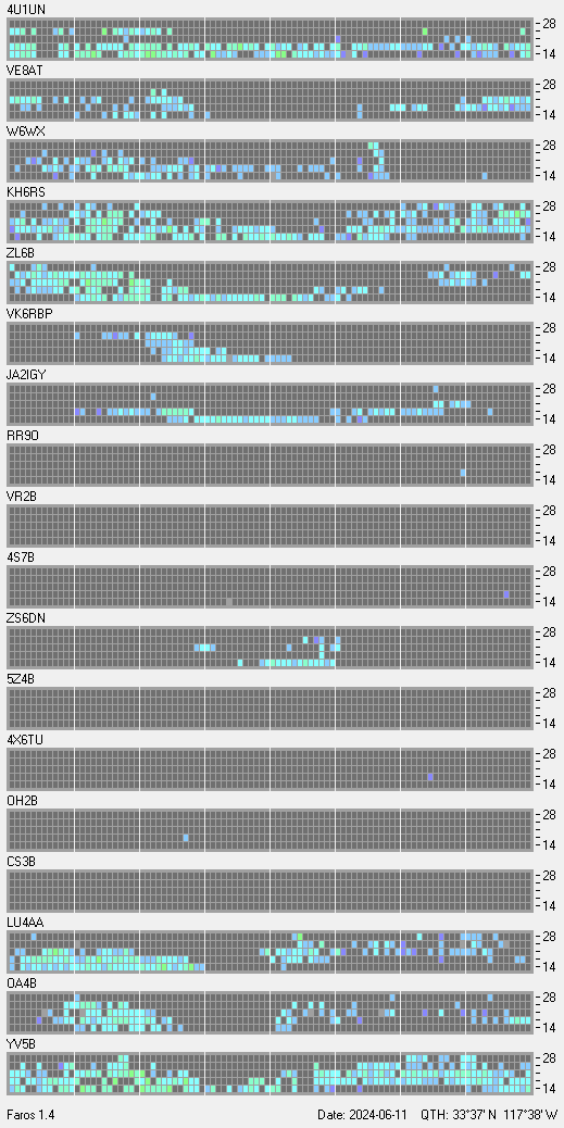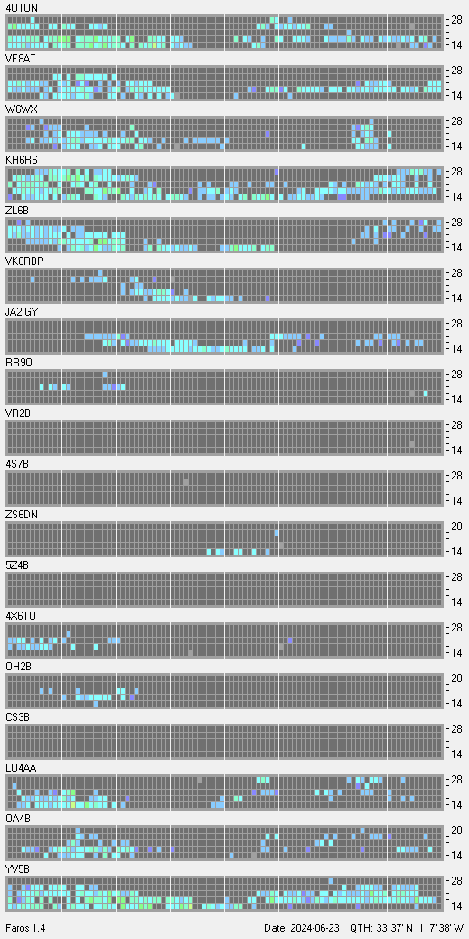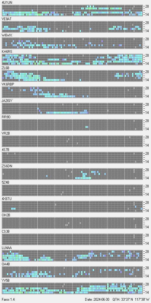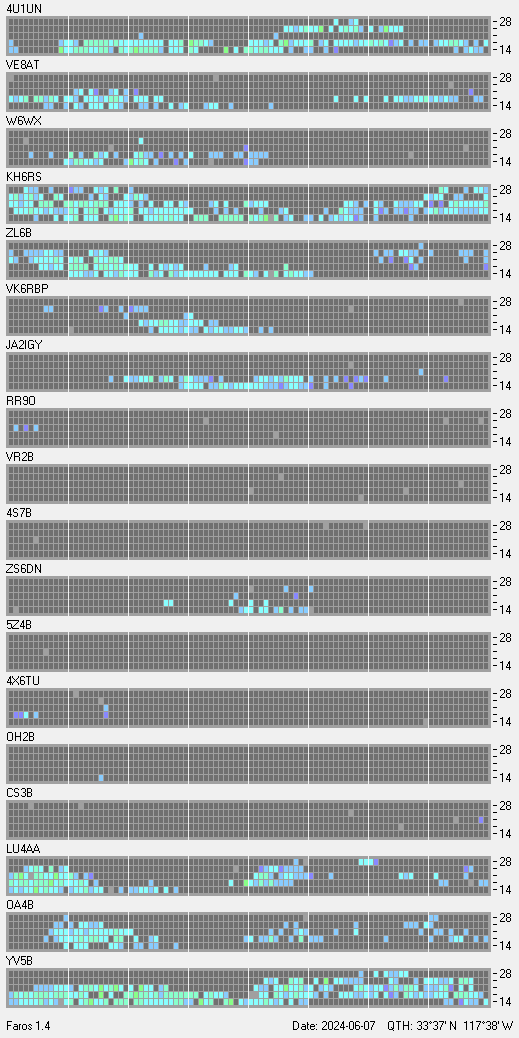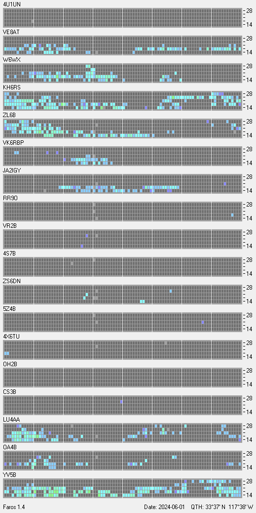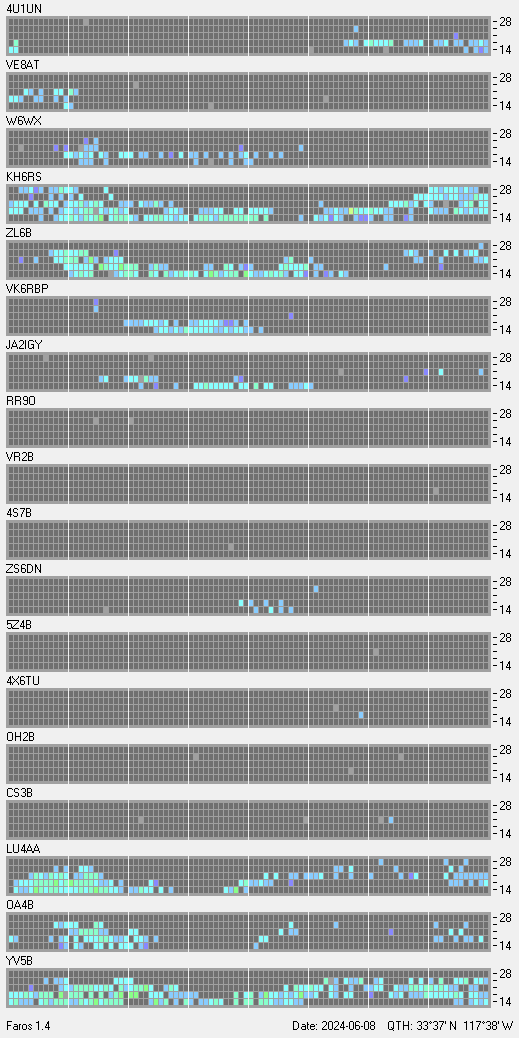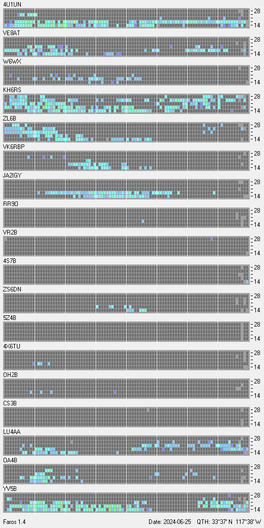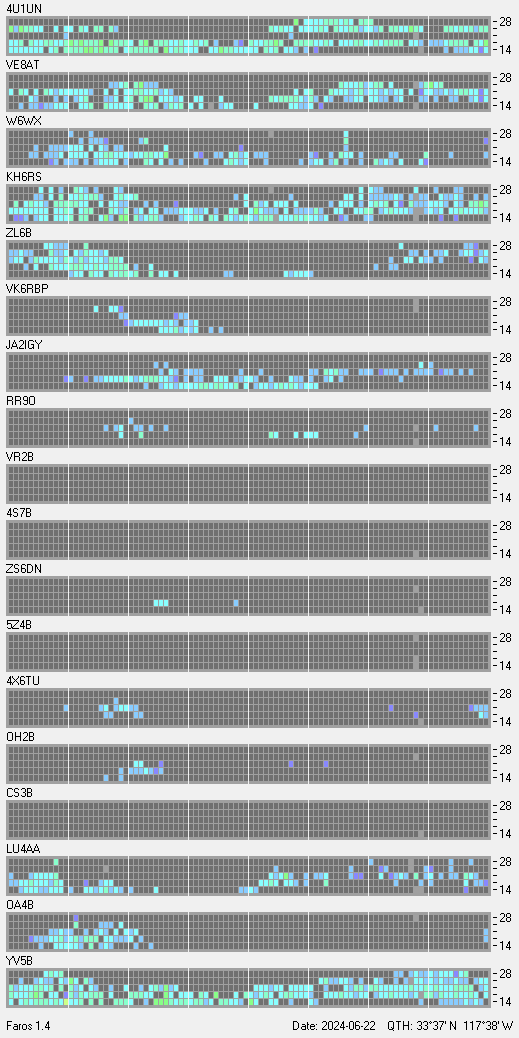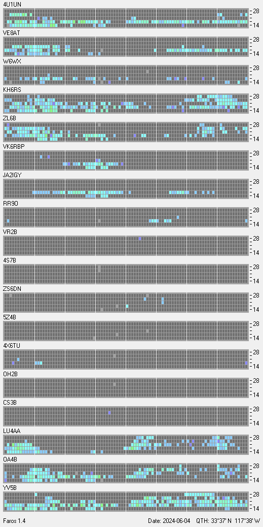 This is a record of NCDXF Beacon received at W6SI station using FAROS 1.4 monitor software. There are 18 beacons throughout the world, it records each ham band between 20m to 10m bands, including WARC bands. Each row on the given beacon block represents the band, 20, 17, 15, 12 and 10 meters, from the bottom to the top. The chart shows the relative signal strength (S/N ratio) of the received beacon. |