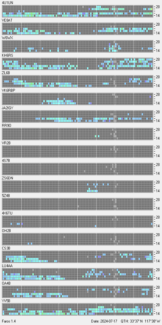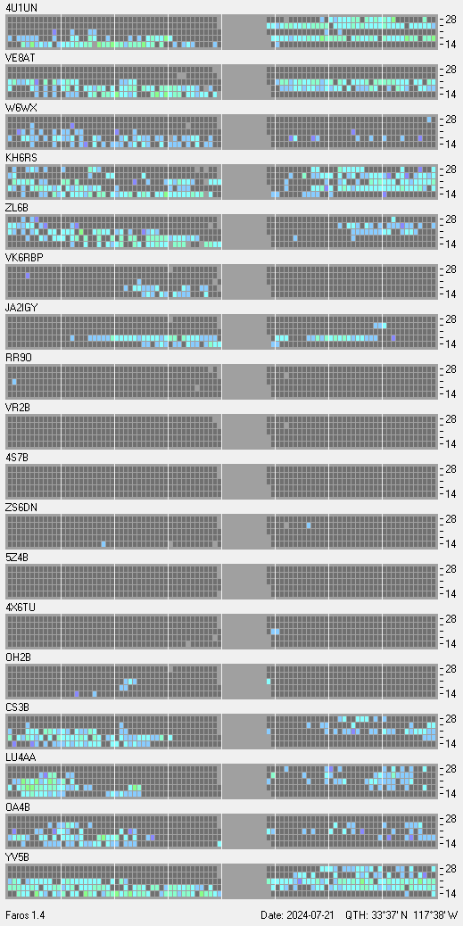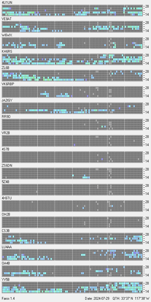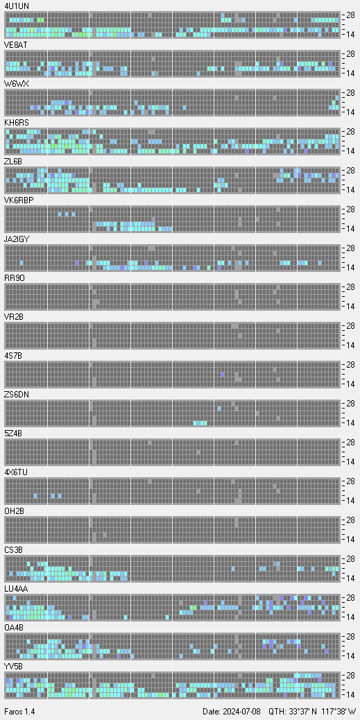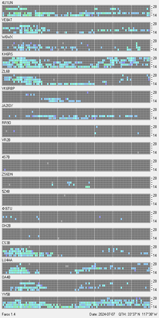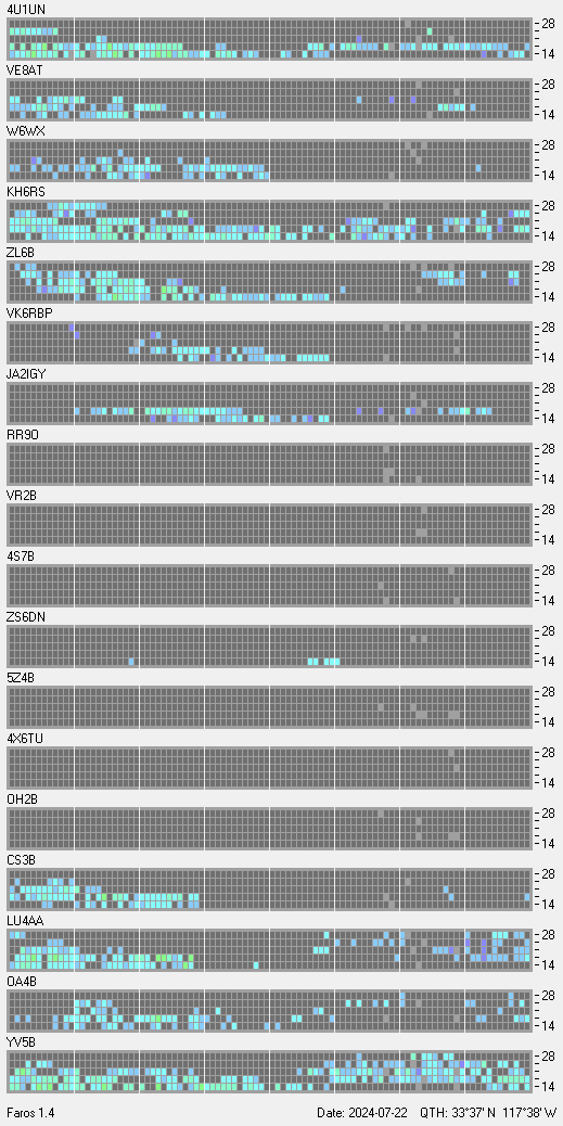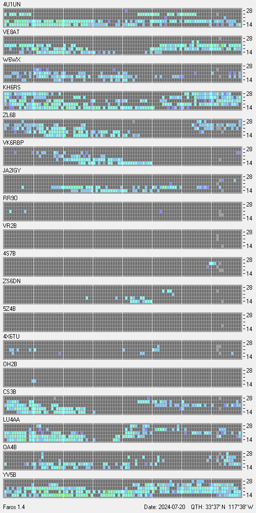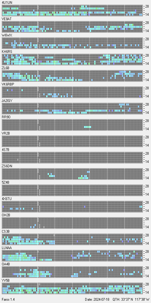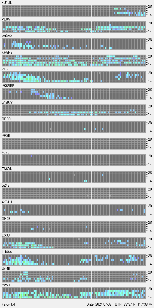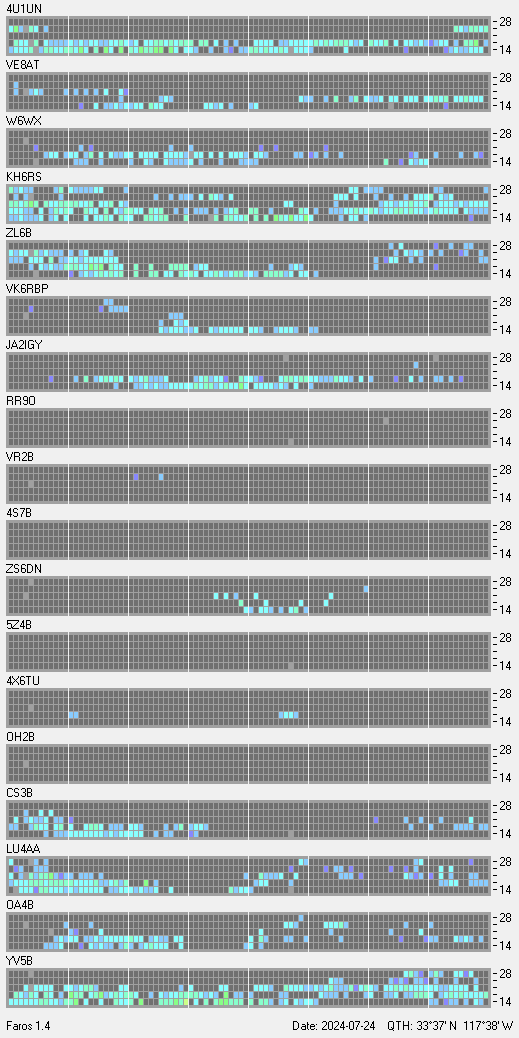 This is a record of NCDXF Beacon received at W6SI station using FAROS 1.4 monitor software. There are 18 beacons throughout the world, it records each ham band between 20m to 10m bands, including WARC bands. Each row on the given beacon block represents the band, 20, 17, 15, 12 and 10 meters, from the bottom to the top. The chart shows the relative signal strength (S/N ratio) of the received beacon. |
