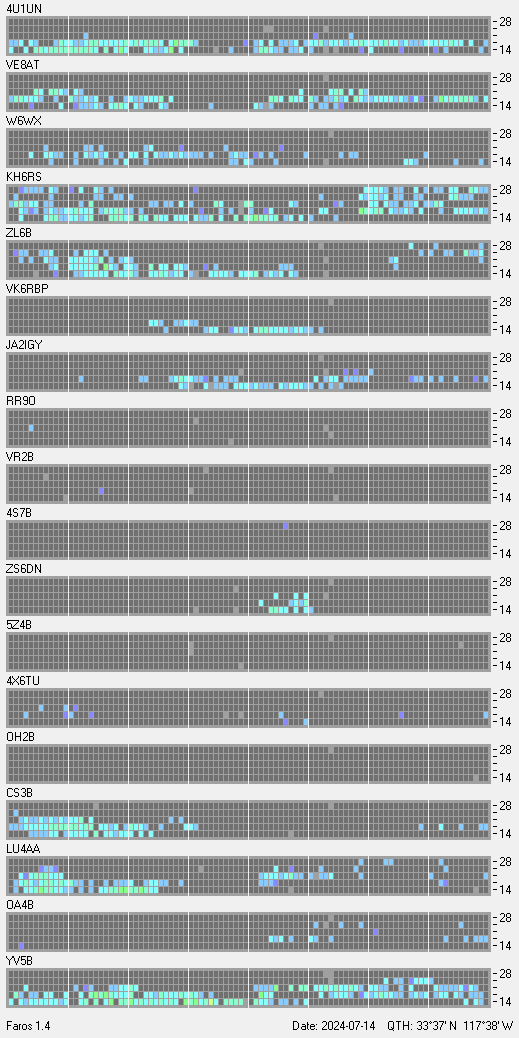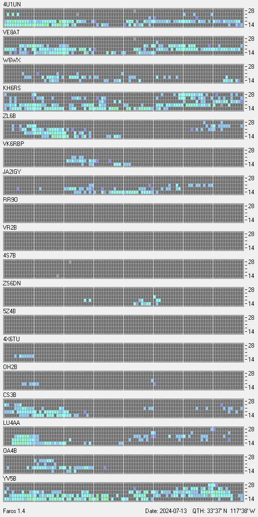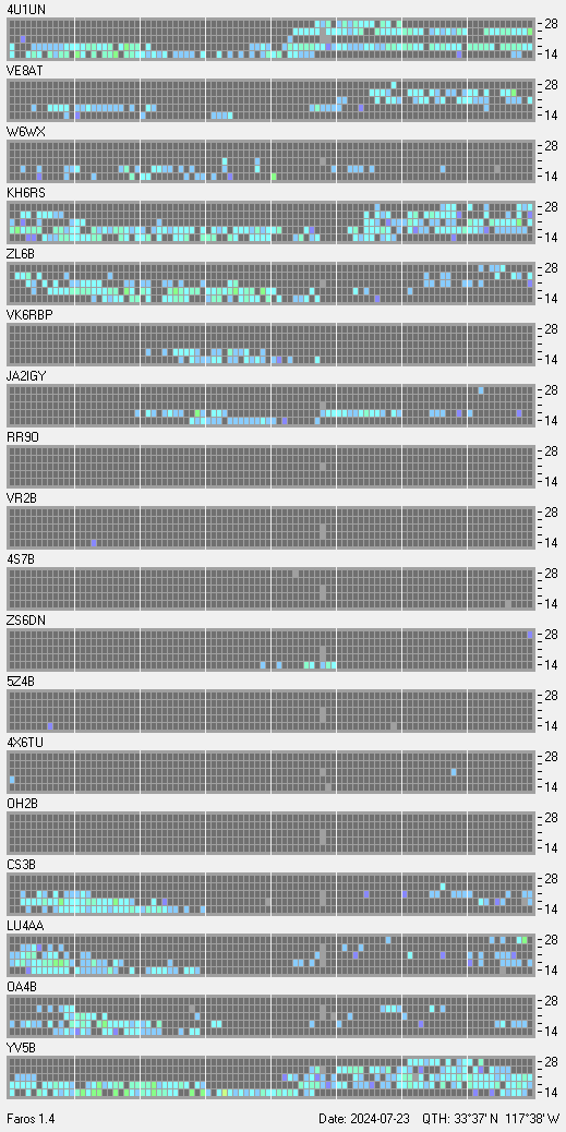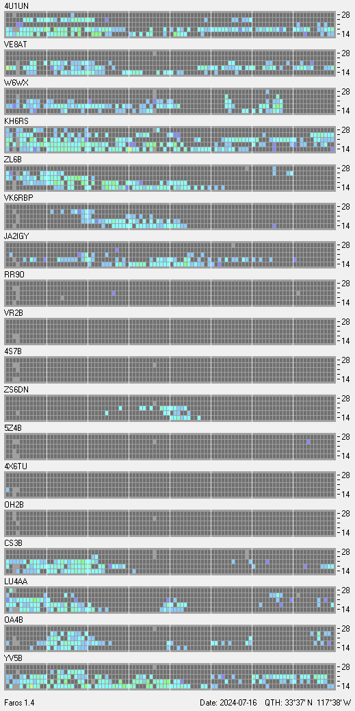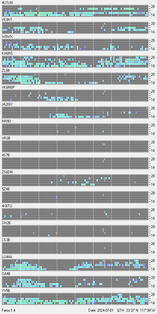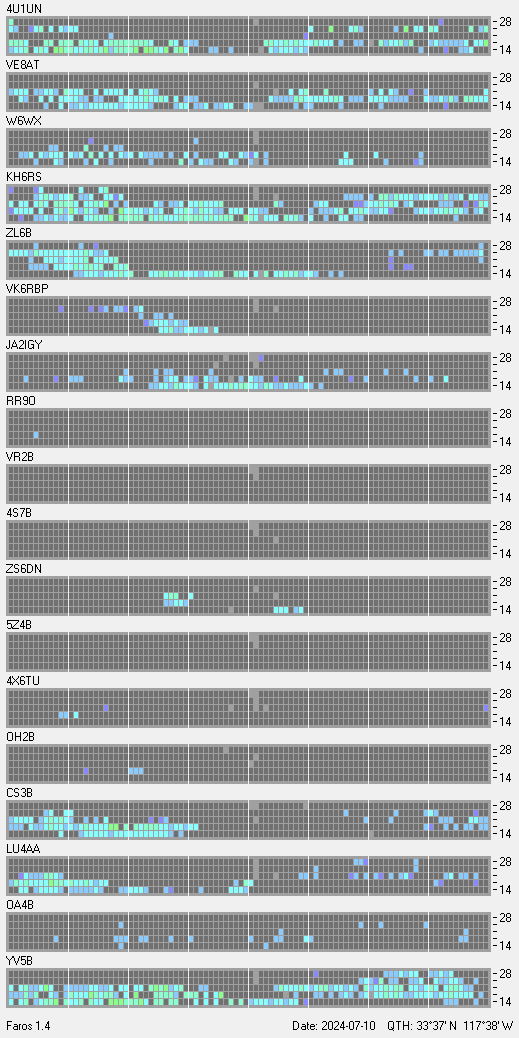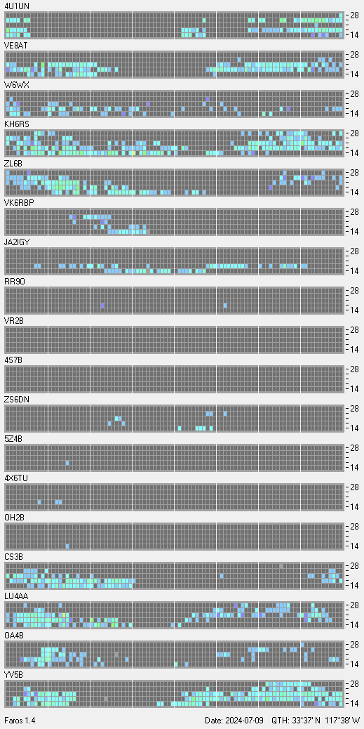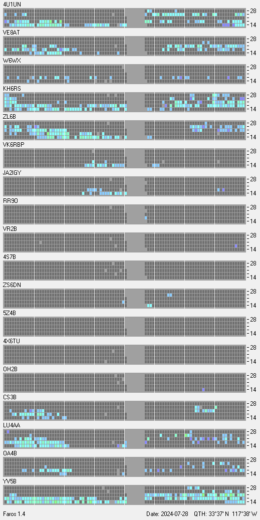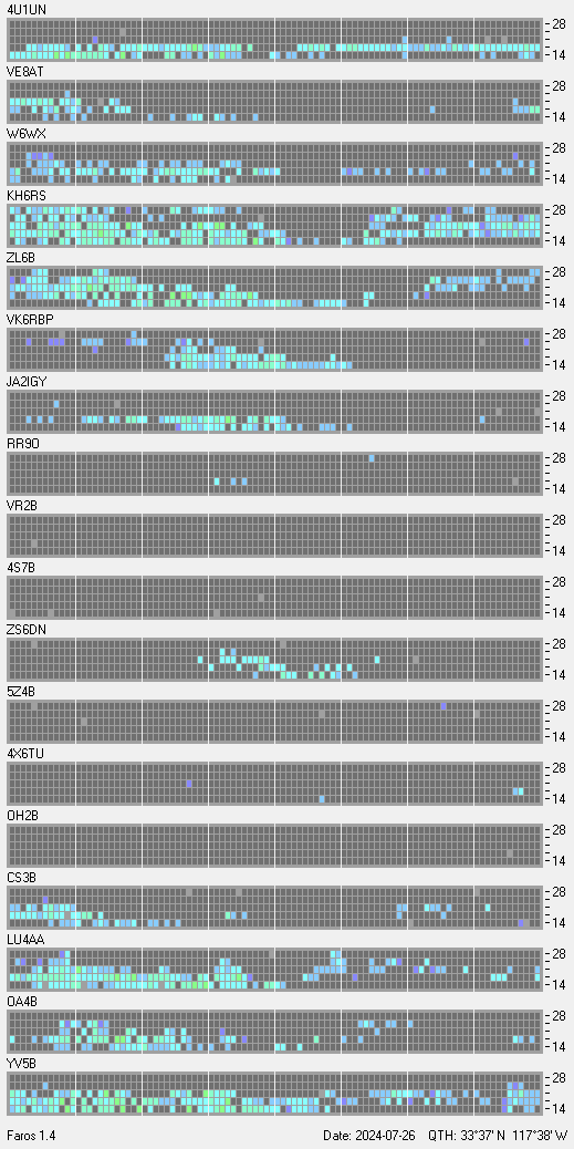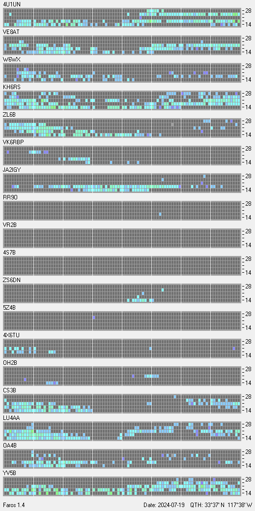 This is a record of NCDXF Beacon received at W6SI station using FAROS 1.4 monitor software. There are 18 beacons throughout the world, it records each ham band between 20m to 10m bands, including WARC bands. Each row on the given beacon block represents the band, 20, 17, 15, 12 and 10 meters, from the bottom to the top. The chart shows the relative signal strength (S/N ratio) of the received beacon. |