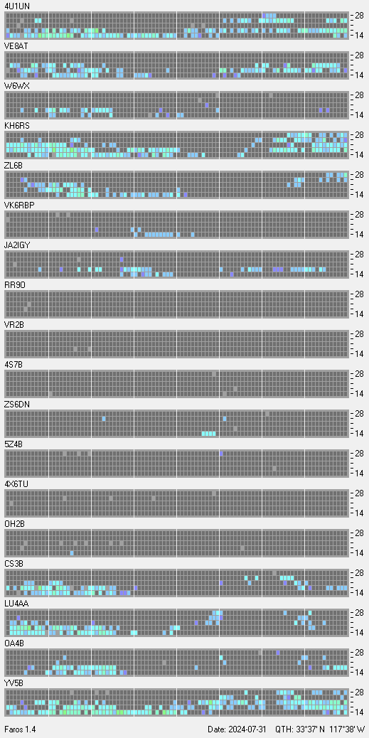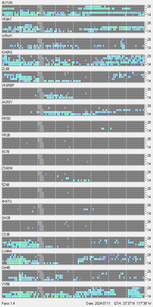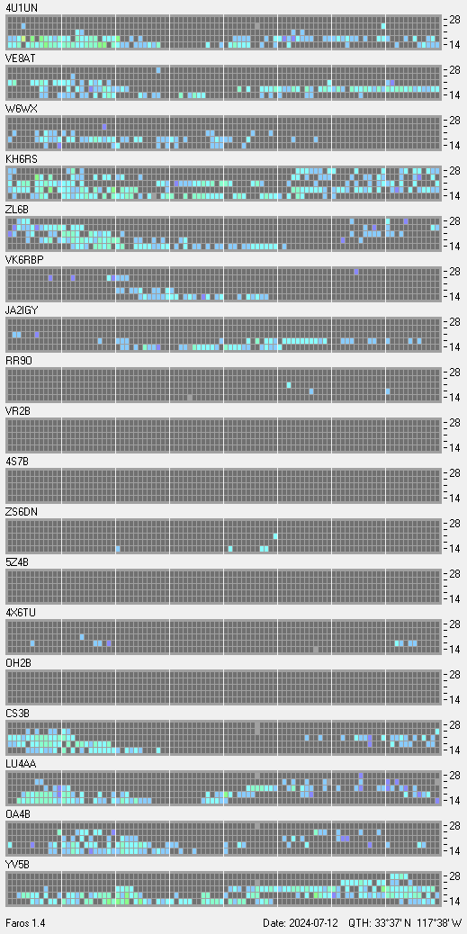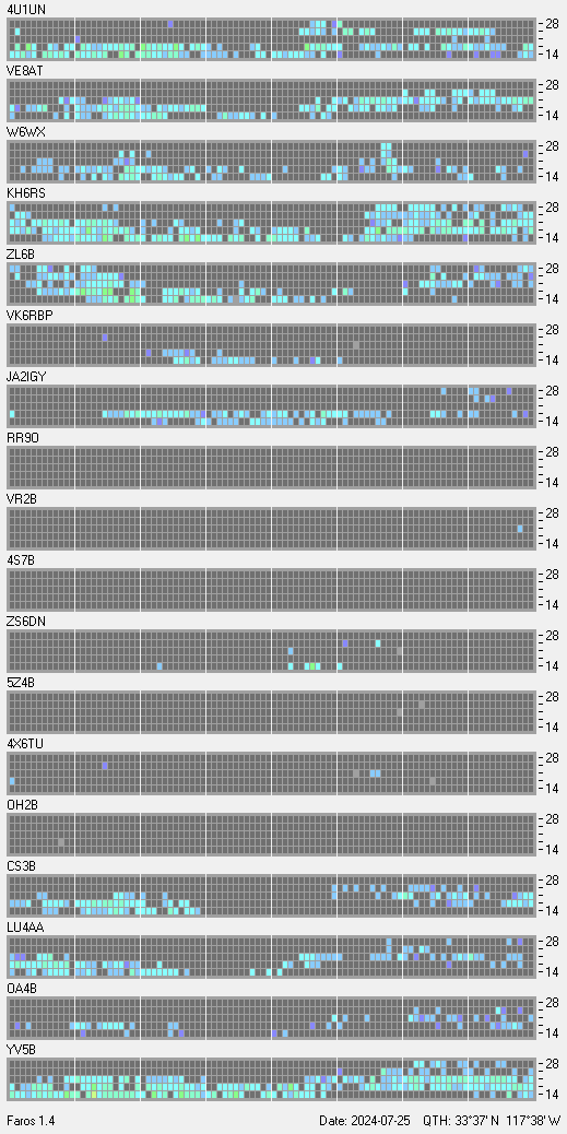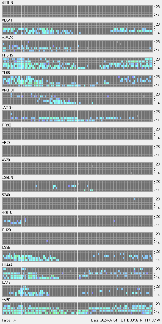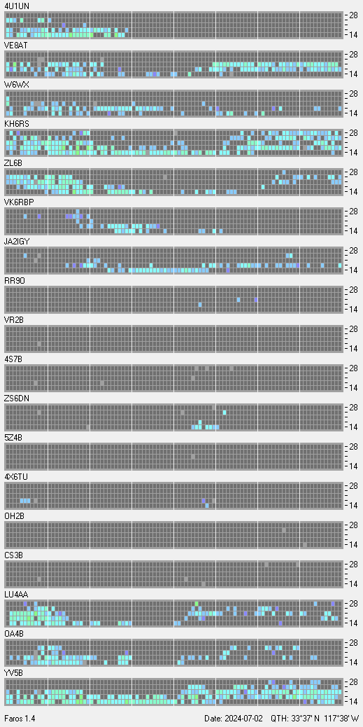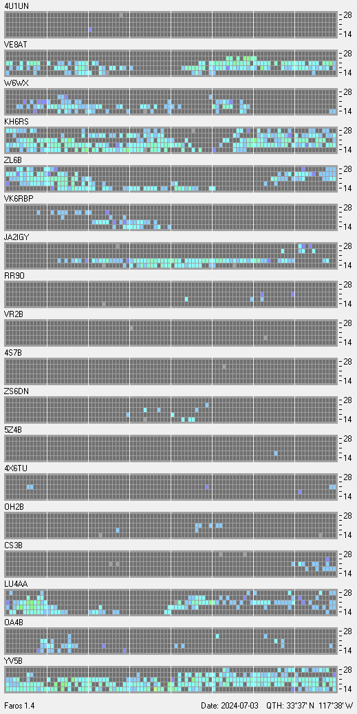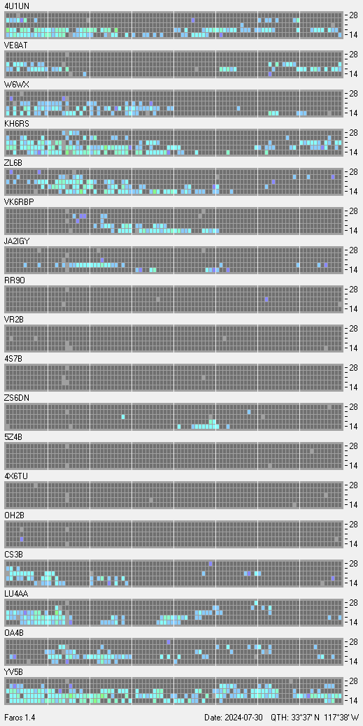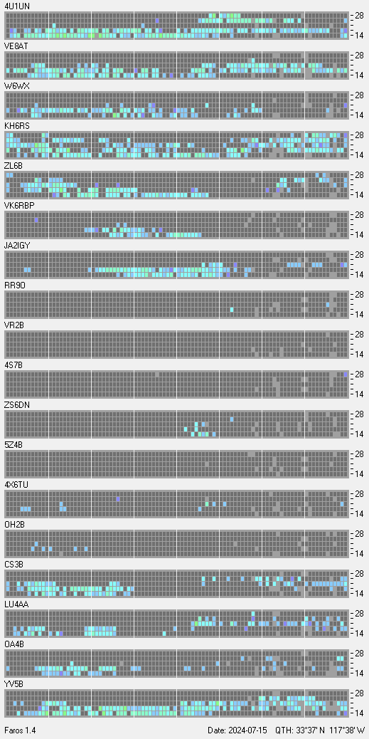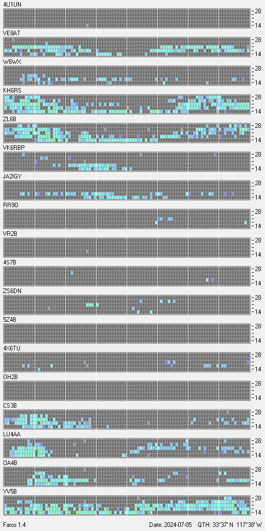 This is a record of NCDXF Beacon received at W6SI station using FAROS 1.4 monitor software. There are 18 beacons throughout the world, it records each ham band between 20m to 10m bands, including WARC bands. Each row on the given beacon block represents the band, 20, 17, 15, 12 and 10 meters, from the bottom to the top. The chart shows the relative signal strength (S/N ratio) of the received beacon. |