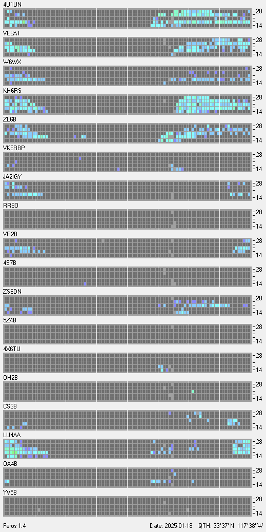 This is a record of NCDXF Beacon received at W6SI station using FAROS 1.4 monitor software. There are 18 beacons throughout the world, it records each ham band between 20m to 10m bands, including WARC bands. Each row on the given beacon block represents the band, 20, 17, 15, 12 and 10 meters, from the bottom to the top. The chart shows the relative signal strength (S/N ratio) of the received beacon. |