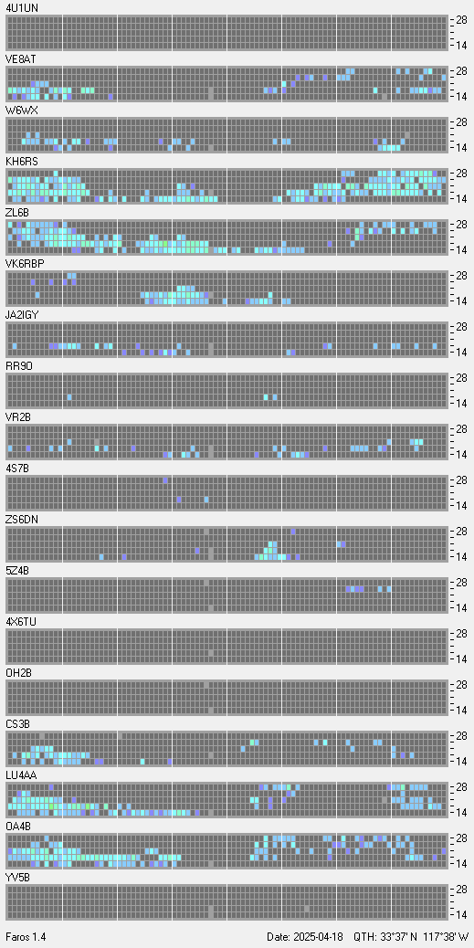 This is a record of NCDXF Beacon received at W6SI station using FAROS 1.4 monitor software. There are 18 beacons throughout the world, it records each ham band between 20m to 10m bands, including WARC bands. Each row on the given beacon block represents the band, 20, 17, 15, 12 and 10 meters, from the bottom to the top. The chart shows the relative signal strength (S/N ratio) of the received beacon. |