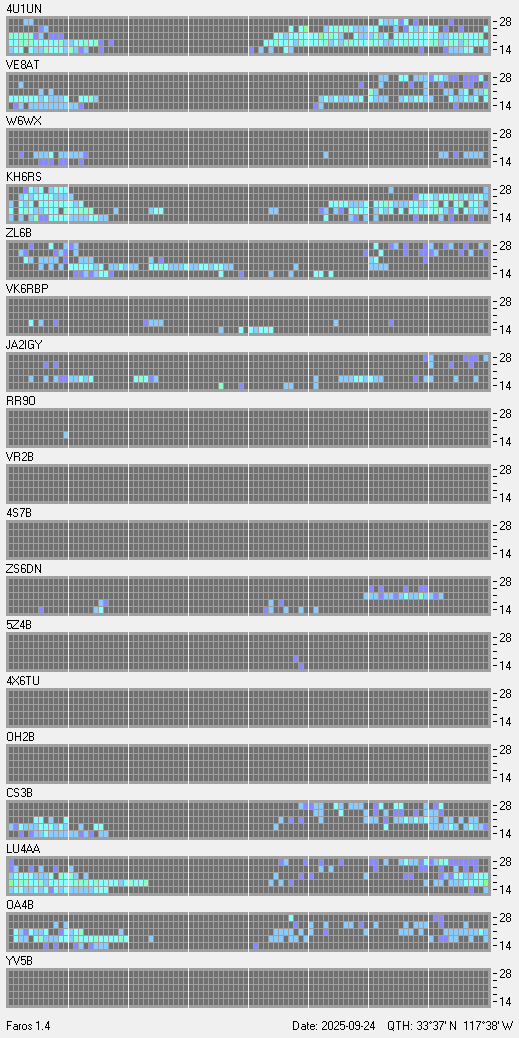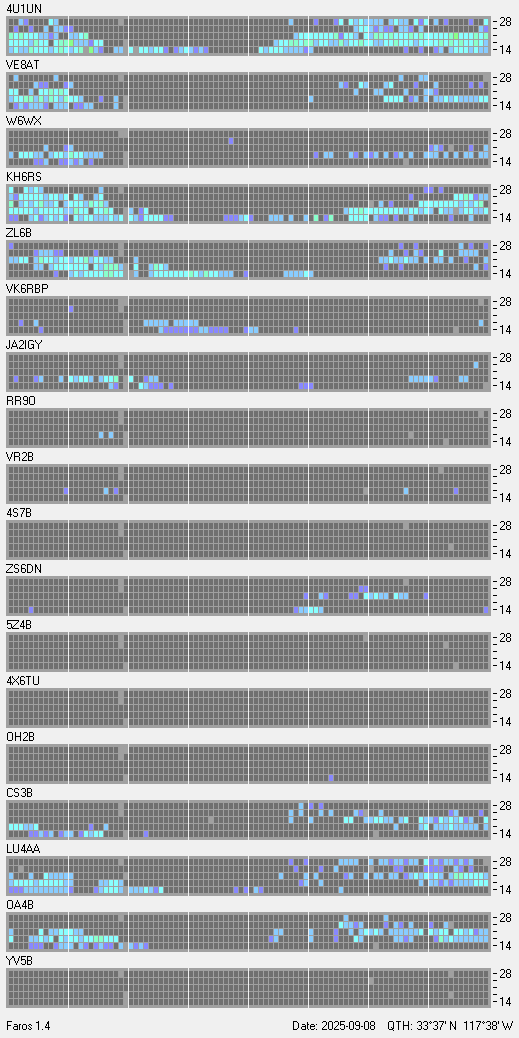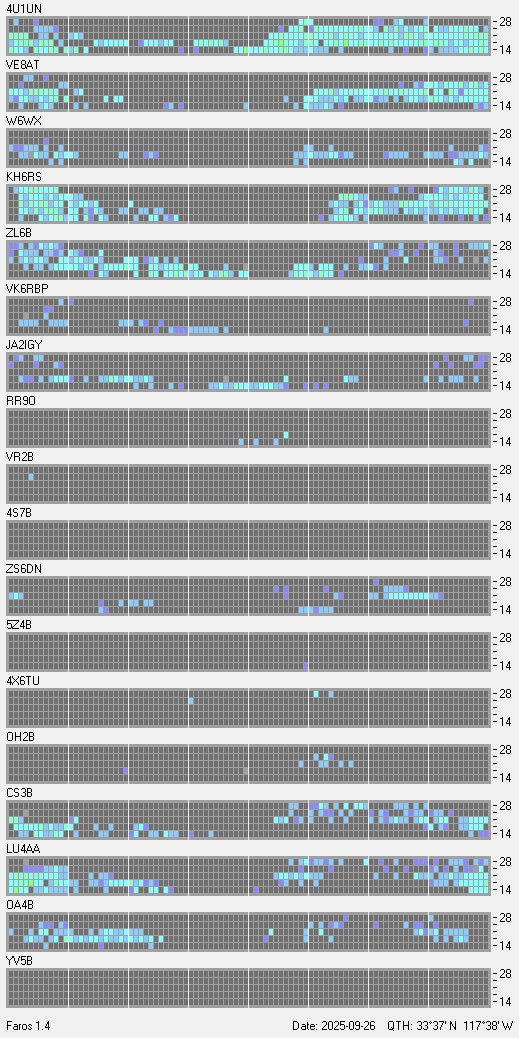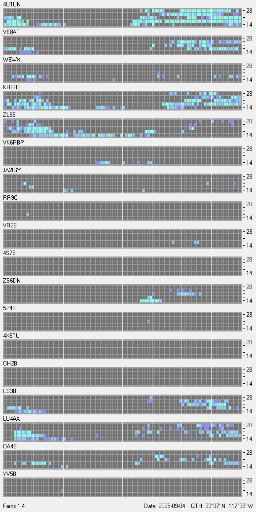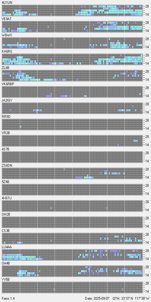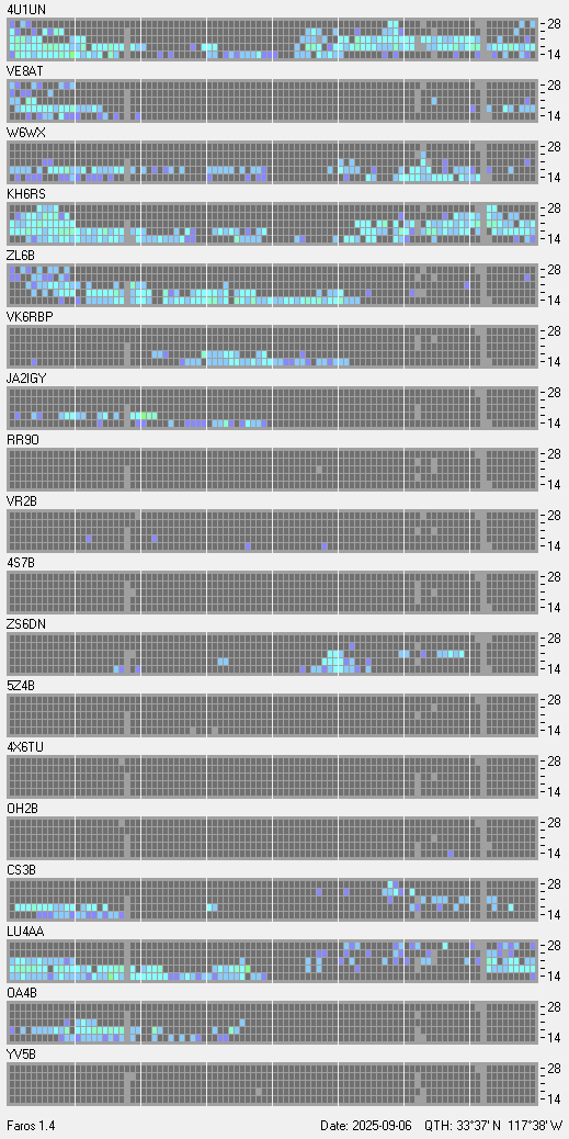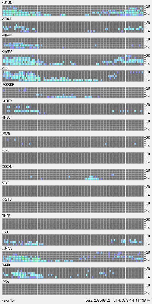 This is a record of NCDXF Beacon received at W6SI station using FAROS 1.4 monitor software. There are 18 beacons throughout the world, it records each ham band between 20m to 10m bands, including WARC bands. Each row on the given beacon block represents the band, 20, 17, 15, 12 and 10 meters, from the bottom to the top. The chart shows the relative signal strength (S/N ratio) of the received beacon. |