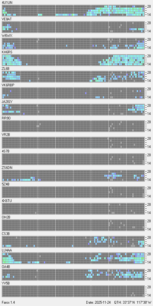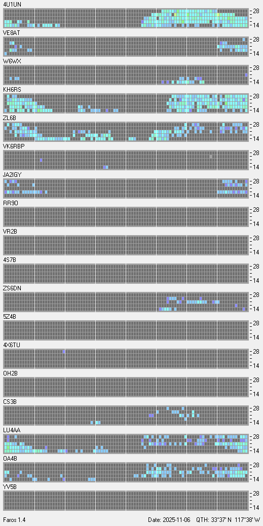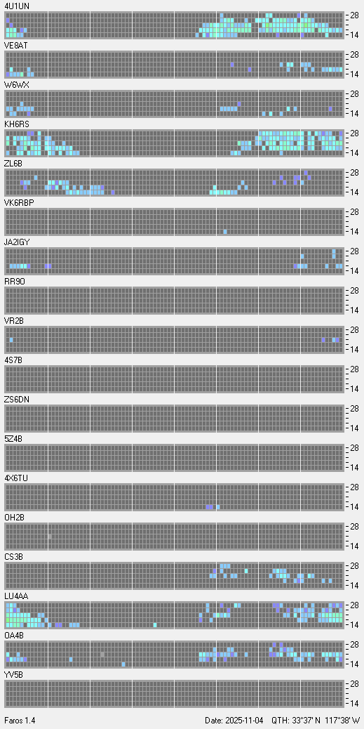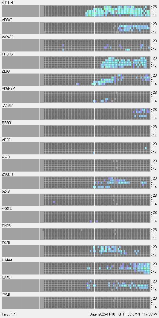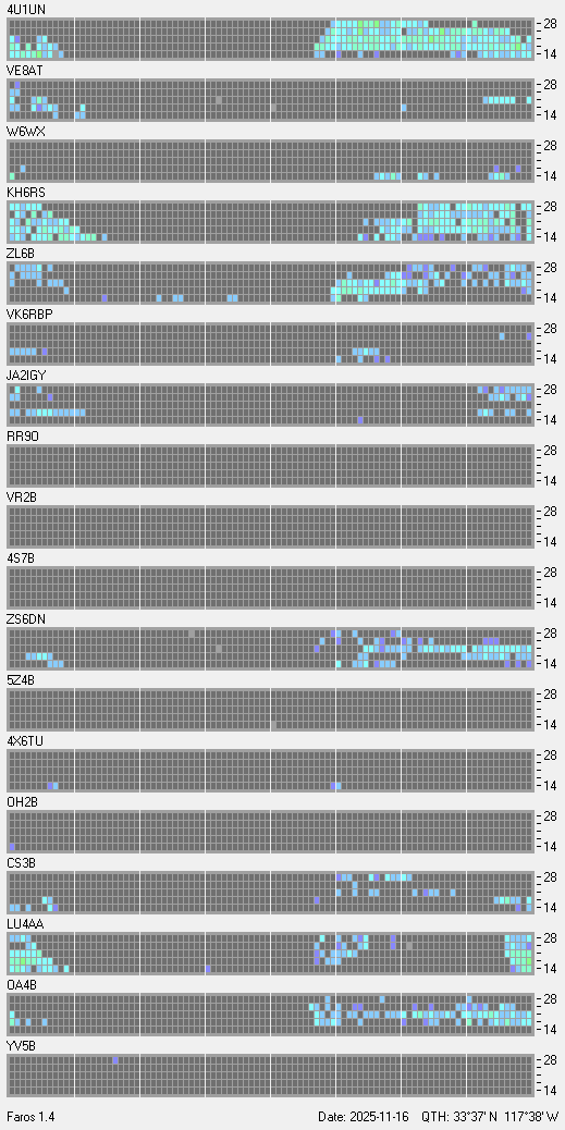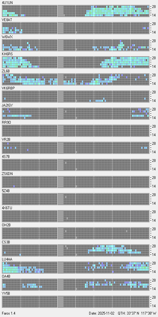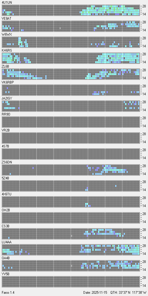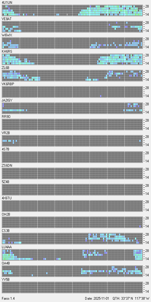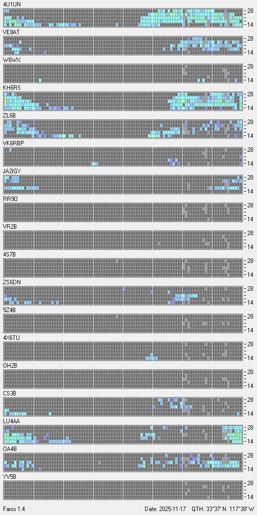 This is a record of NCDXF Beacon received at W6SI station using FAROS 1.4 monitor software. There are 18 beacons throughout the world, it records each ham band between 20m to 10m bands, including WARC bands. Each row on the given beacon block represents the band, 20, 17, 15, 12 and 10 meters, from the bottom to the top. The chart shows the relative signal strength (S/N ratio) of the received beacon. |