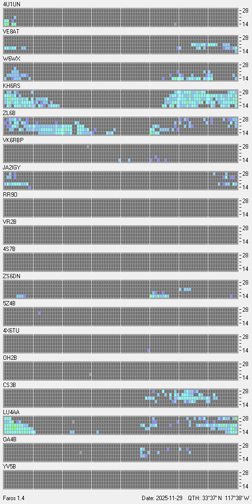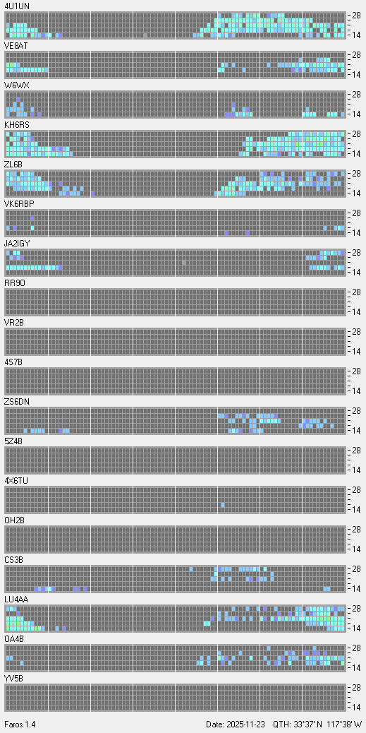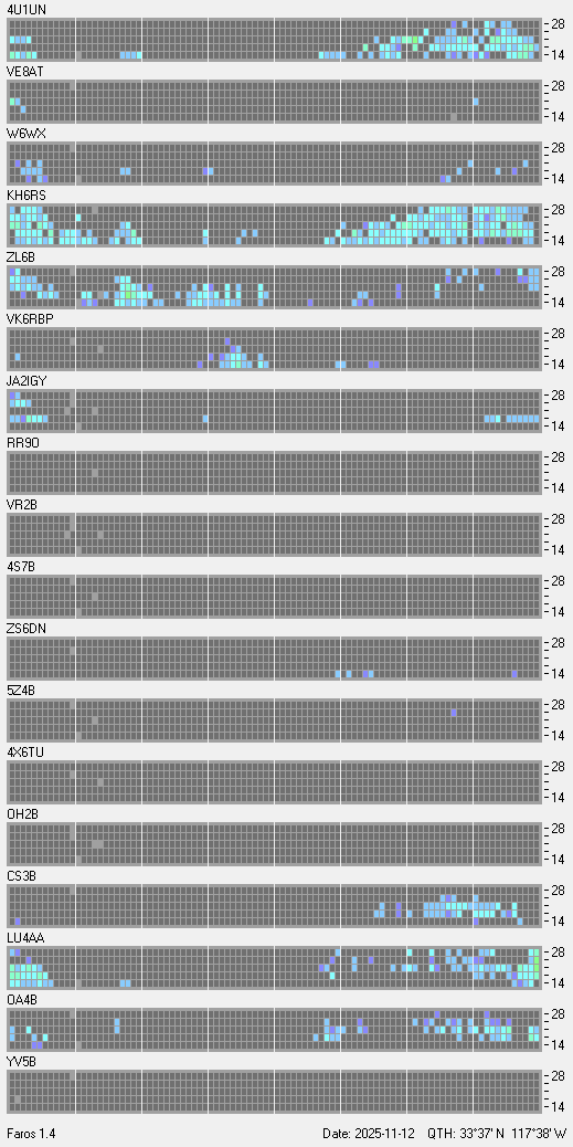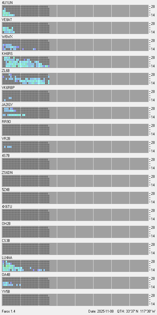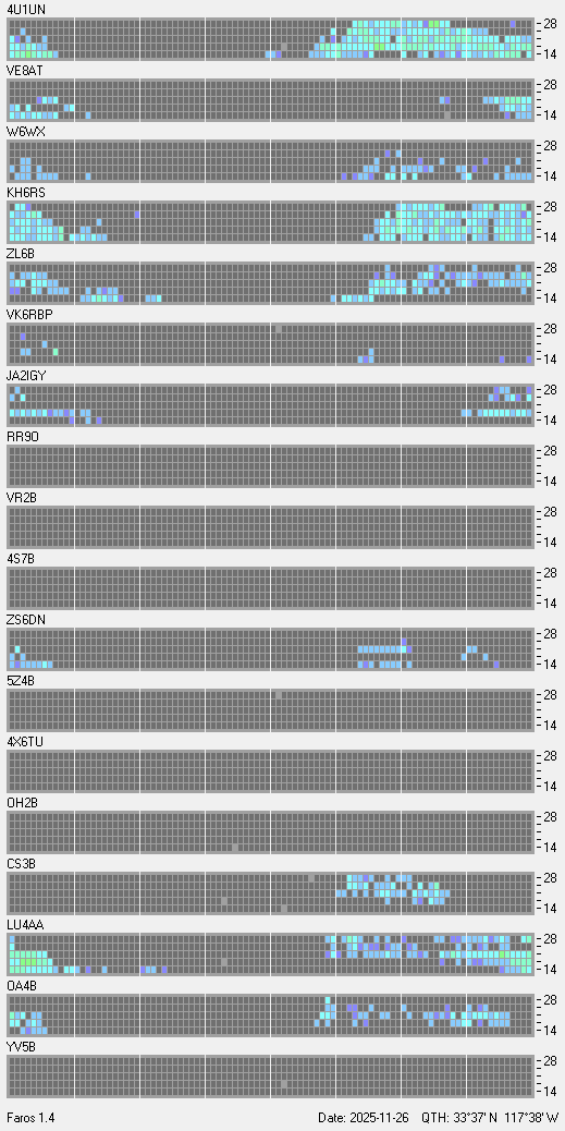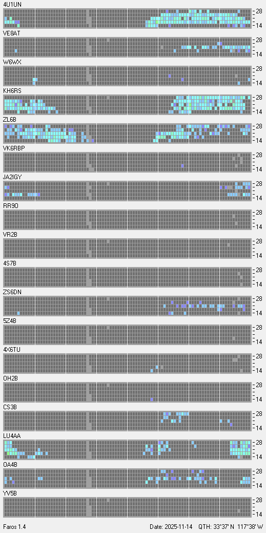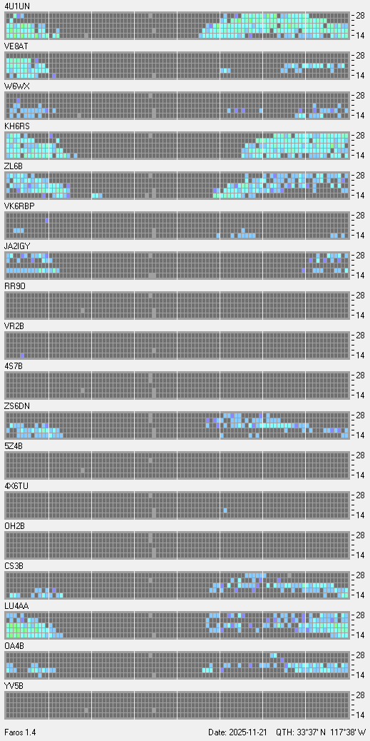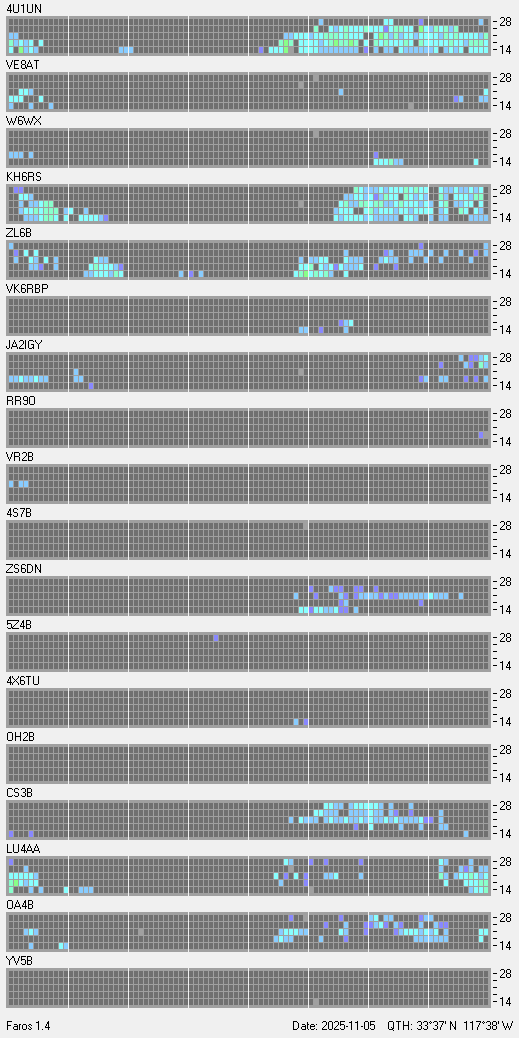 This is a record of NCDXF Beacon received at W6SI station using FAROS 1.4 monitor software. There are 18 beacons throughout the world, it records each ham band between 20m to 10m bands, including WARC bands. Each row on the given beacon block represents the band, 20, 17, 15, 12 and 10 meters, from the bottom to the top. The chart shows the relative signal strength (S/N ratio) of the received beacon. |