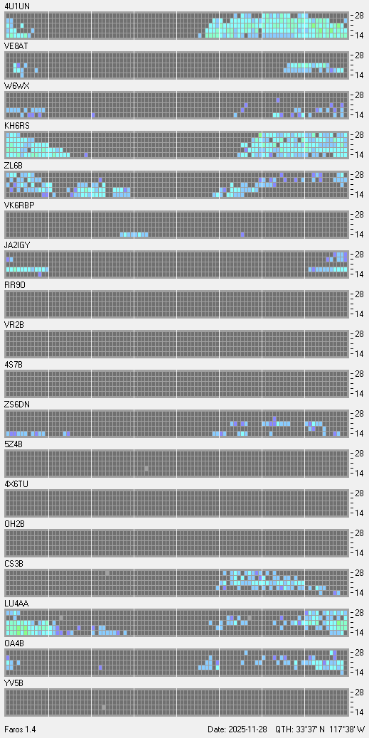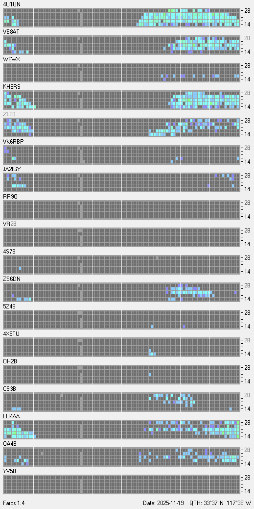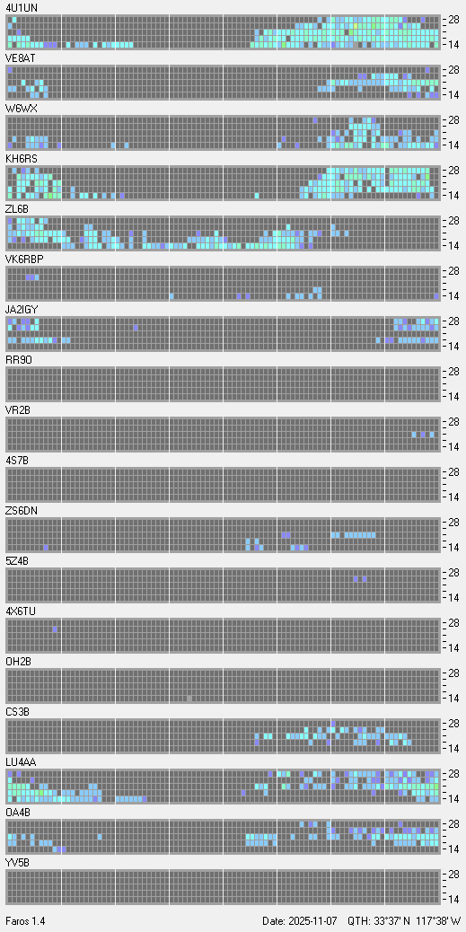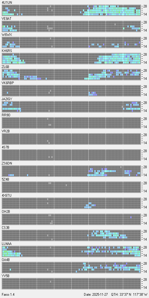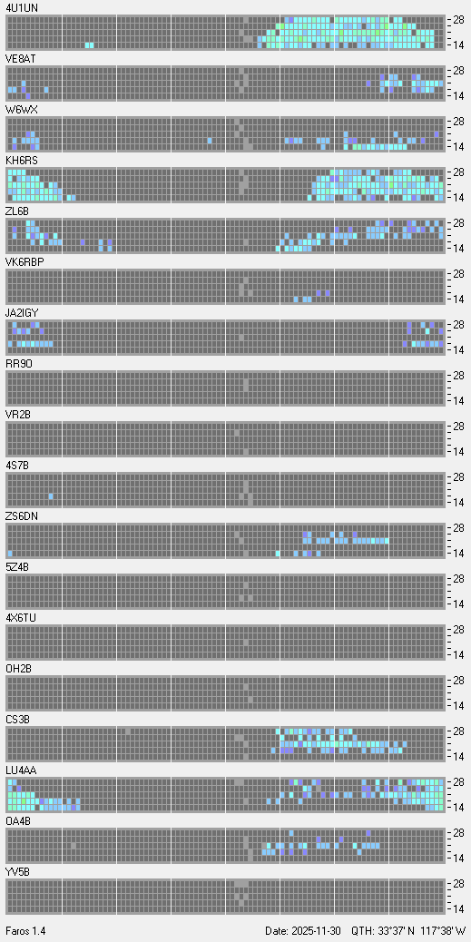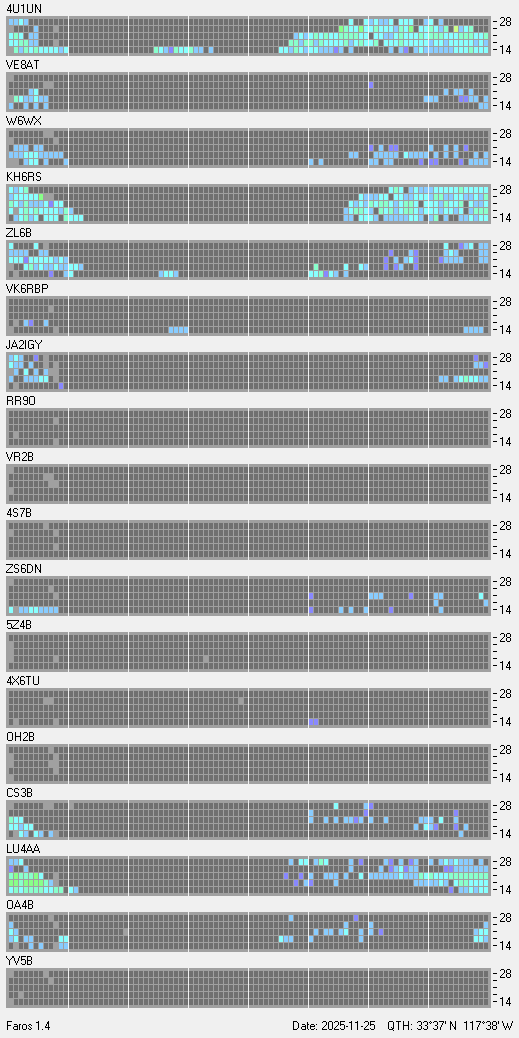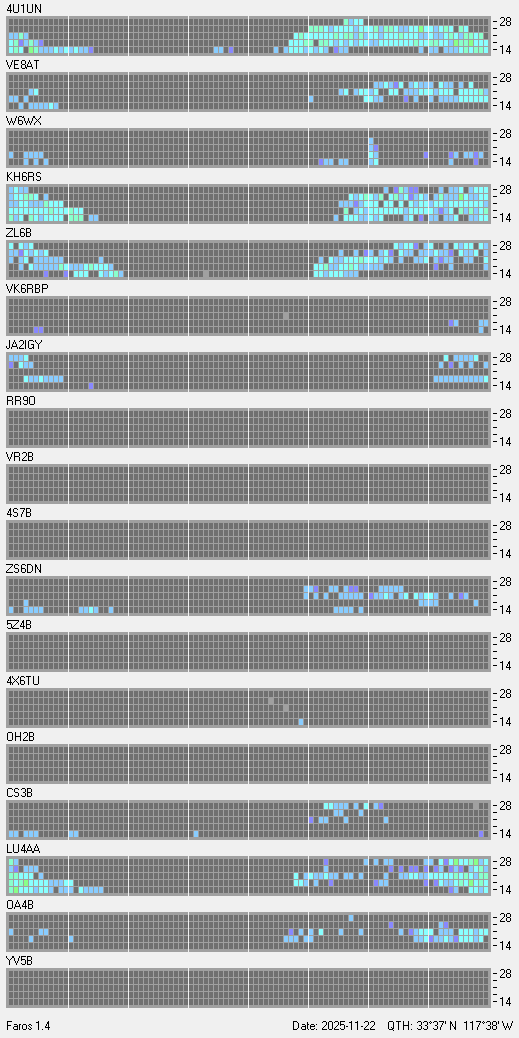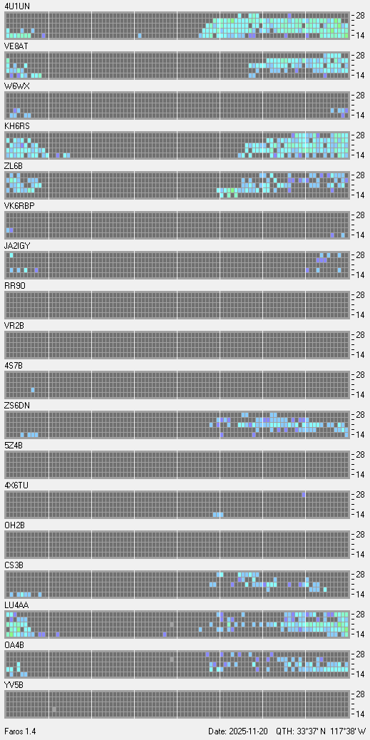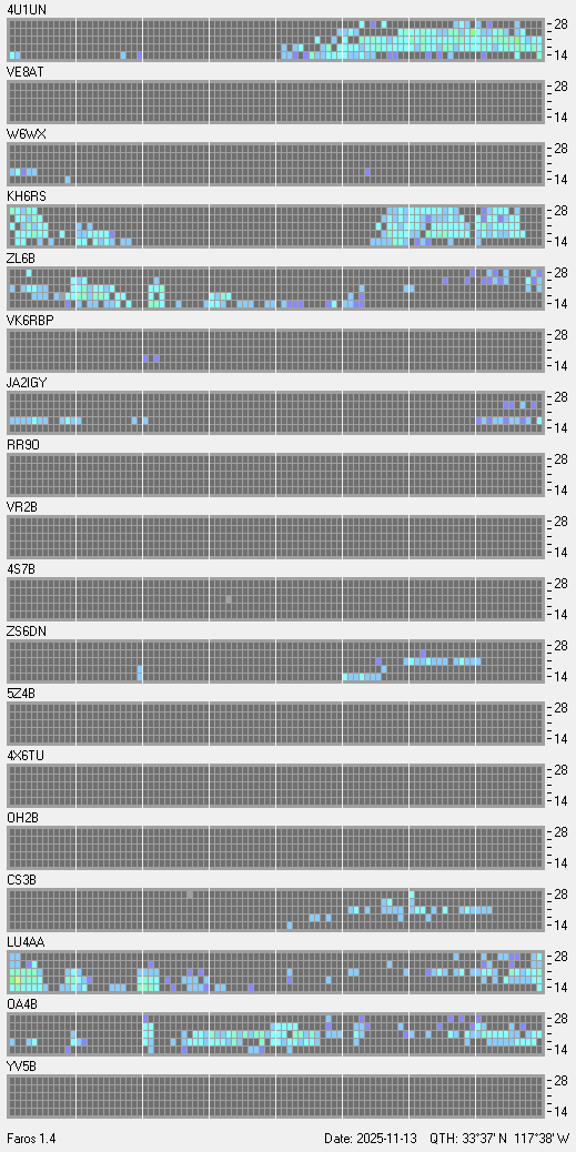 This is a record of NCDXF Beacon received at W6SI station using FAROS 1.4 monitor software. There are 18 beacons throughout the world, it records each ham band between 20m to 10m bands, including WARC bands. Each row on the given beacon block represents the band, 20, 17, 15, 12 and 10 meters, from the bottom to the top. The chart shows the relative signal strength (S/N ratio) of the received beacon. |