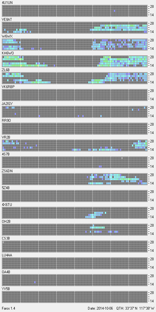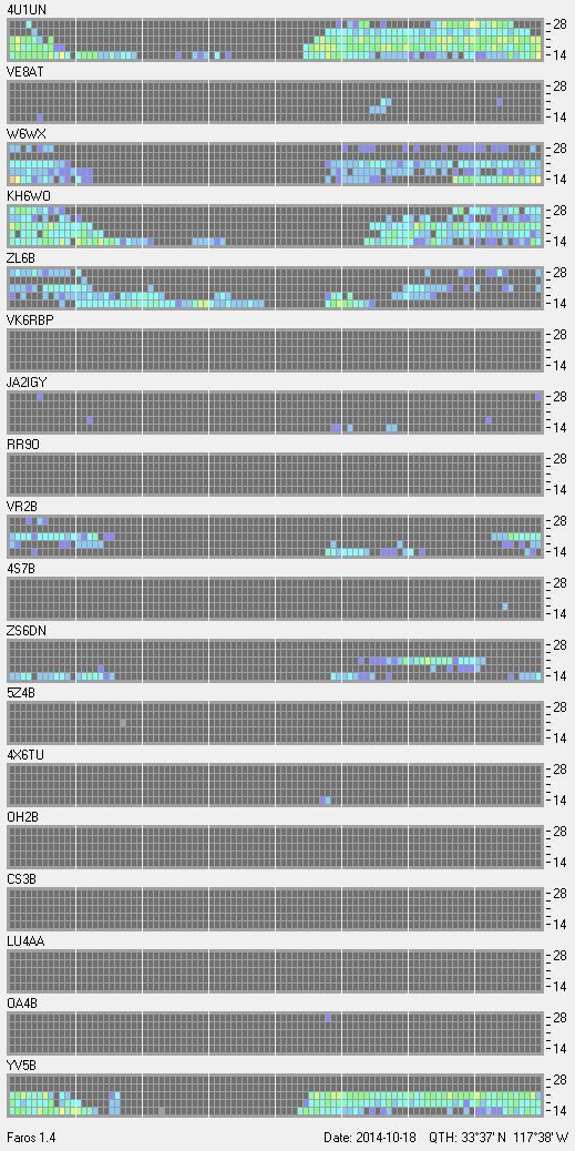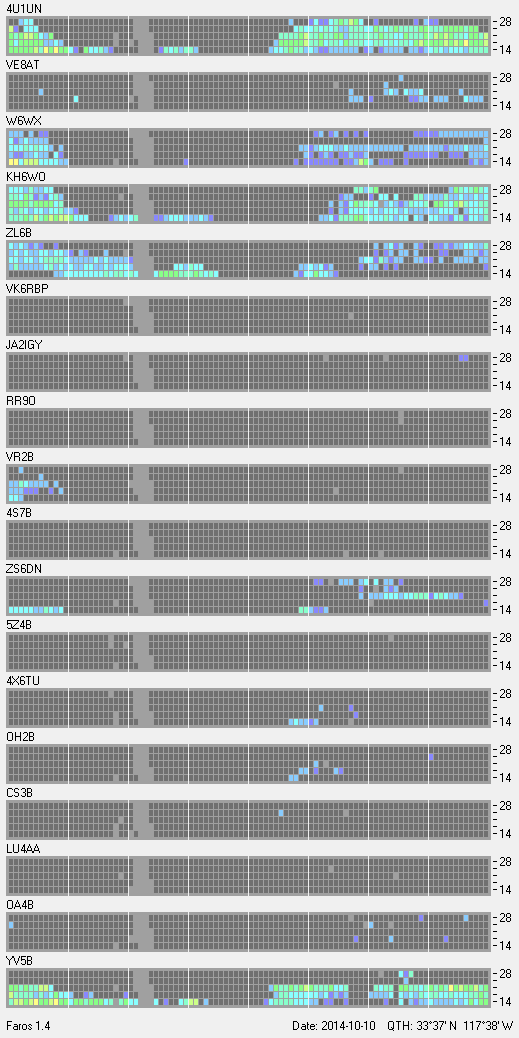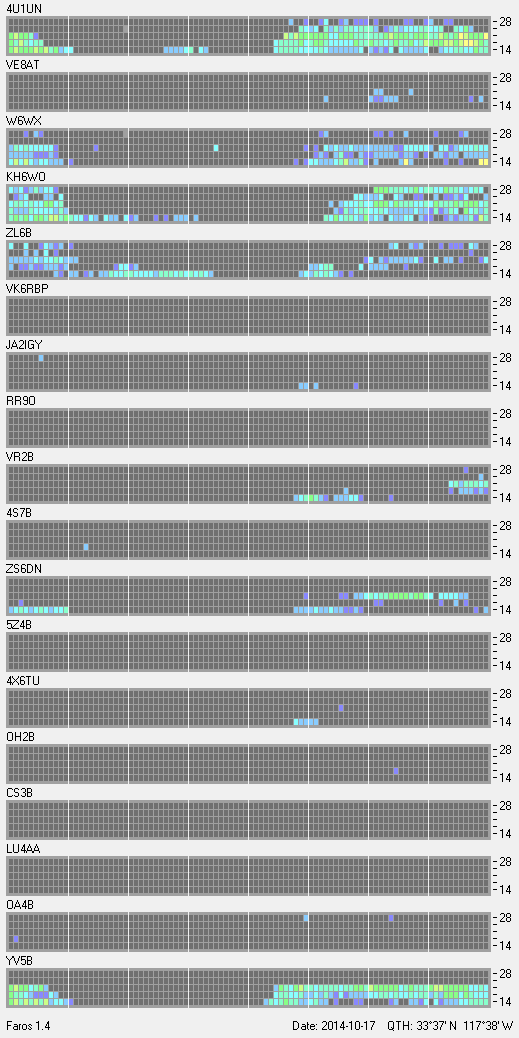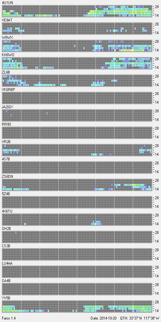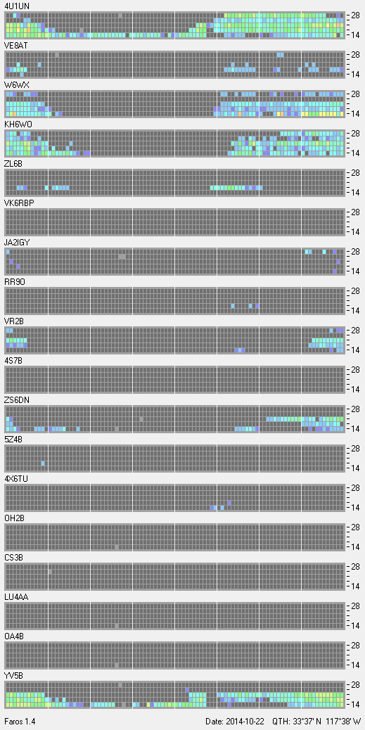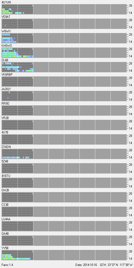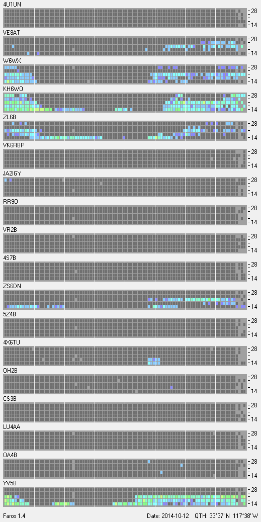 This is a record of NCDXF Beacon received at W6SI station using FAROS 1.4 monitor software. There are 18 beacons throughout the world, it records each ham band between 20m to 10m bands, including WARC bands. Each row on the given beacon block represents the band, 20, 17, 15, 12 and 10 meters, from the bottom to the top. The chart shows the relative signal strength (S/N ratio) of the received beacon.