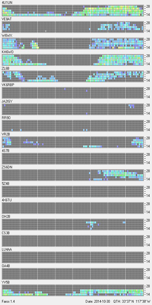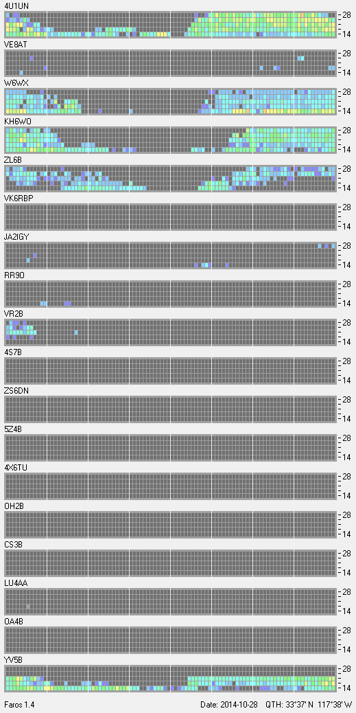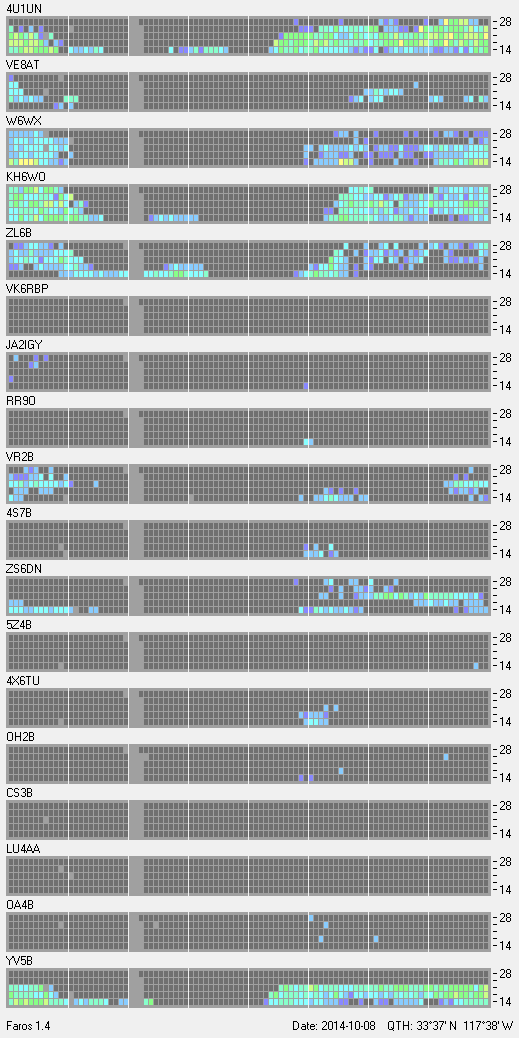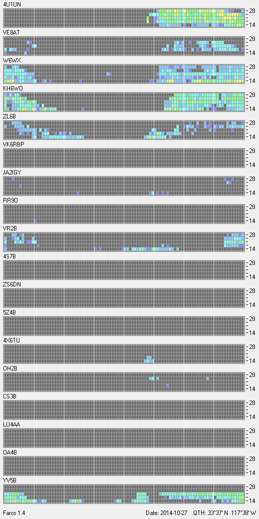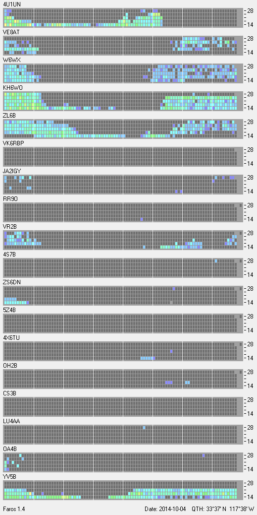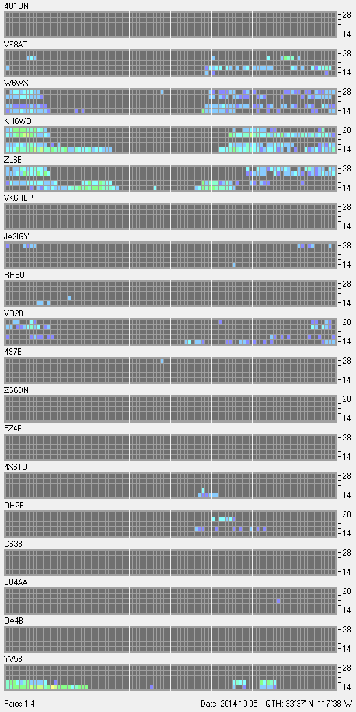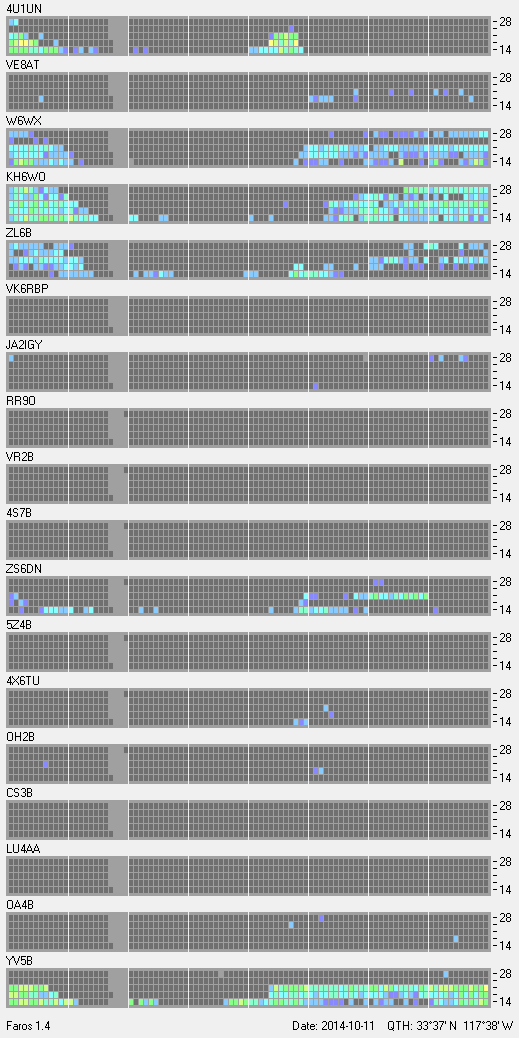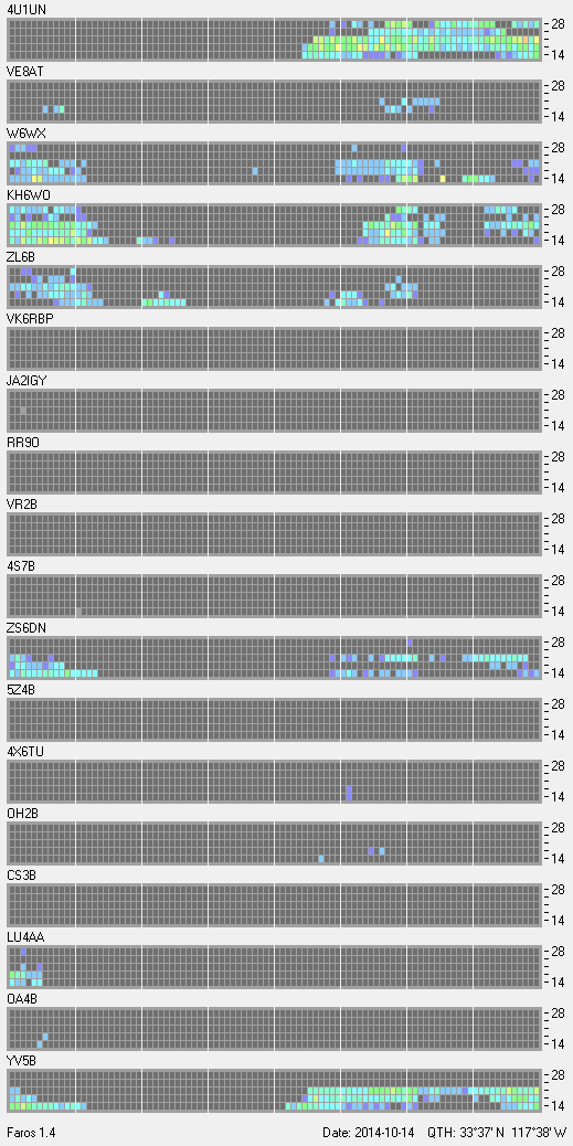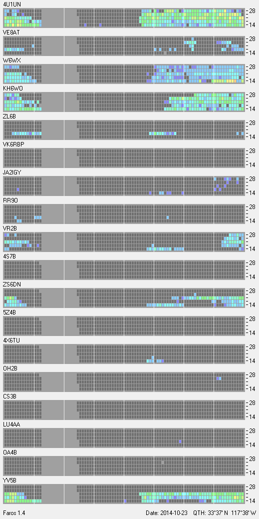 This is a record of NCDXF Beacon received at W6SI station using FAROS 1.4 monitor software. There are 18 beacons throughout the world, it records each ham band between 20m to 10m bands, including WARC bands. Each row on the given beacon block represents the band, 20, 17, 15, 12 and 10 meters, from the bottom to the top. The chart shows the relative signal strength (S/N ratio) of the received beacon.