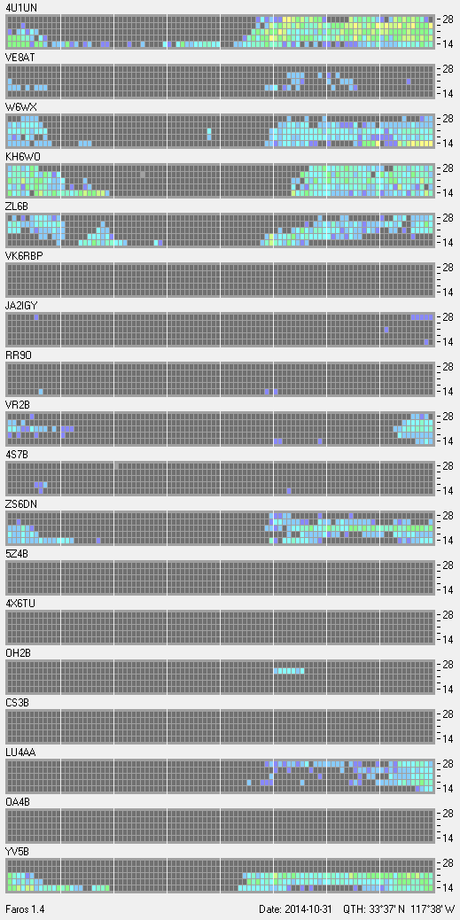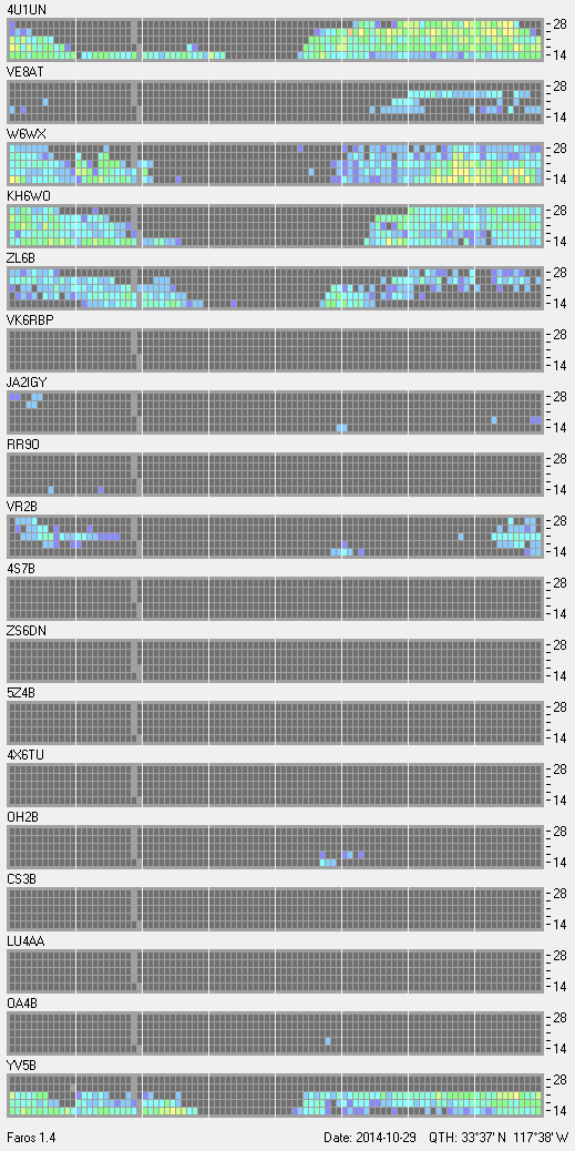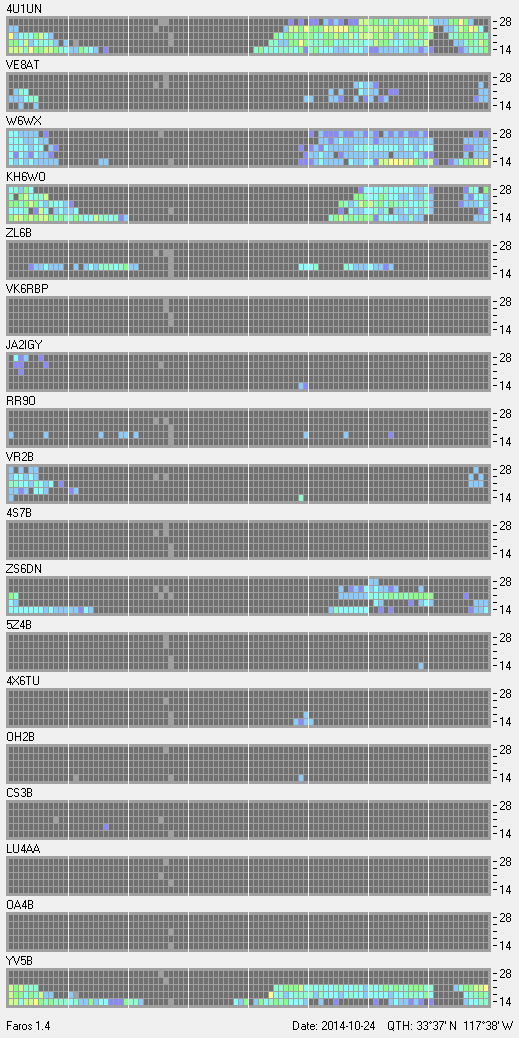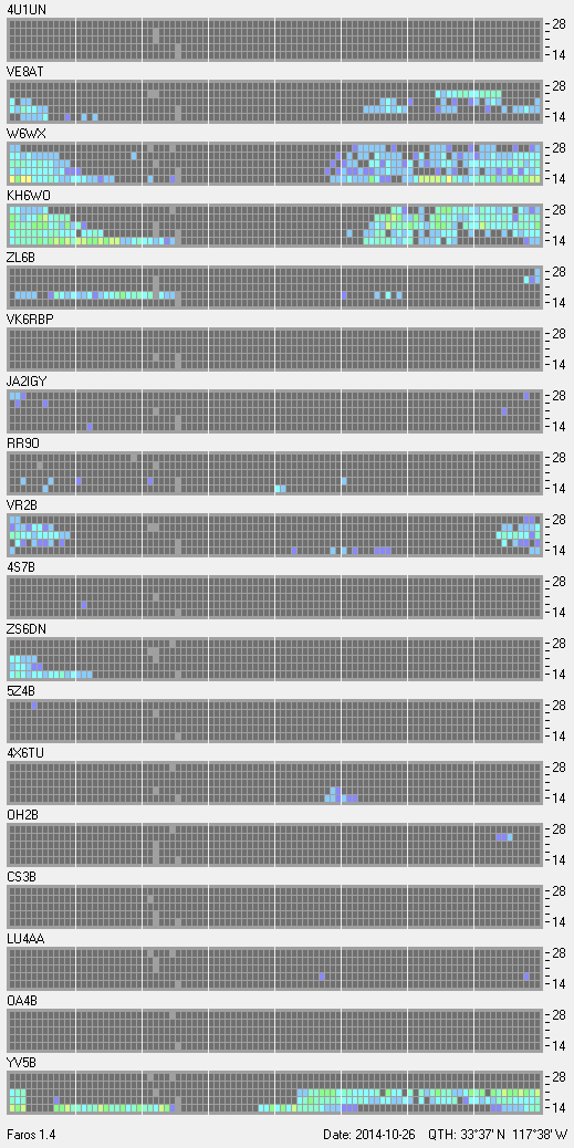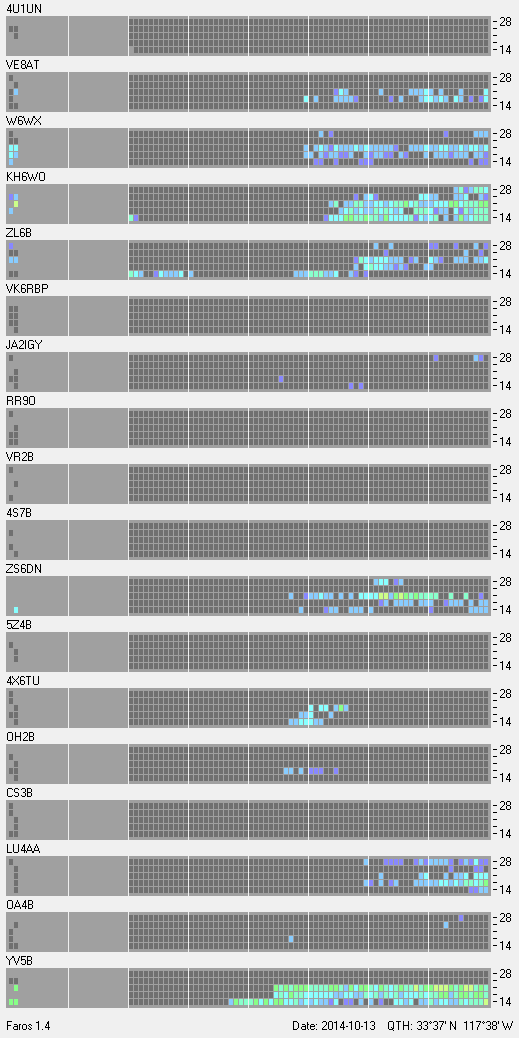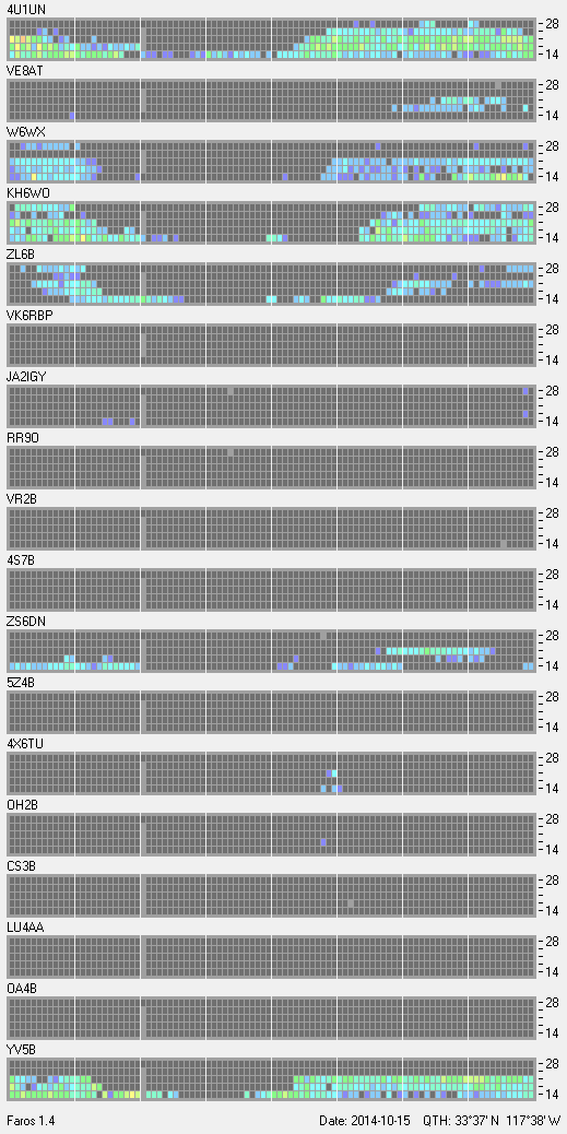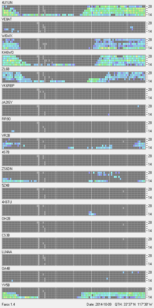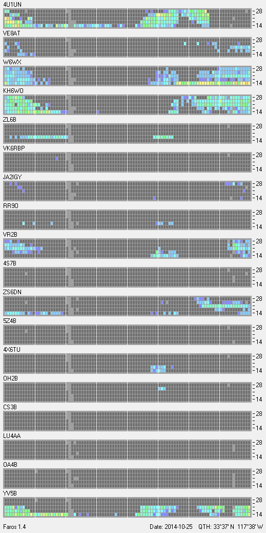 This is a record of NCDXF Beacon received at W6SI station using FAROS 1.4 monitor software. There are 18 beacons throughout the world, it records each ham band between 20m to 10m bands, including WARC bands. Each row on the given beacon block represents the band, 20, 17, 15, 12 and 10 meters, from the bottom to the top. The chart shows the relative signal strength (S/N ratio) of the received beacon.