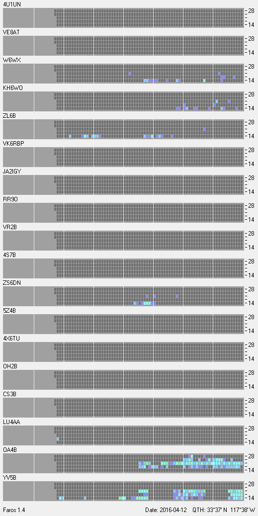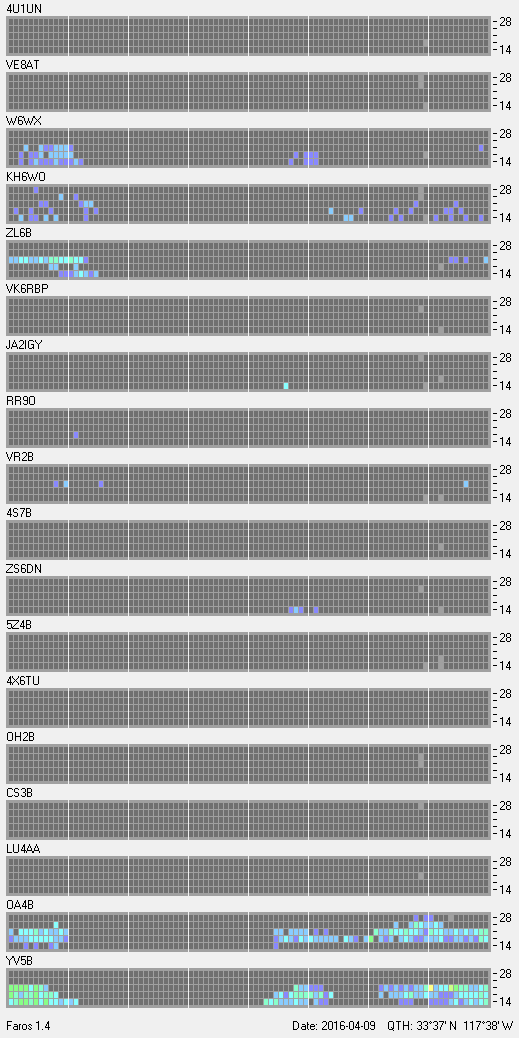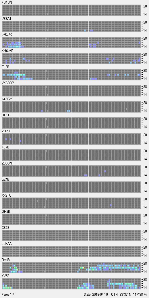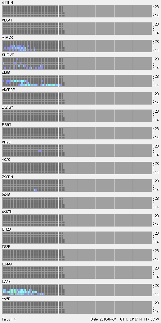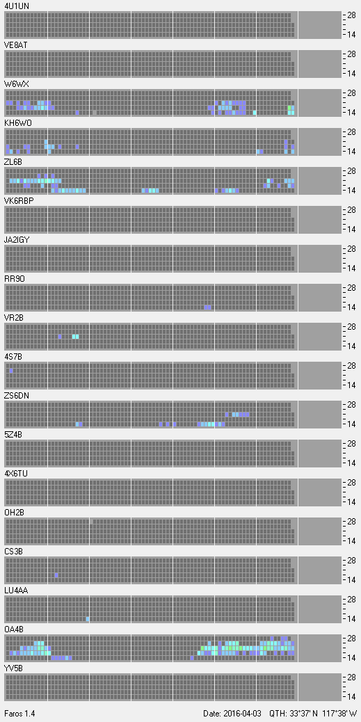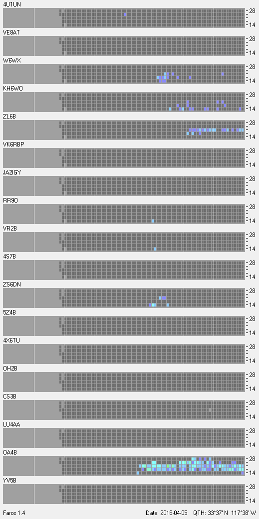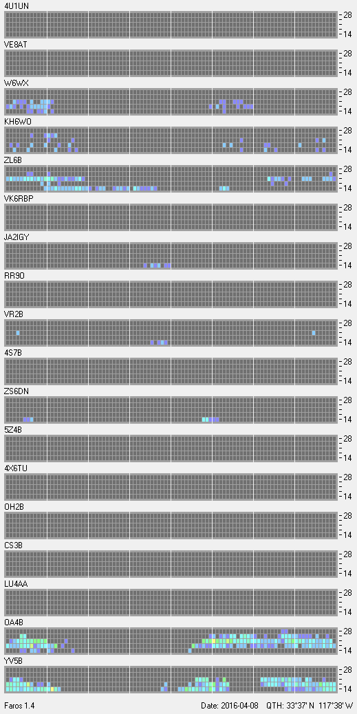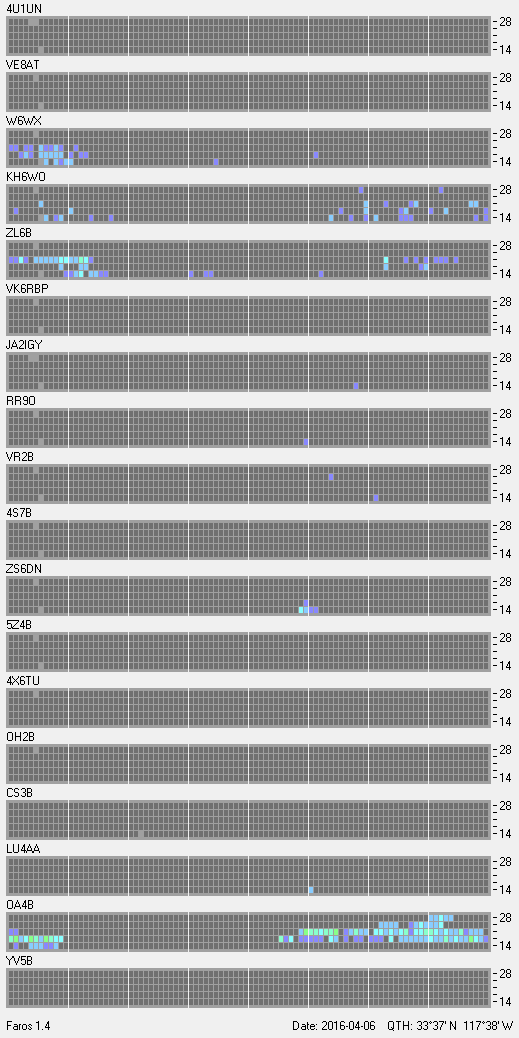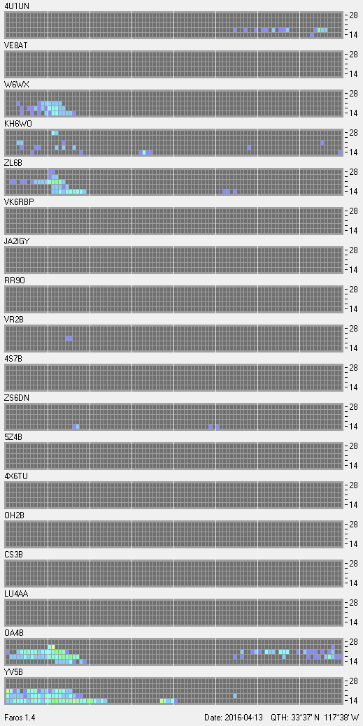 This is a record of NCDXF Beacon received at W6SI station using FAROS 1.4 monitor software. There are 18 beacons throughout the world, it records each ham band between 20m to 10m bands, including WARC bands. Each row on the given beacon block represents the band, 20, 17, 15, 12 and 10 meters, from the bottom to the top. The chart shows the relative signal strength (S/N ratio) of the received beacon. |