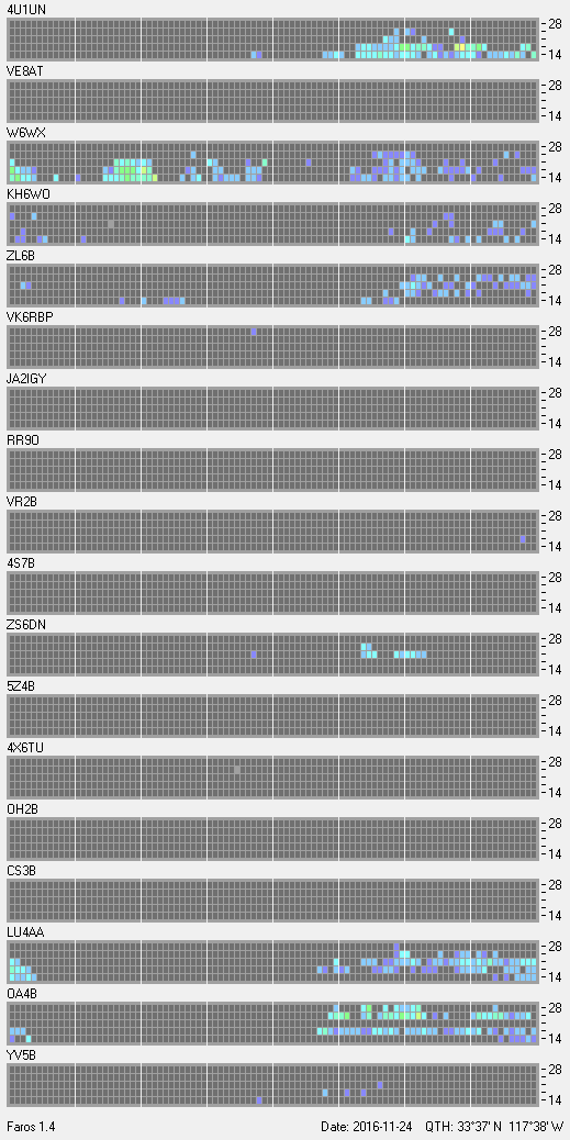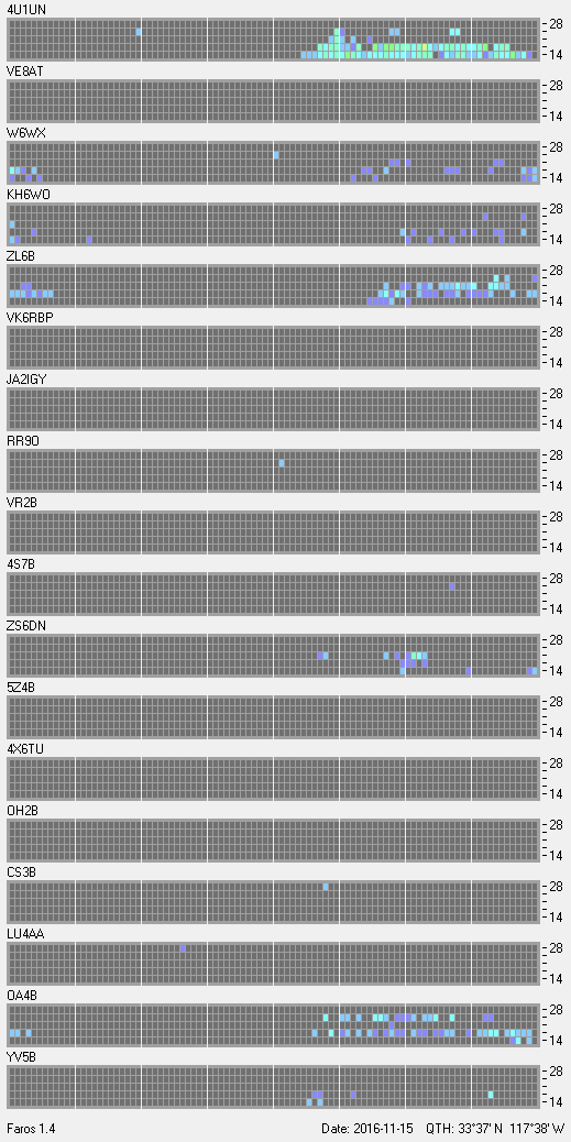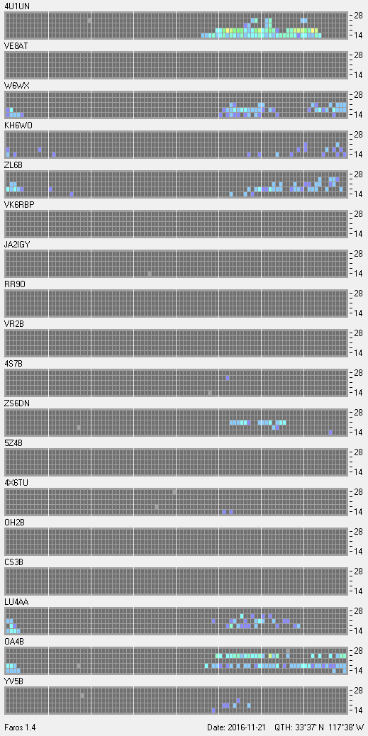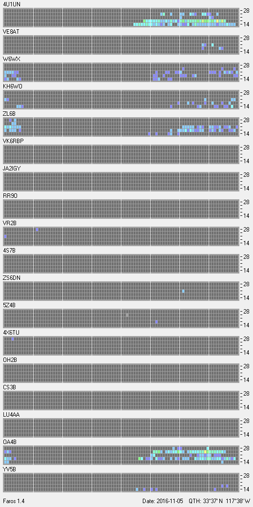 This is a record of NCDXF Beacon received at W6SI station using FAROS 1.4 monitor software. There are 18 beacons throughout the world, it records each ham band between 20m to 10m bands, including WARC bands. Each row on the given beacon block represents the band, 20, 17, 15, 12 and 10 meters, from the bottom to the top. The chart shows the relative signal strength (S/N ratio) of the received beacon. |