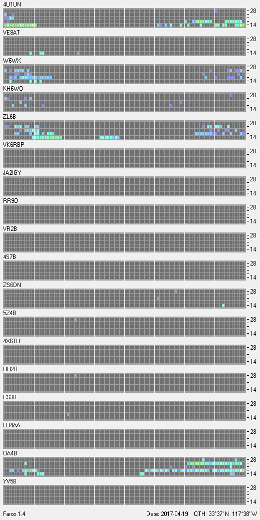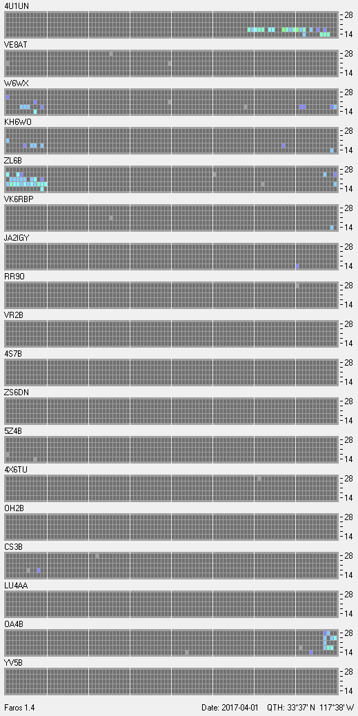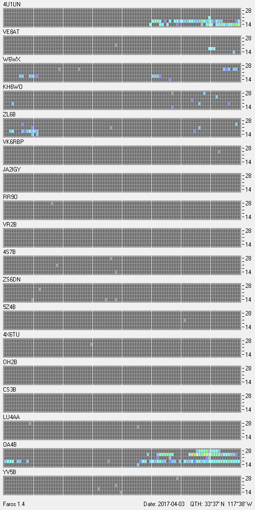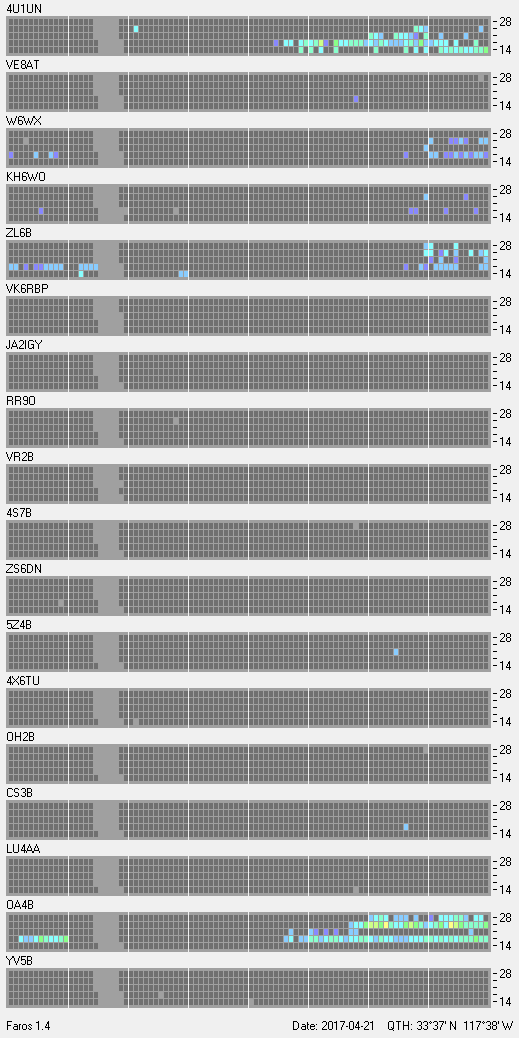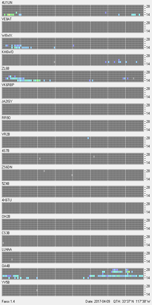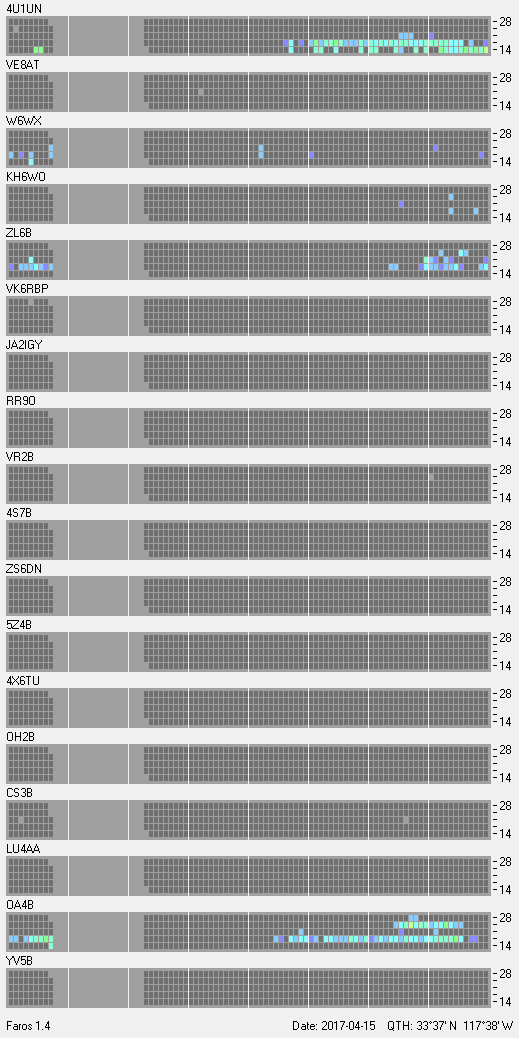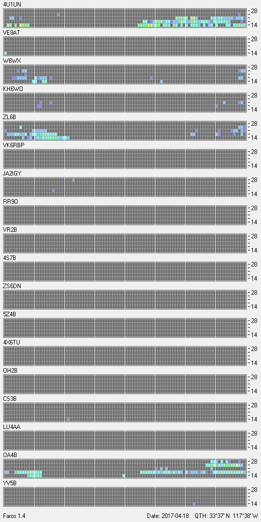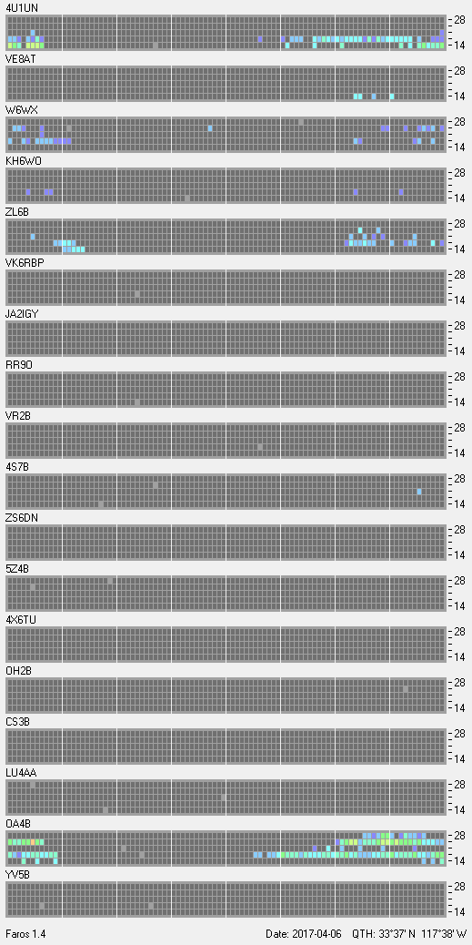 This is a record of NCDXF Beacon received at W6SI station using FAROS 1.4 monitor software. There are 18 beacons throughout the world, it records each ham band between 20m to 10m bands, including WARC bands. Each row on the given beacon block represents the band, 20, 17, 15, 12 and 10 meters, from the bottom to the top. The chart shows the relative signal strength (S/N ratio) of the received beacon. |