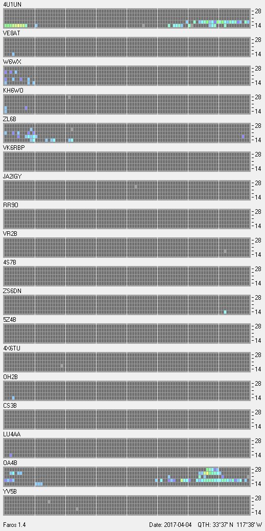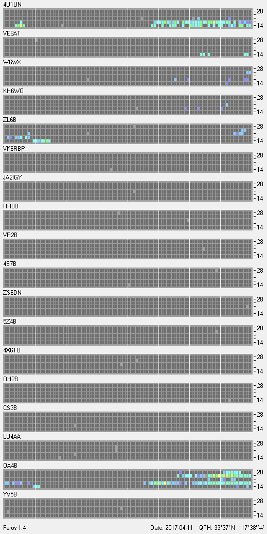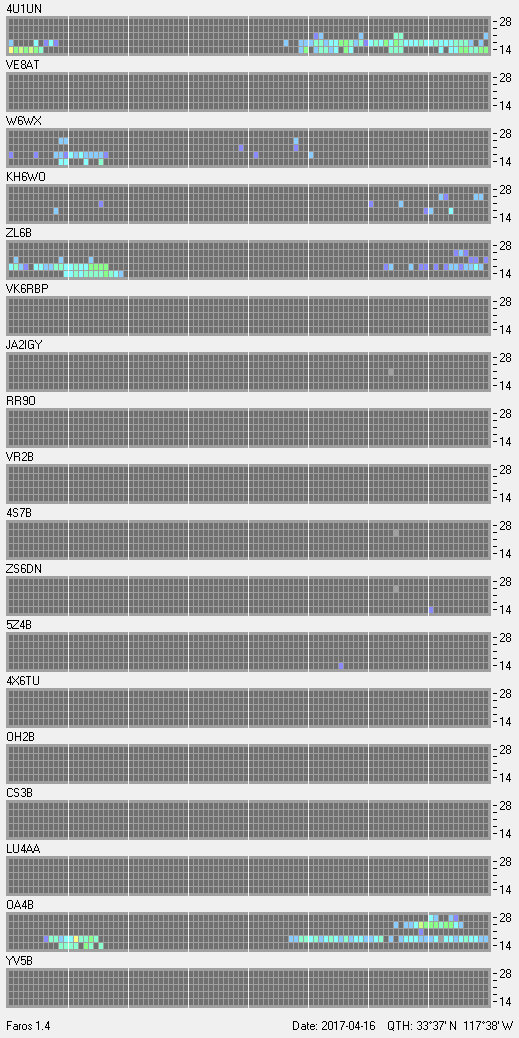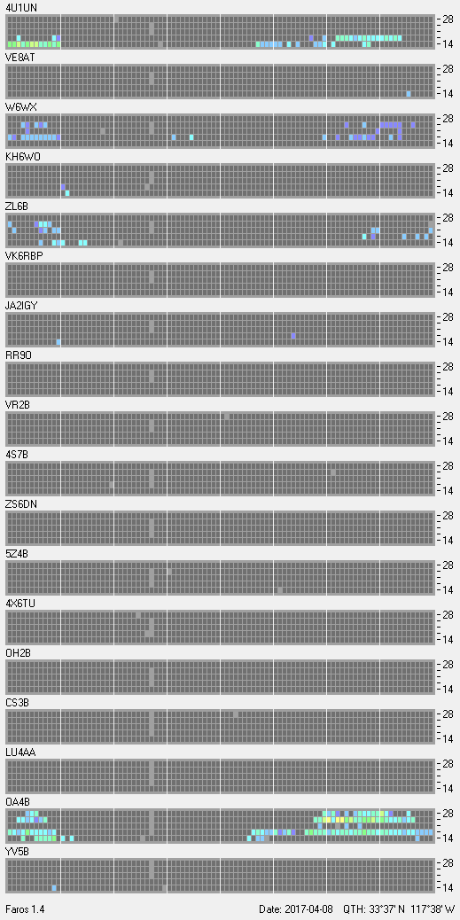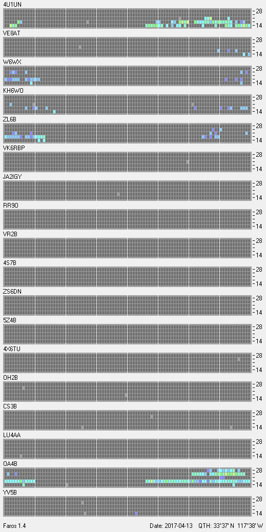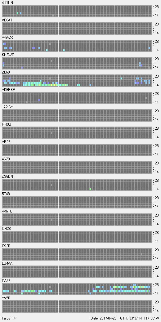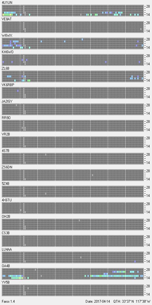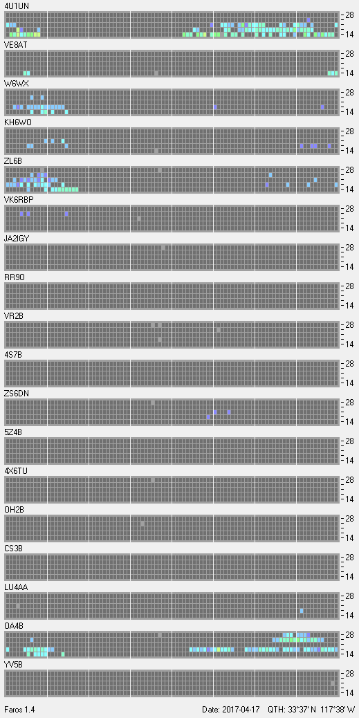 This is a record of NCDXF Beacon received at W6SI station using FAROS 1.4 monitor software. There are 18 beacons throughout the world, it records each ham band between 20m to 10m bands, including WARC bands. Each row on the given beacon block represents the band, 20, 17, 15, 12 and 10 meters, from the bottom to the top. The chart shows the relative signal strength (S/N ratio) of the received beacon. |