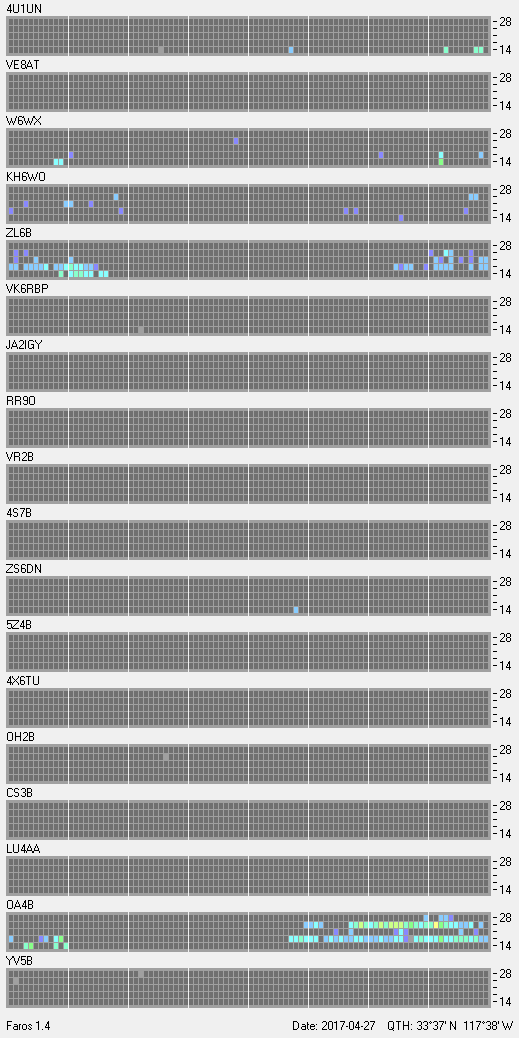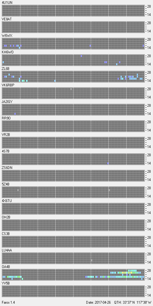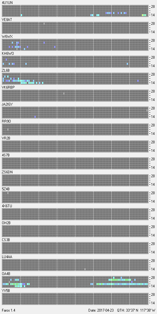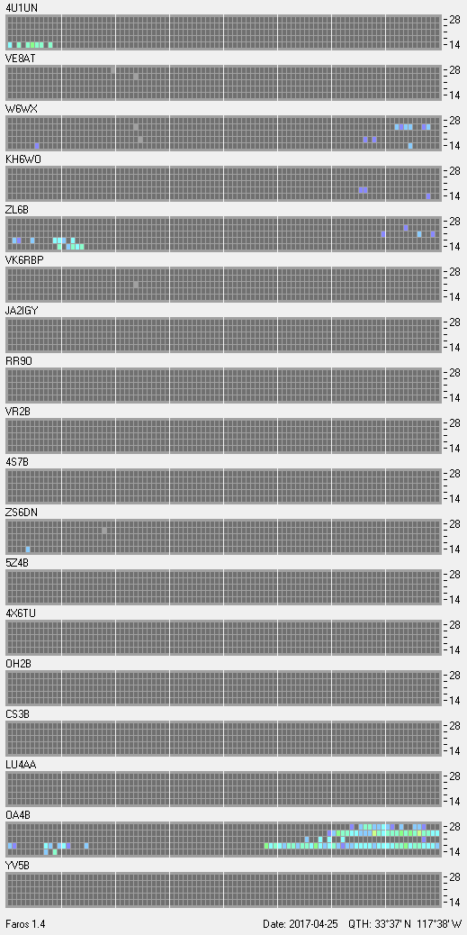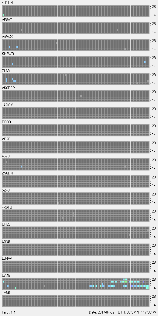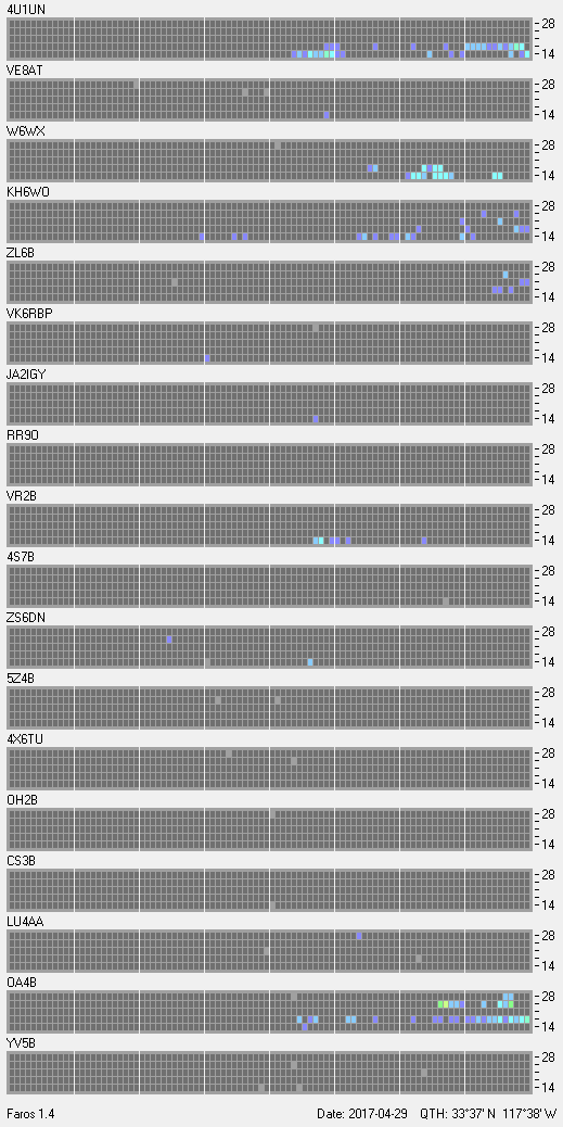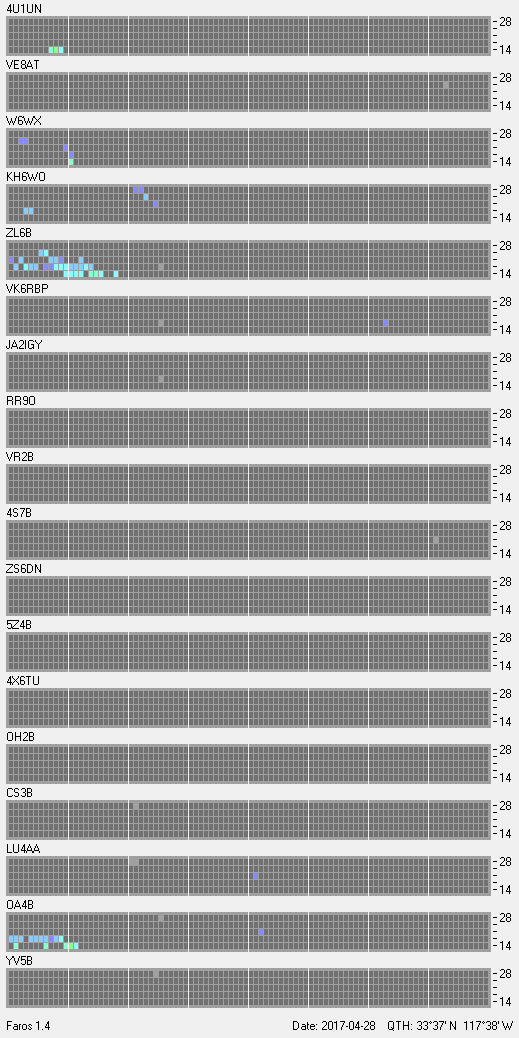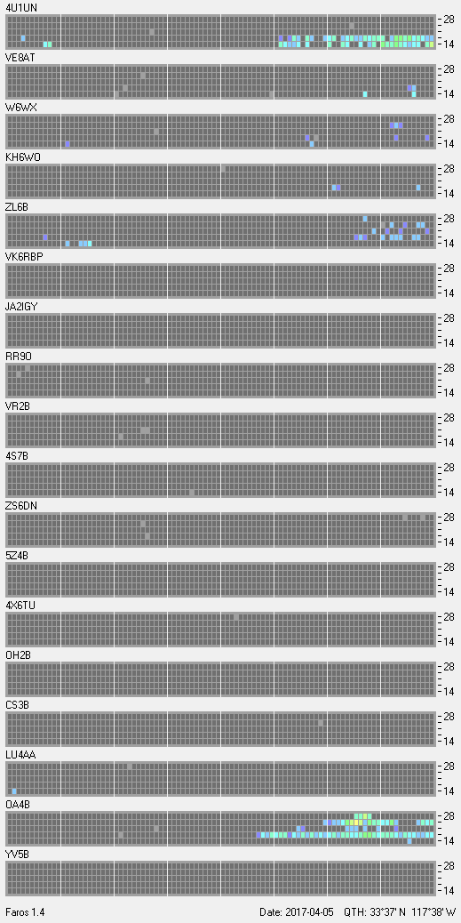 This is a record of NCDXF Beacon received at W6SI station using FAROS 1.4 monitor software. There are 18 beacons throughout the world, it records each ham band between 20m to 10m bands, including WARC bands. Each row on the given beacon block represents the band, 20, 17, 15, 12 and 10 meters, from the bottom to the top. The chart shows the relative signal strength (S/N ratio) of the received beacon. |