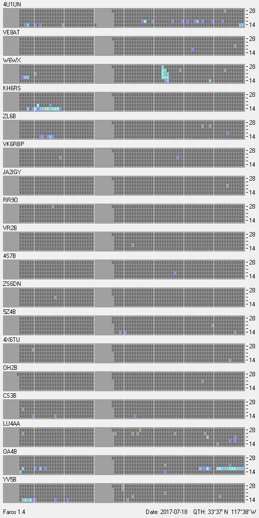 This is a record of NCDXF Beacon received at W6SI station using FAROS 1.4 monitor software. There are 18 beacons throughout the world, it records each ham band between 20m to 10m bands, including WARC bands. Each row on the given beacon block represents the band, 20, 17, 15, 12 and 10 meters, from the bottom to the top. The chart shows the relative signal strength (S/N ratio) of the received beacon. |