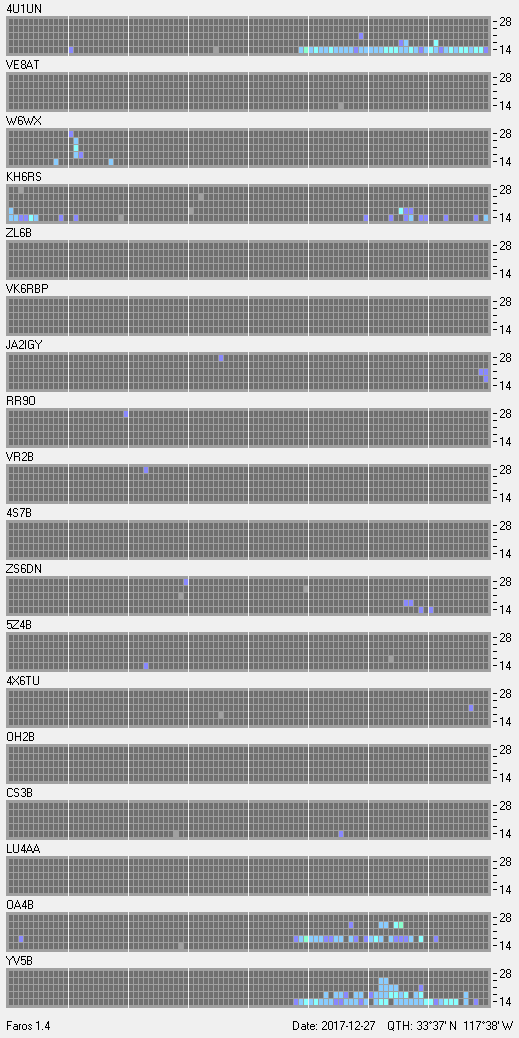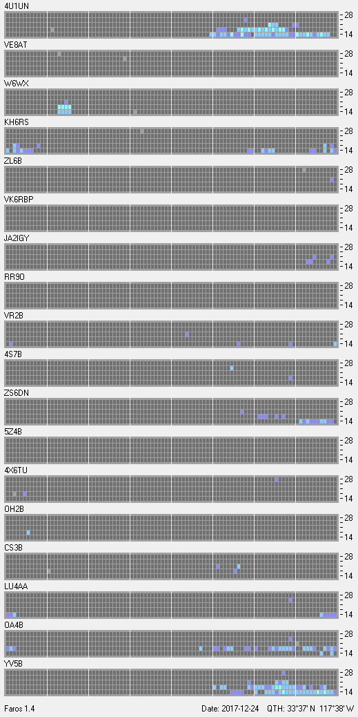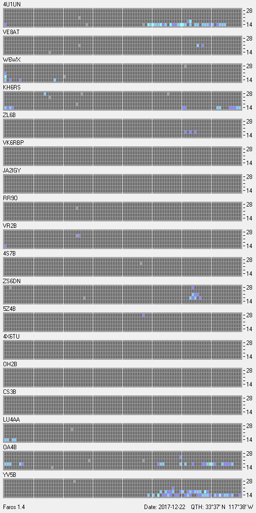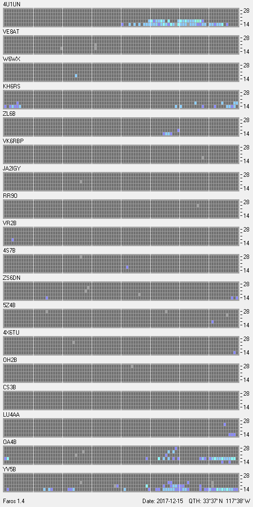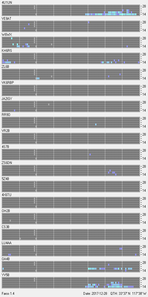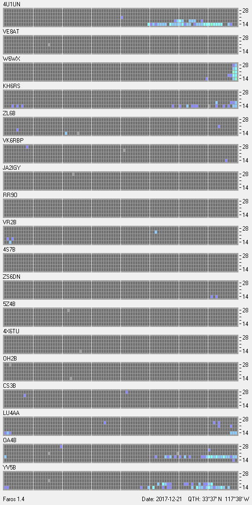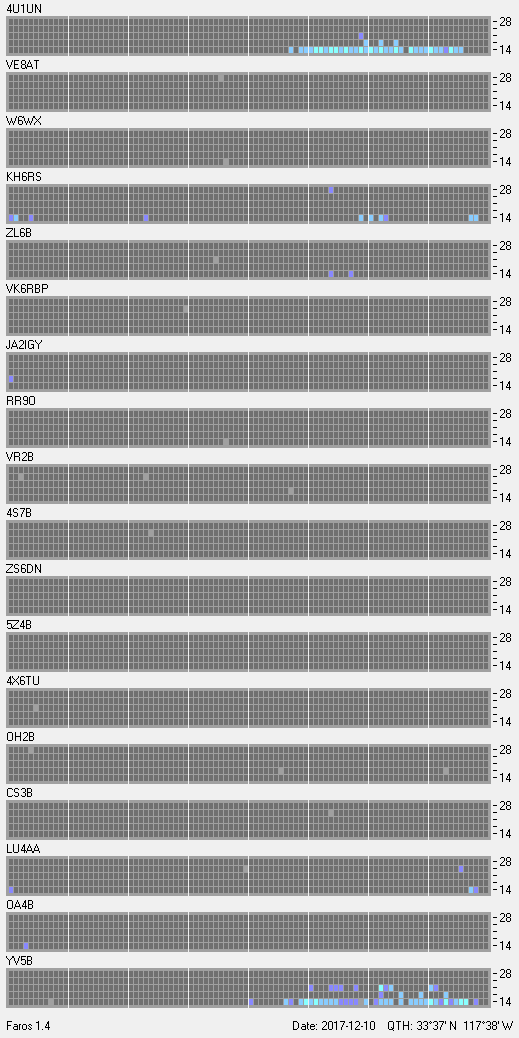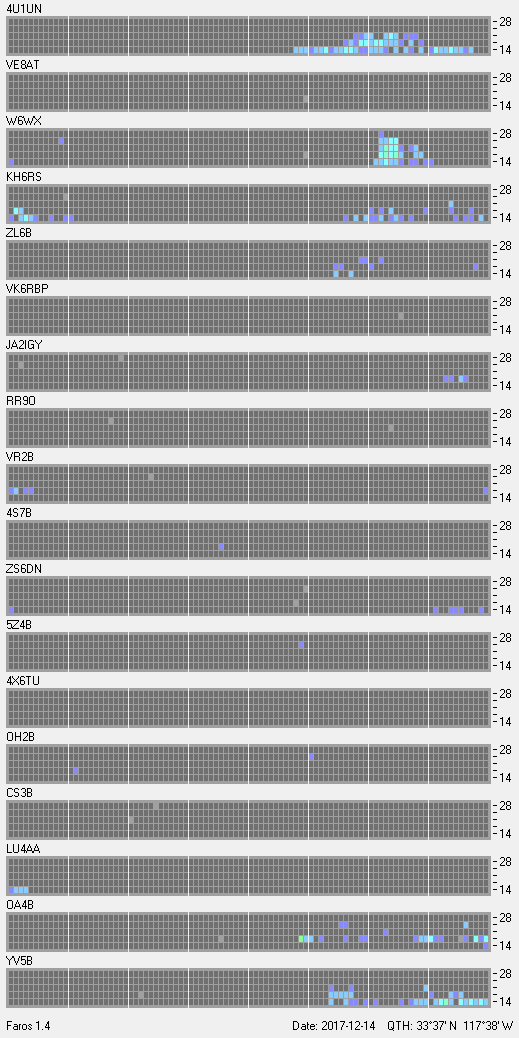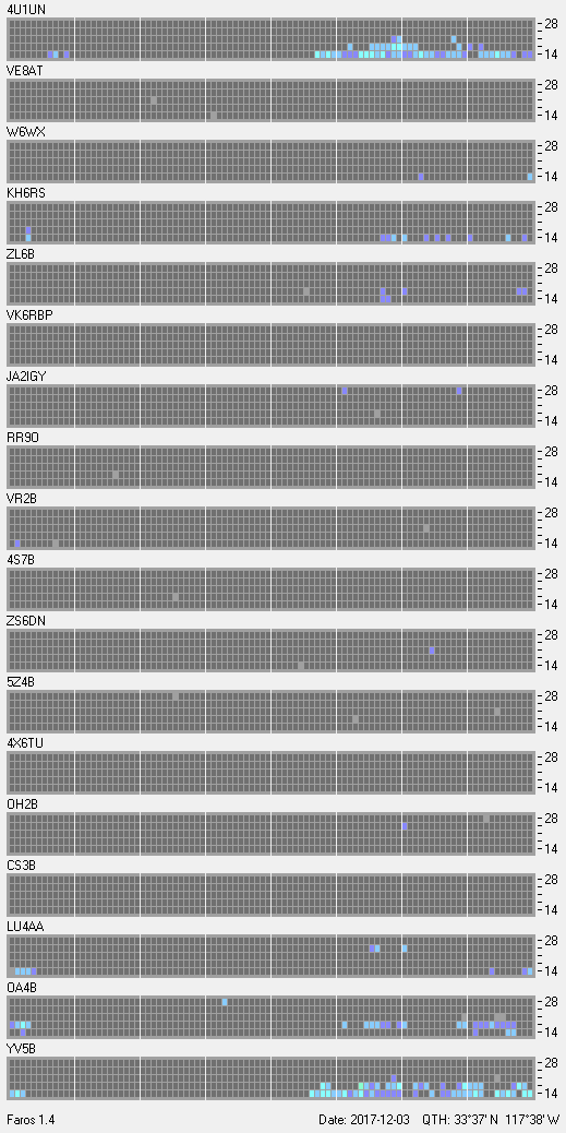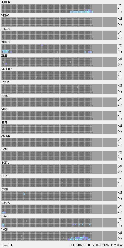 This is a record of NCDXF Beacon received at W6SI station using FAROS 1.4 monitor software. There are 18 beacons throughout the world, it records each ham band between 20m to 10m bands, including WARC bands. Each row on the given beacon block represents the band, 20, 17, 15, 12 and 10 meters, from the bottom to the top. The chart shows the relative signal strength (S/N ratio) of the received beacon. |