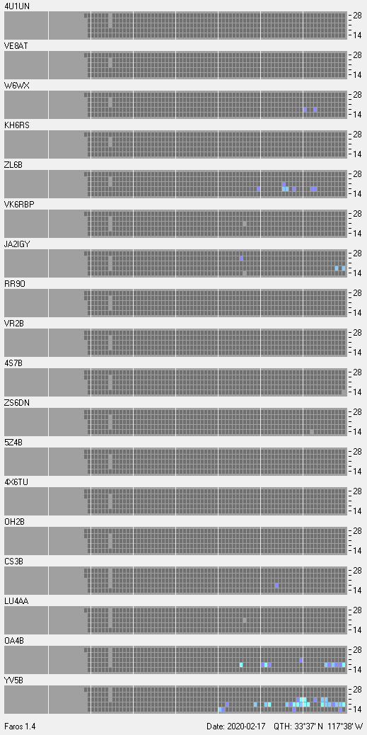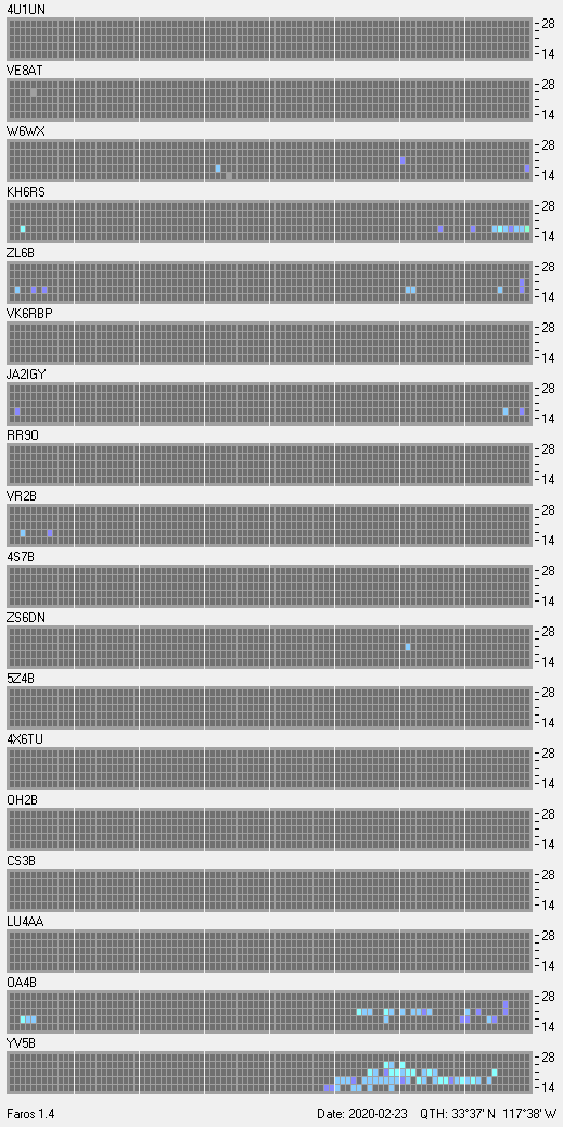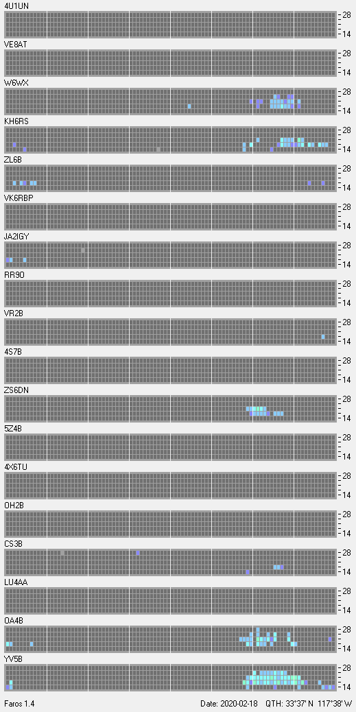 This is a record of NCDXF Beacon received at W6SI station using FAROS 1.4 monitor software. There are 18 beacons throughout the world, it records each ham band between 20m to 10m bands, including WARC bands. Each row on the given beacon block represents the band, 20, 17, 15, 12 and 10 meters, from the bottom to the top. The chart shows the relative signal strength (S/N ratio) of the received beacon. |