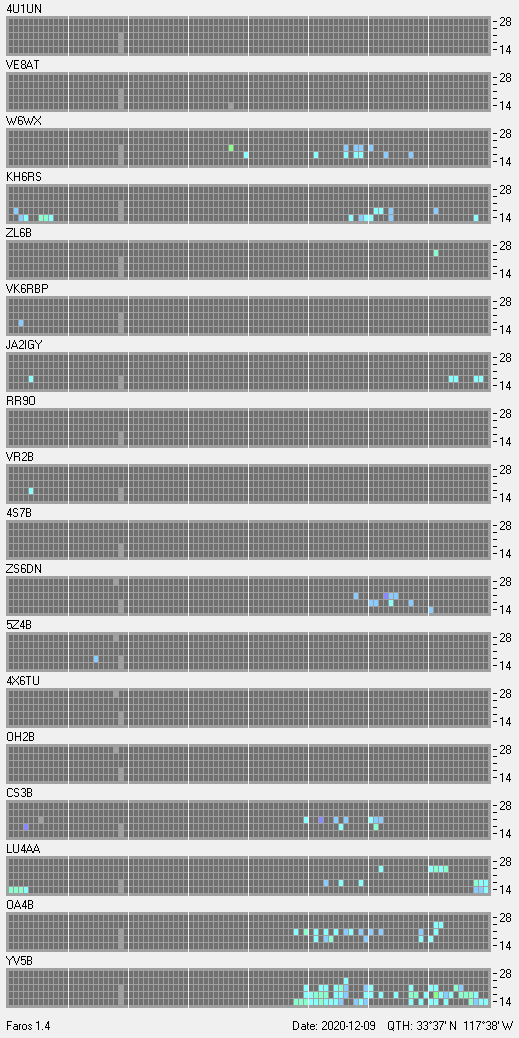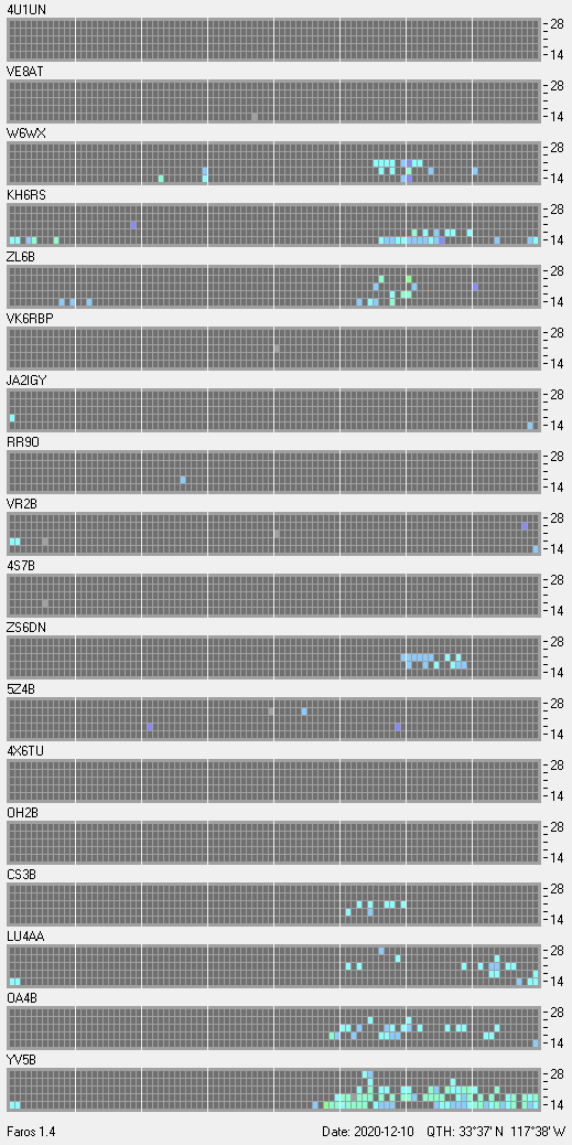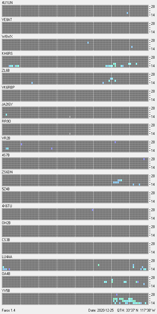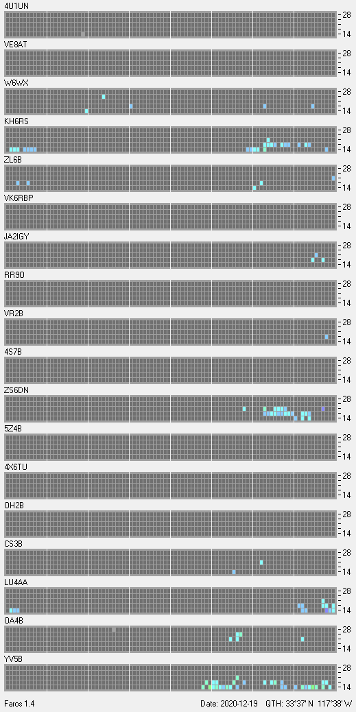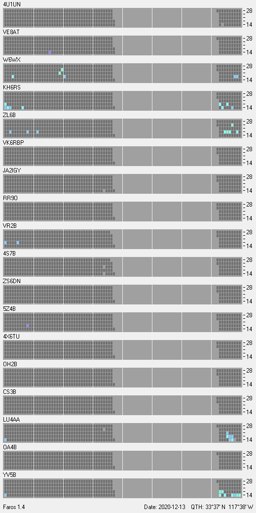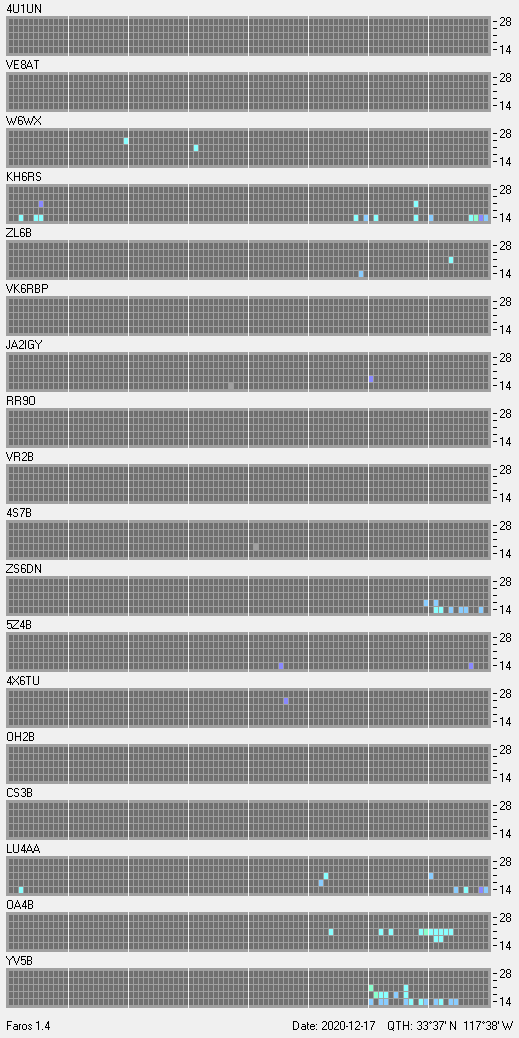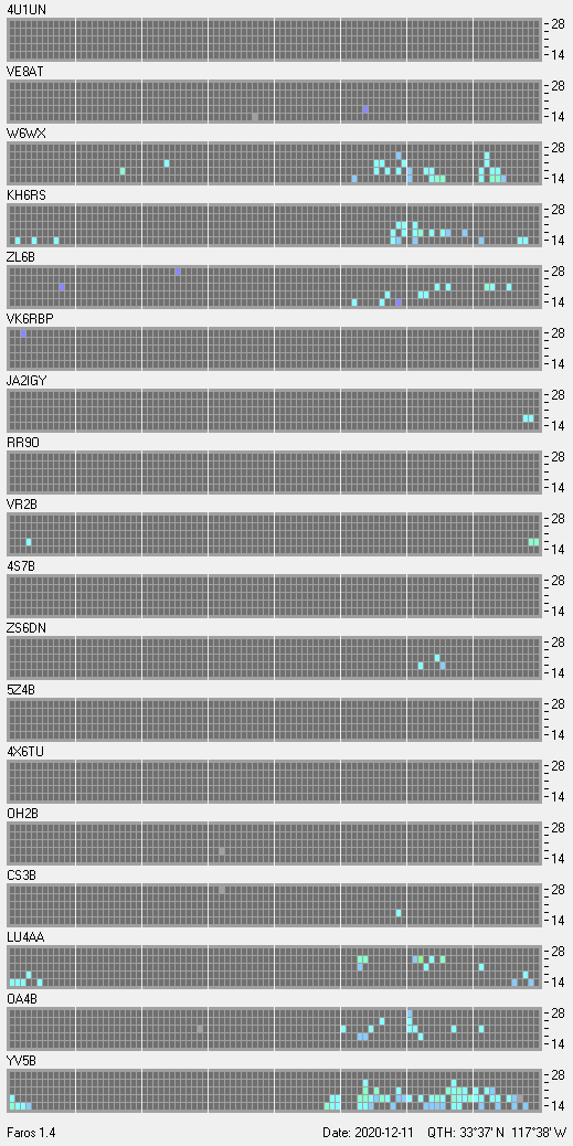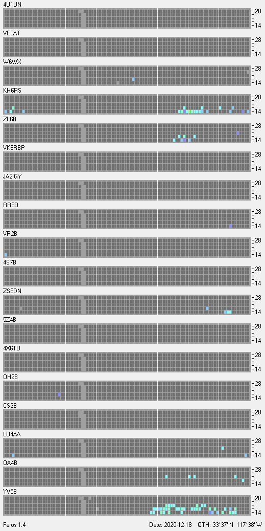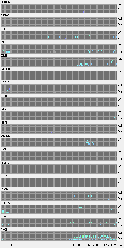 This is a record of NCDXF Beacon received at W6SI station using FAROS 1.4 monitor software. There are 18 beacons throughout the world, it records each ham band between 20m to 10m bands, including WARC bands. Each row on the given beacon block represents the band, 20, 17, 15, 12 and 10 meters, from the bottom to the top. The chart shows the relative signal strength (S/N ratio) of the received beacon. |