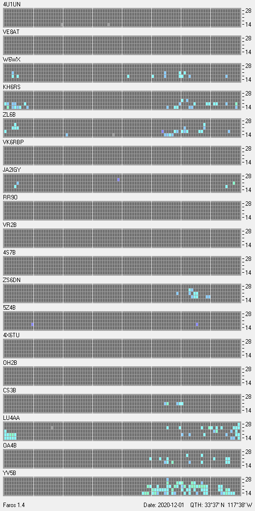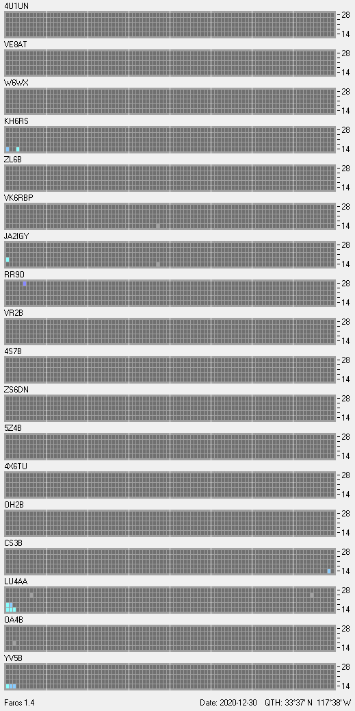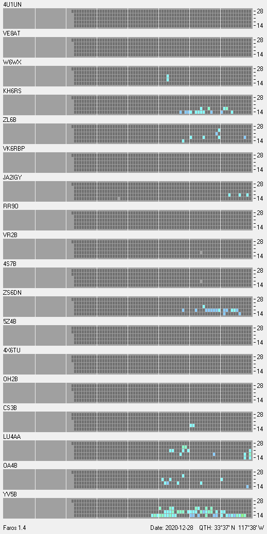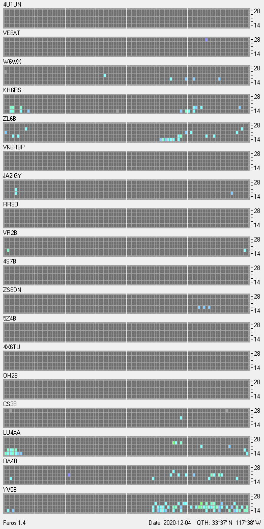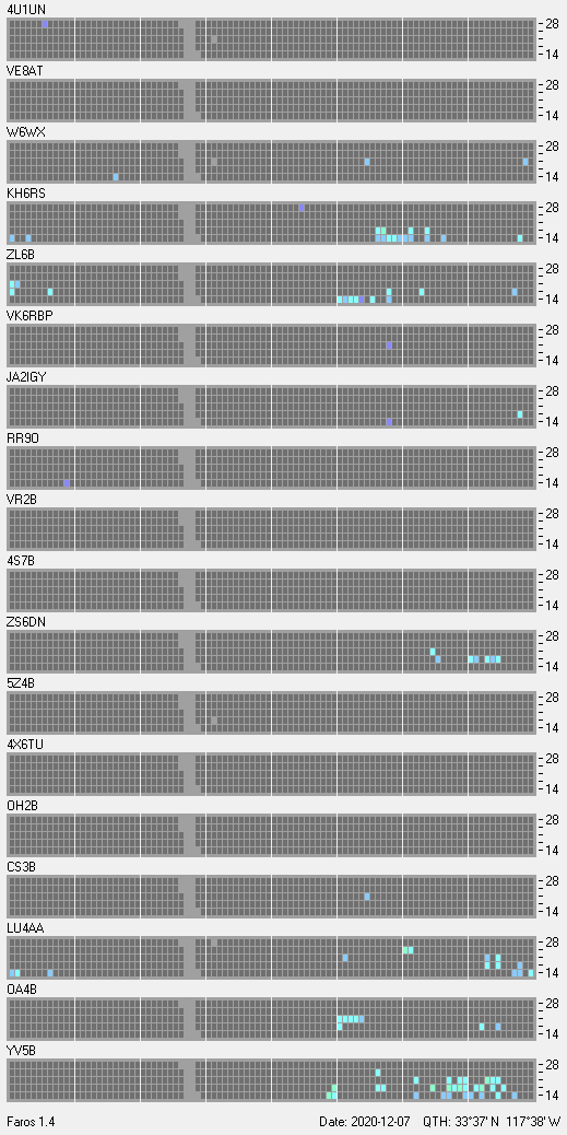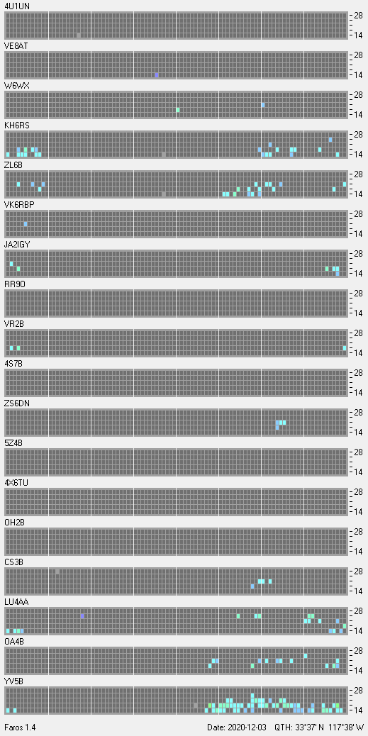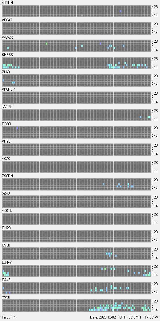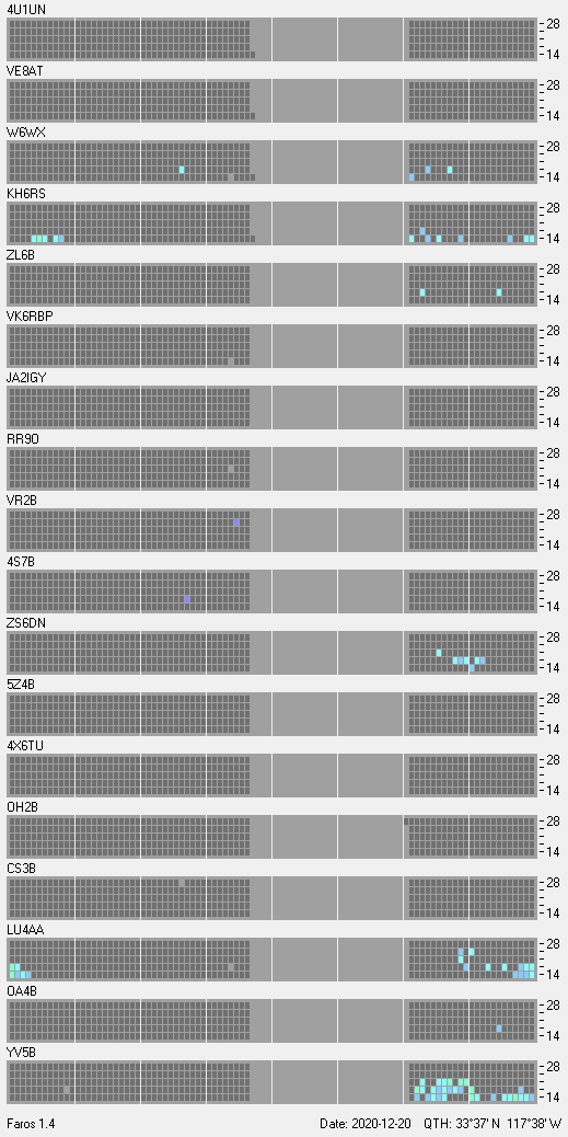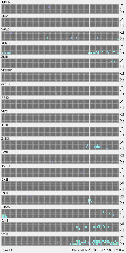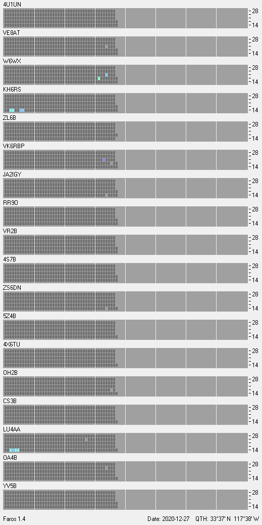 This is a record of NCDXF Beacon received at W6SI station using FAROS 1.4 monitor software. There are 18 beacons throughout the world, it records each ham band between 20m to 10m bands, including WARC bands. Each row on the given beacon block represents the band, 20, 17, 15, 12 and 10 meters, from the bottom to the top. The chart shows the relative signal strength (S/N ratio) of the received beacon. |