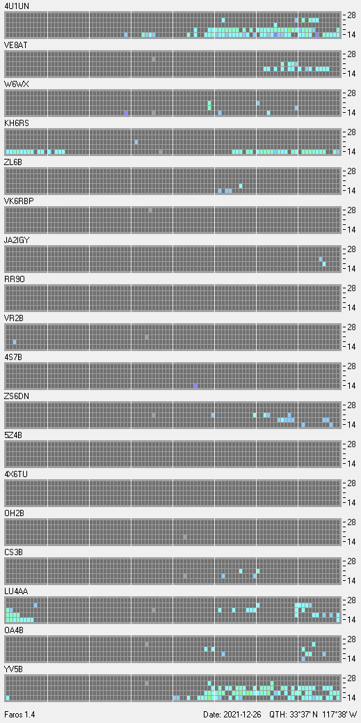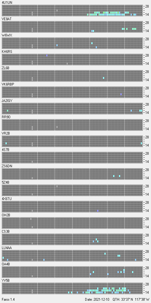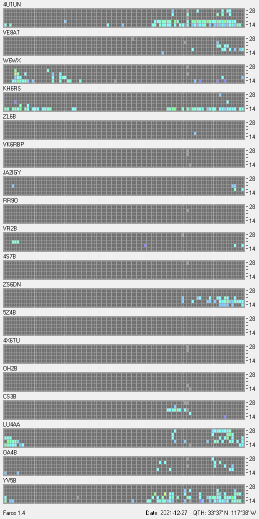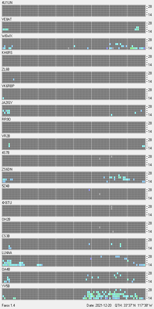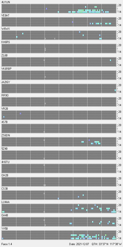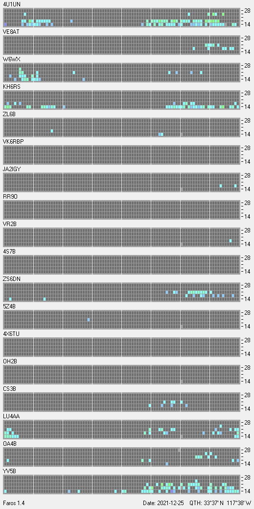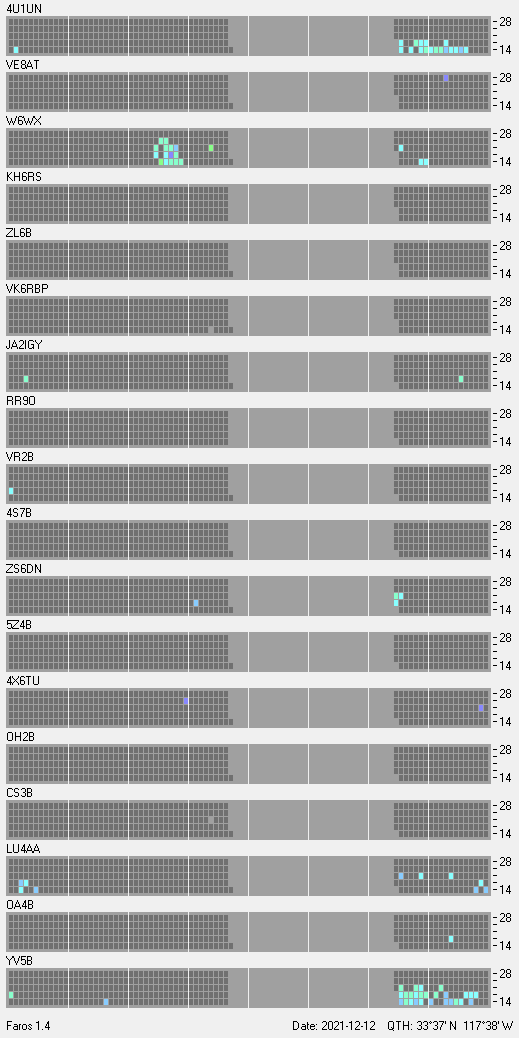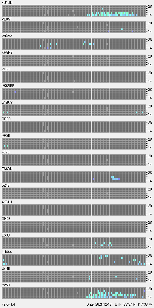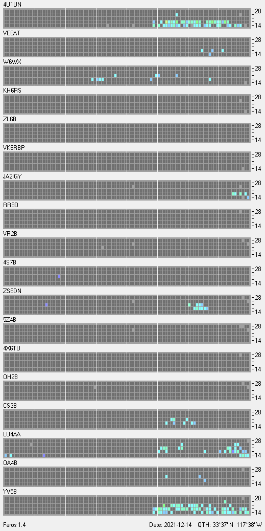 This is a record of NCDXF Beacon received at W6SI station using FAROS 1.4 monitor software. There are 18 beacons throughout the world, it records each ham band between 20m to 10m bands, including WARC bands. Each row on the given beacon block represents the band, 20, 17, 15, 12 and 10 meters, from the bottom to the top. The chart shows the relative signal strength (S/N ratio) of the received beacon. |