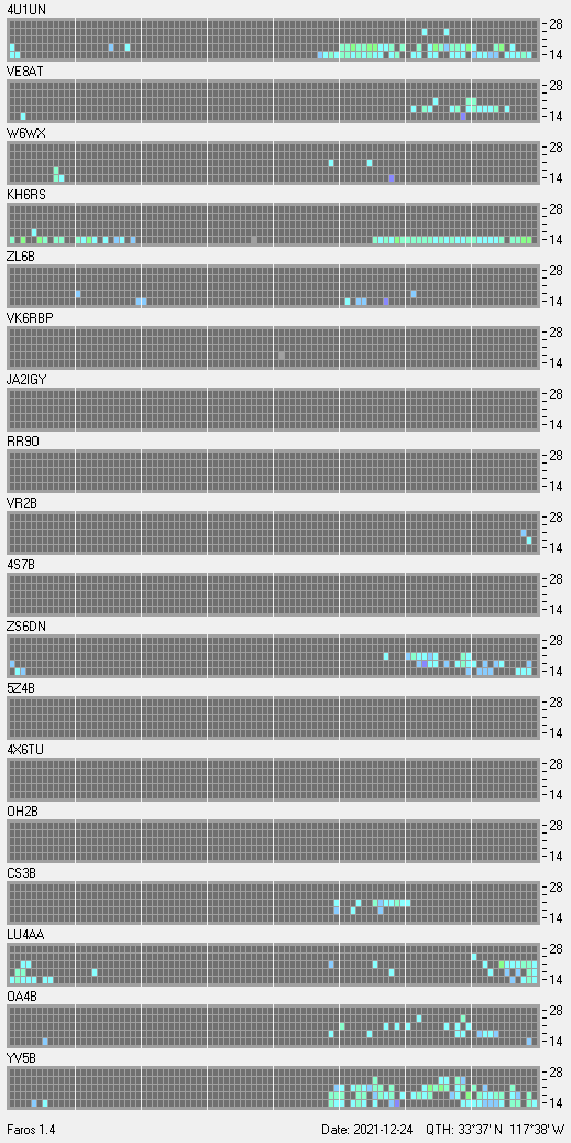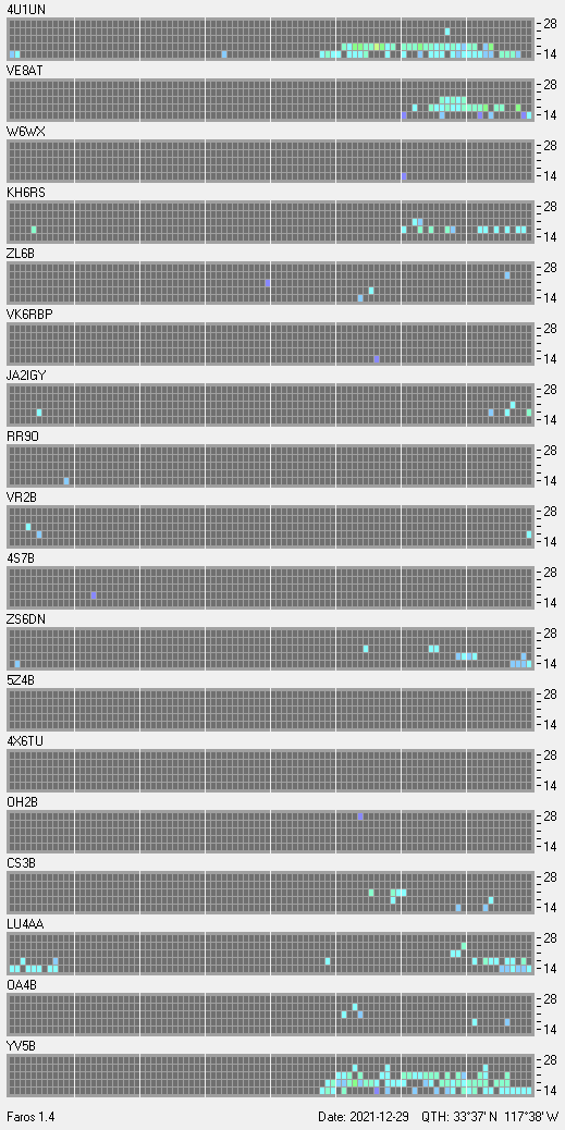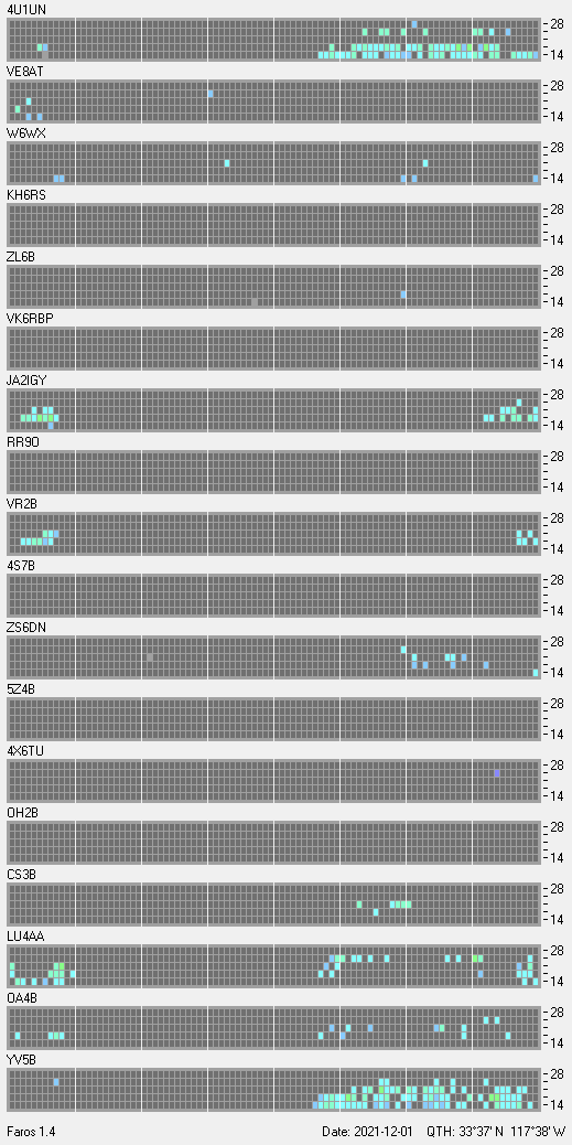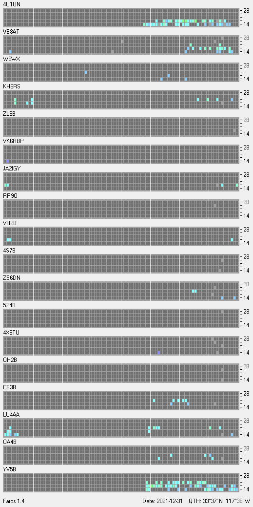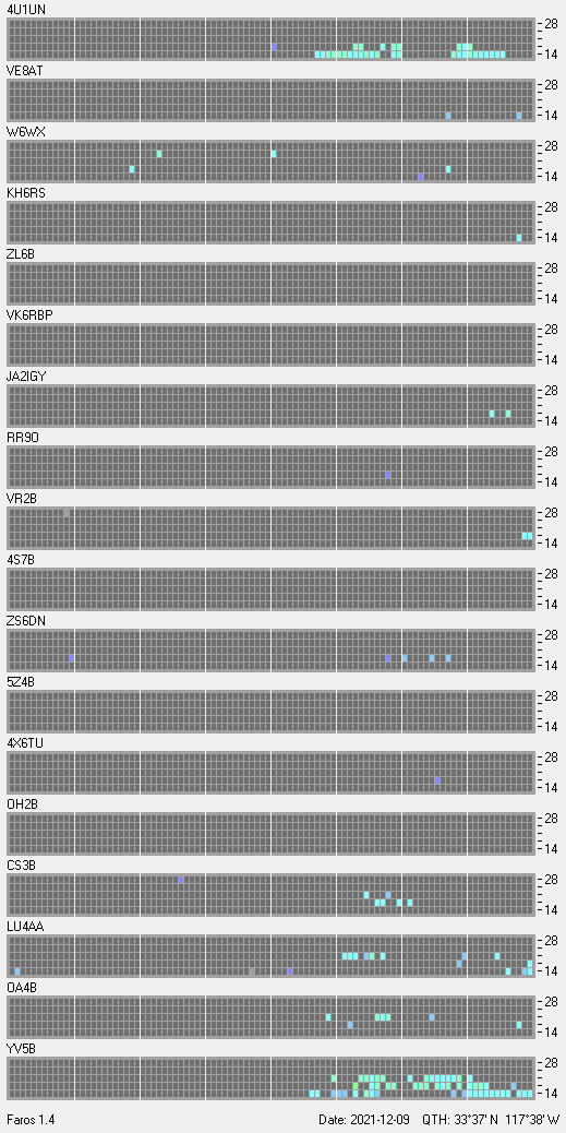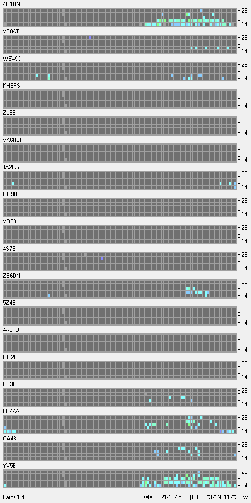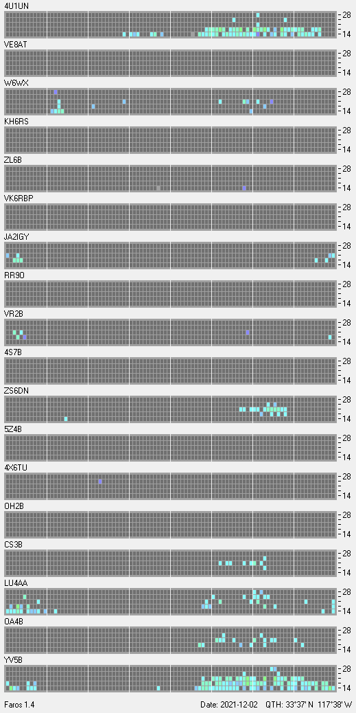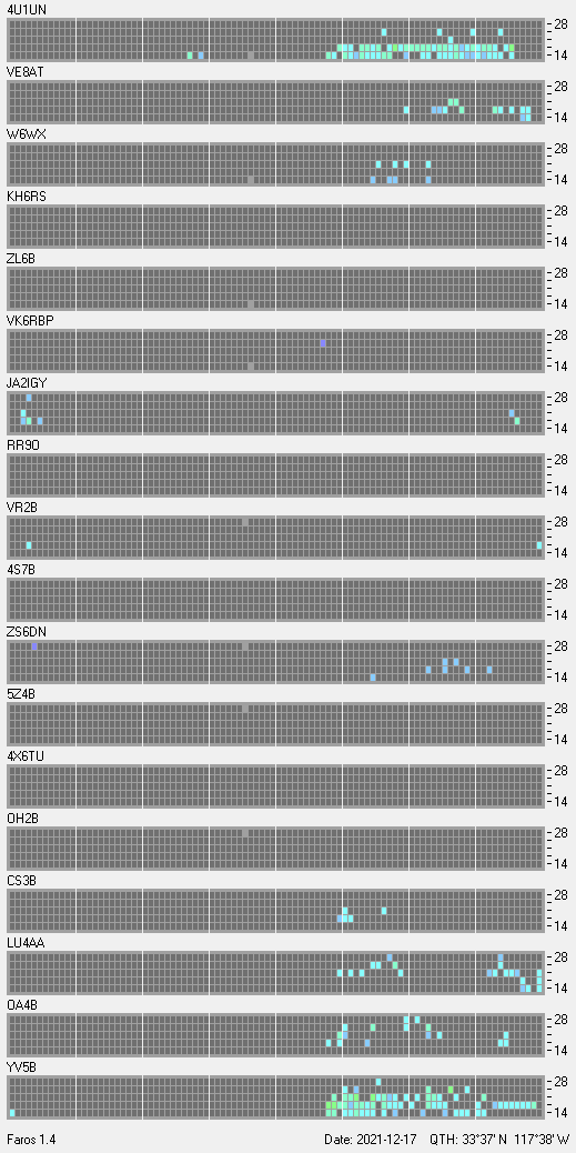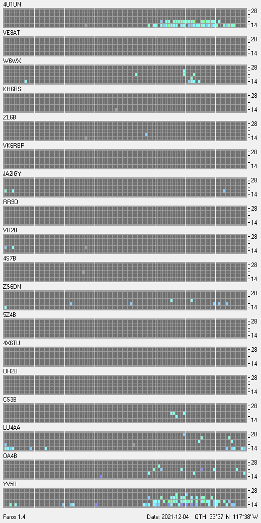 This is a record of NCDXF Beacon received at W6SI station using FAROS 1.4 monitor software. There are 18 beacons throughout the world, it records each ham band between 20m to 10m bands, including WARC bands. Each row on the given beacon block represents the band, 20, 17, 15, 12 and 10 meters, from the bottom to the top. The chart shows the relative signal strength (S/N ratio) of the received beacon. |