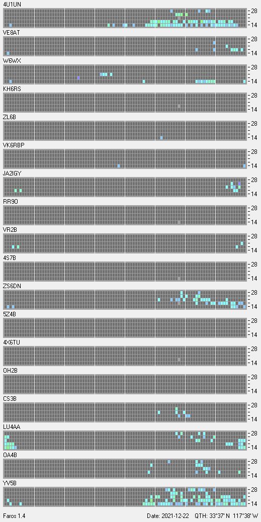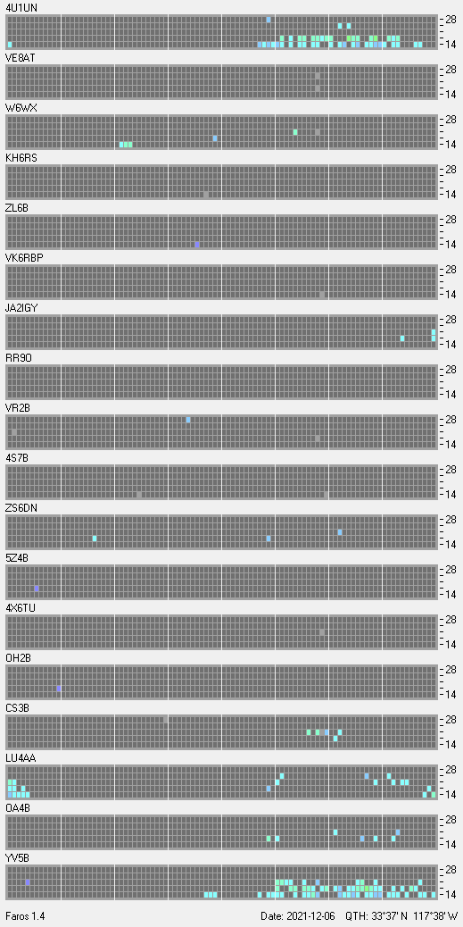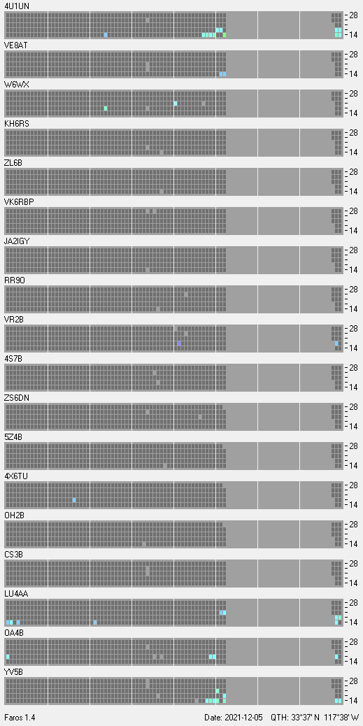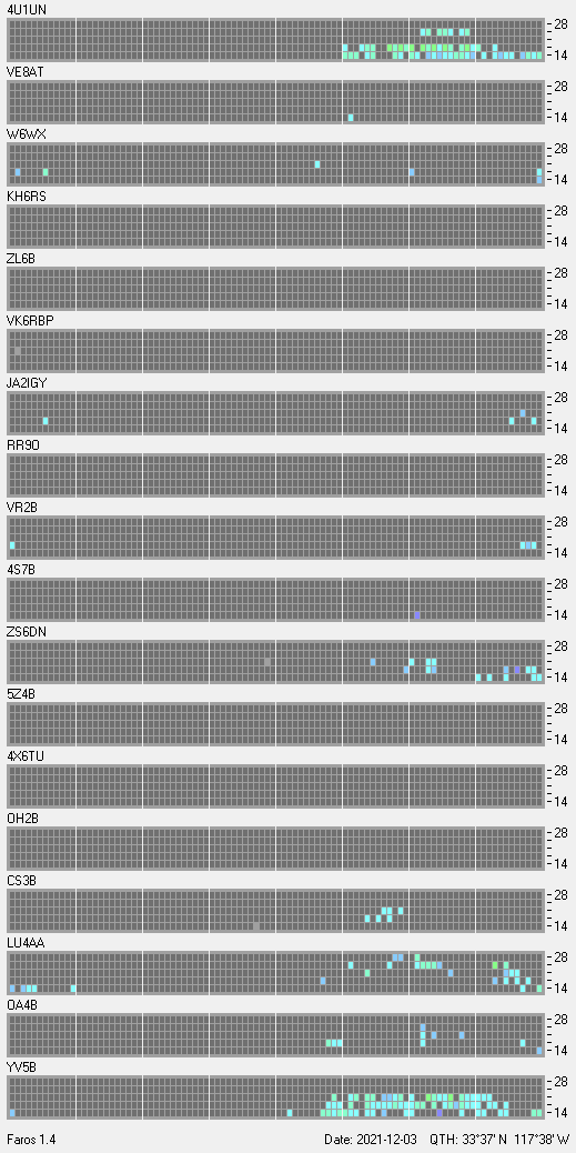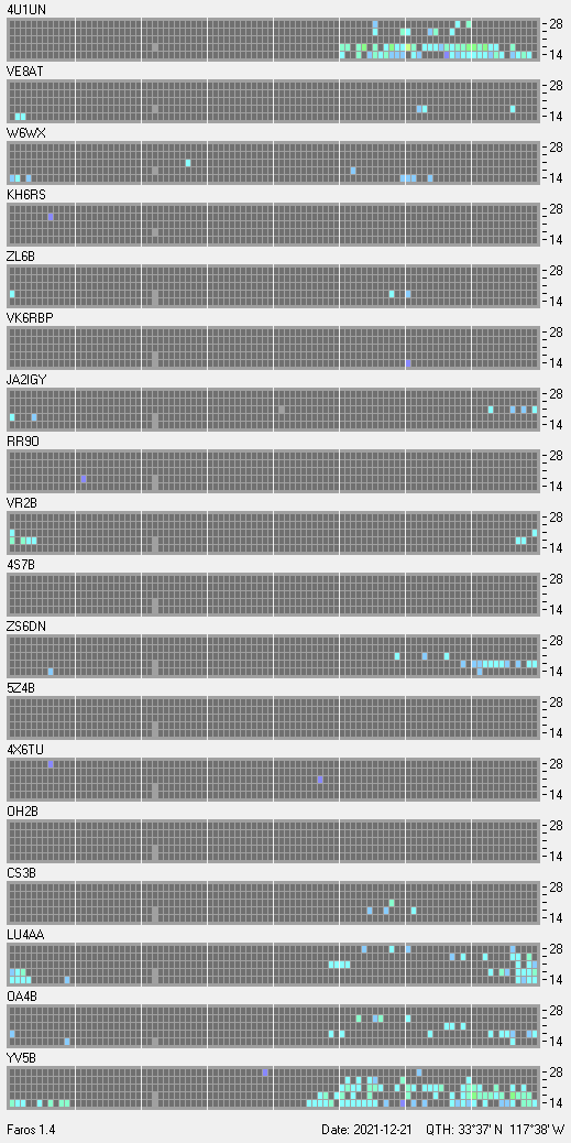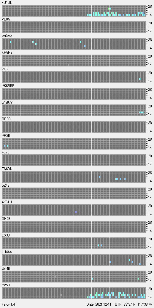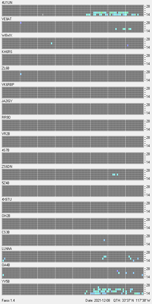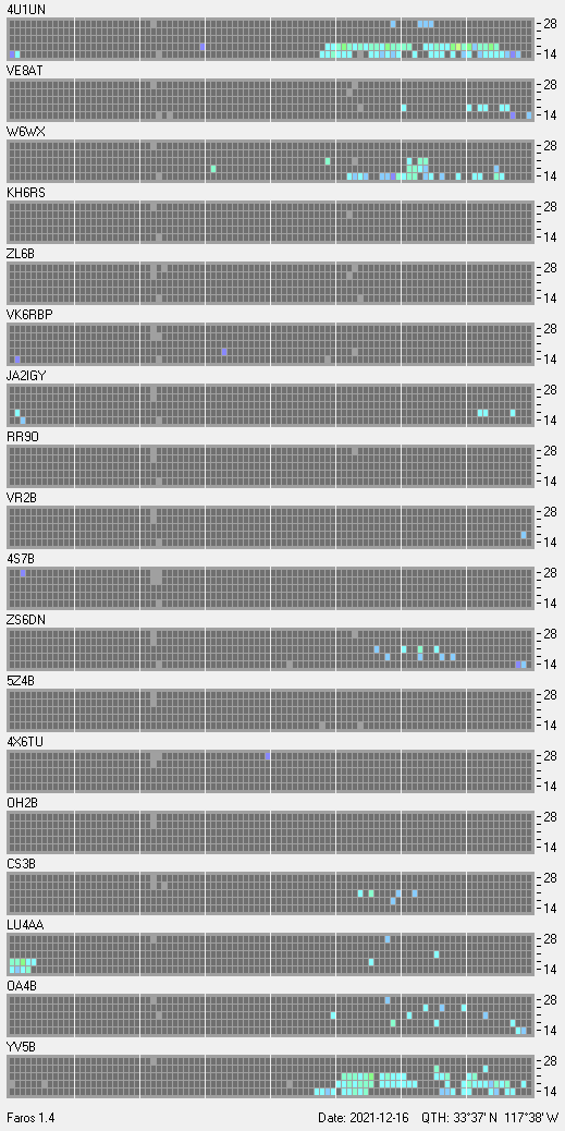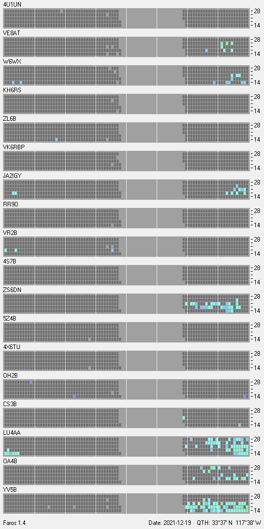 This is a record of NCDXF Beacon received at W6SI station using FAROS 1.4 monitor software. There are 18 beacons throughout the world, it records each ham band between 20m to 10m bands, including WARC bands. Each row on the given beacon block represents the band, 20, 17, 15, 12 and 10 meters, from the bottom to the top. The chart shows the relative signal strength (S/N ratio) of the received beacon. |
