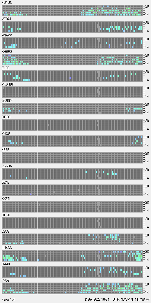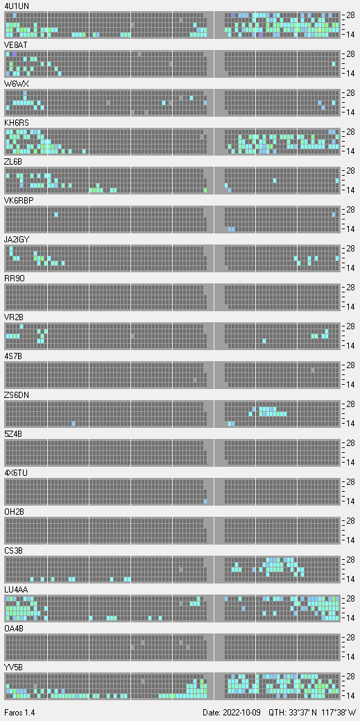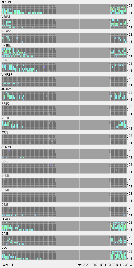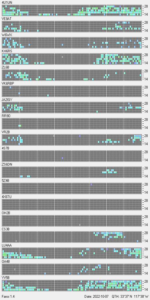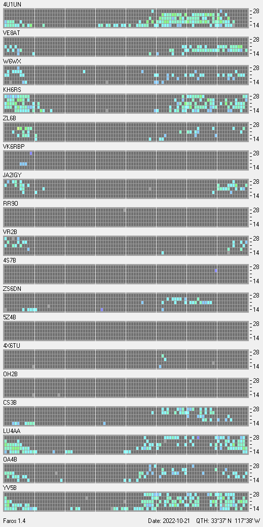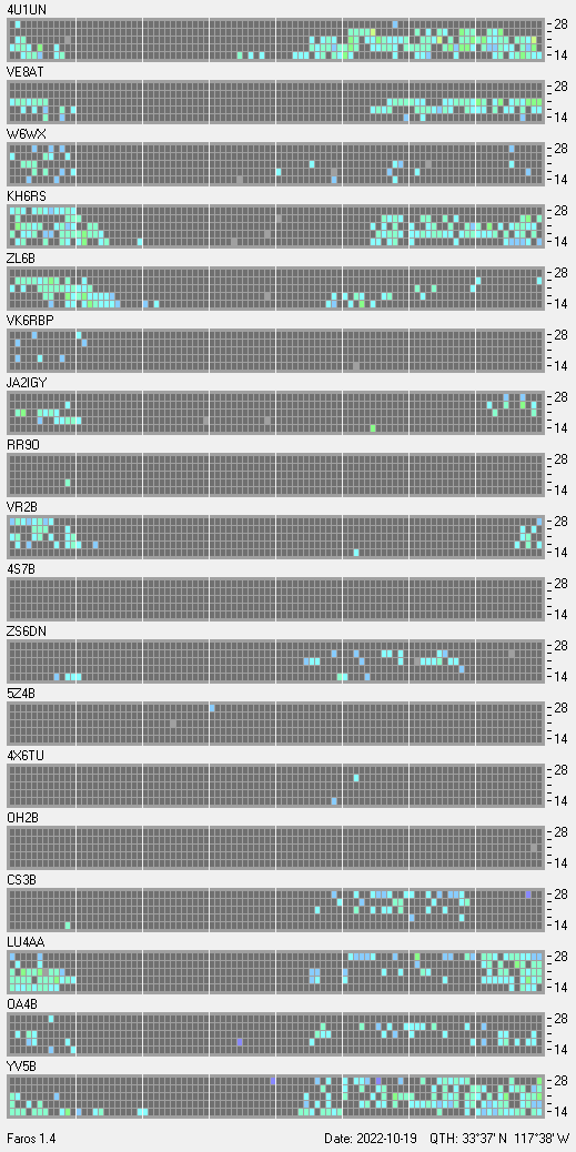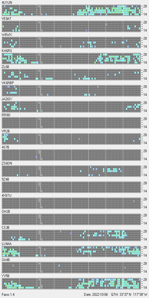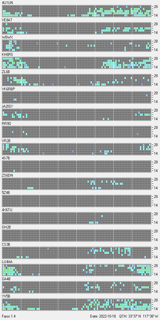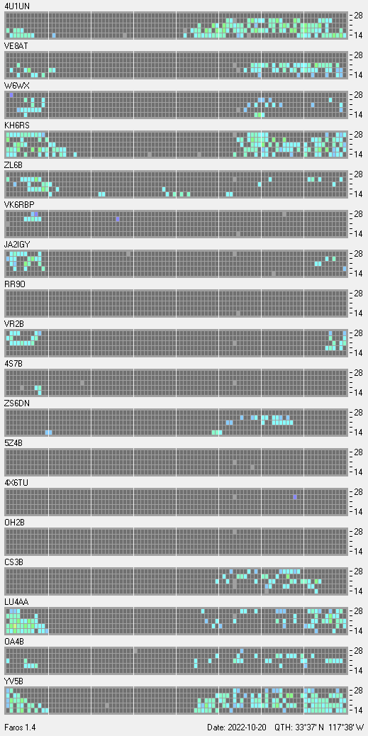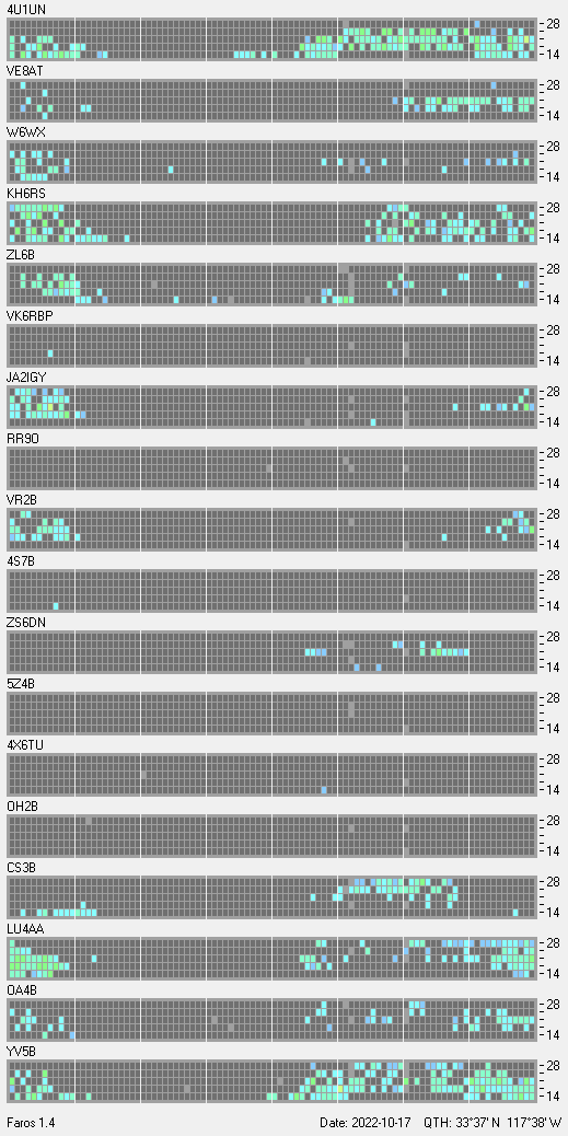 This is a record of NCDXF Beacon received at W6SI station using FAROS 1.4 monitor software. There are 18 beacons throughout the world, it records each ham band between 20m to 10m bands, including WARC bands. Each row on the given beacon block represents the band, 20, 17, 15, 12 and 10 meters, from the bottom to the top. The chart shows the relative signal strength (S/N ratio) of the received beacon. |