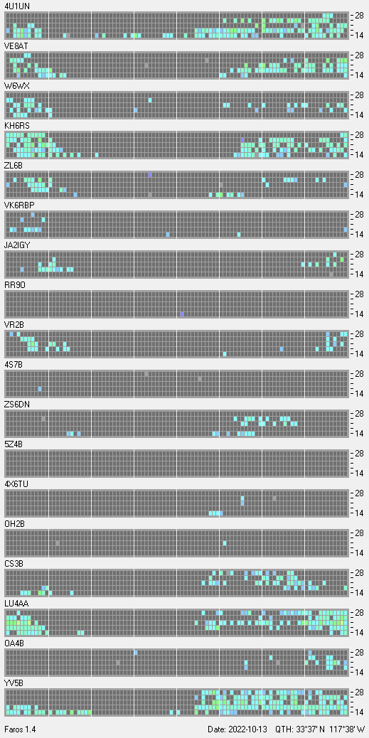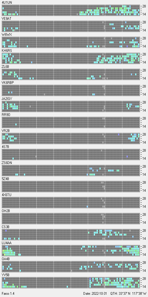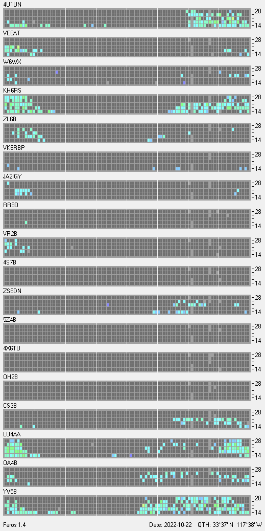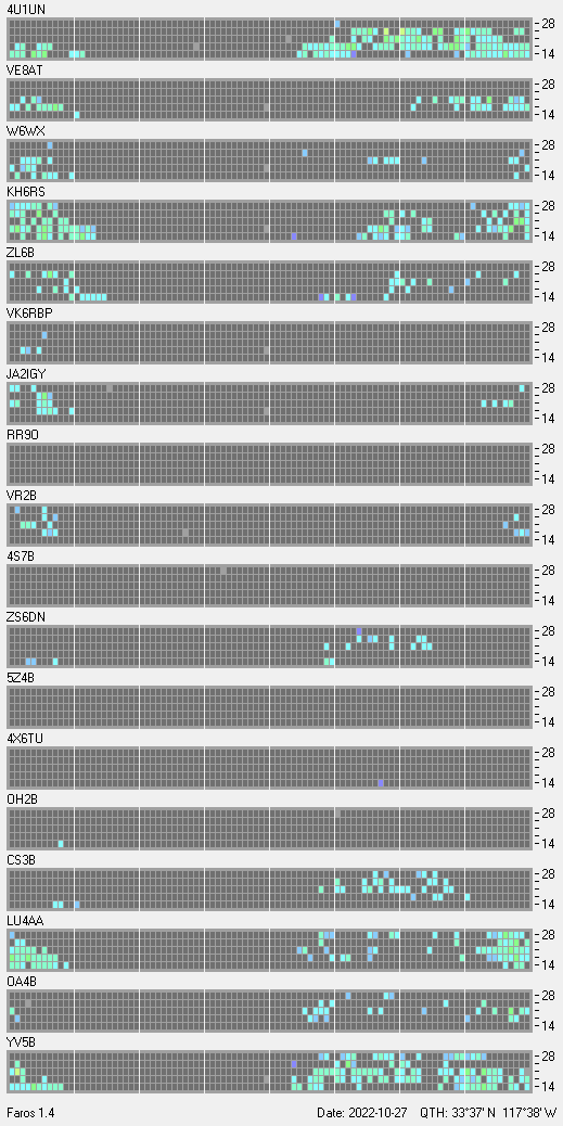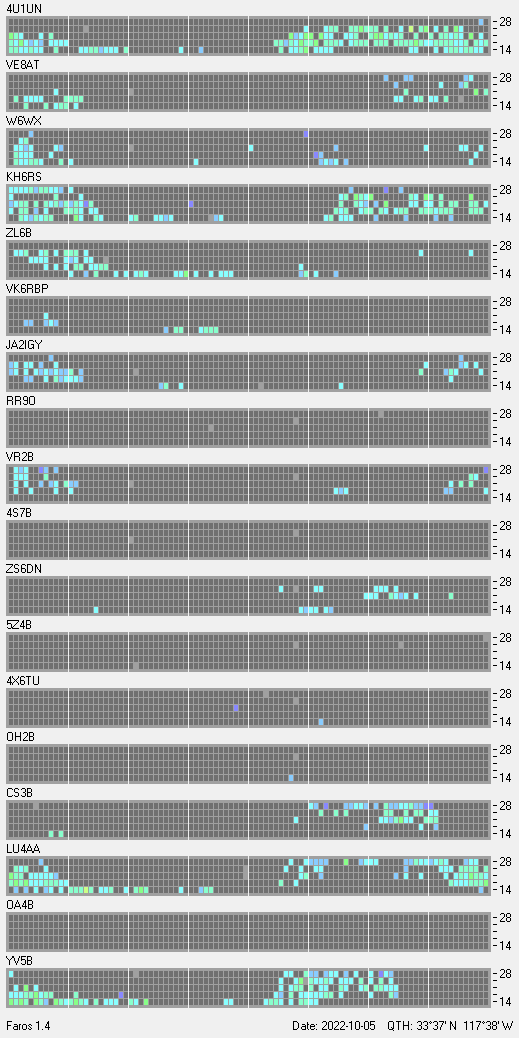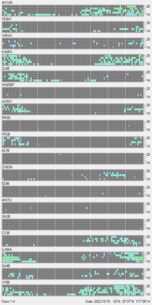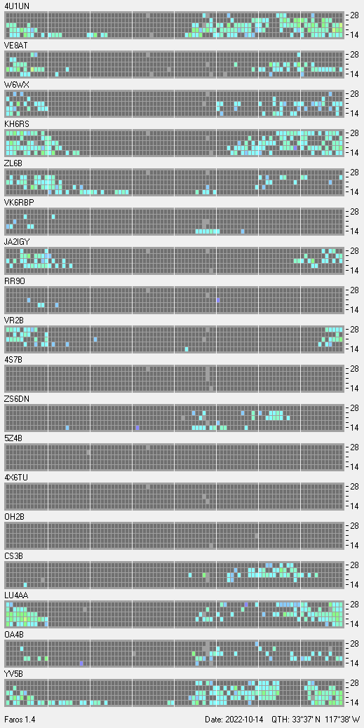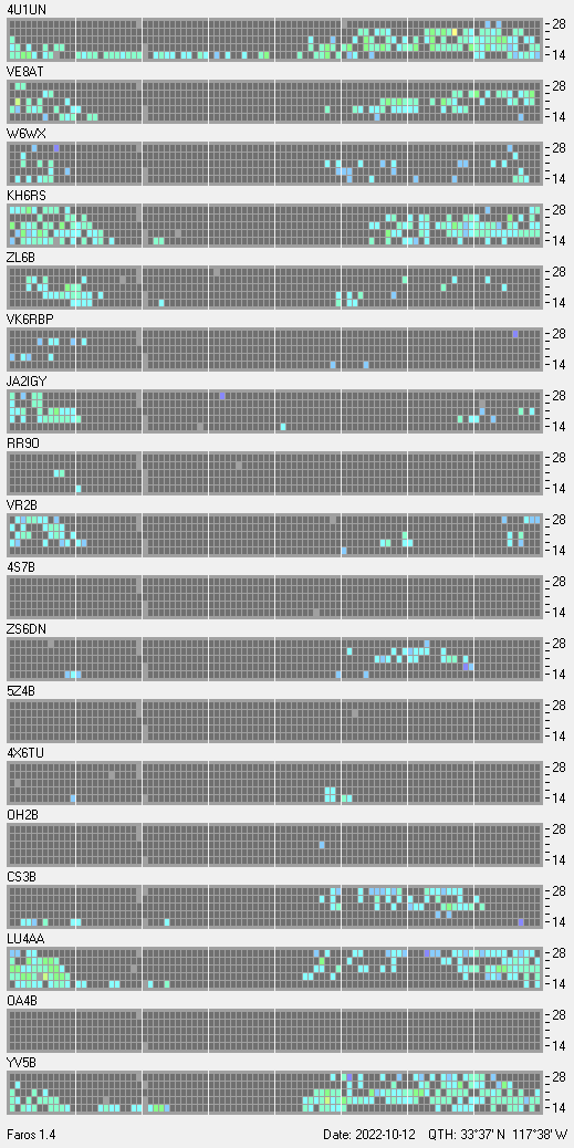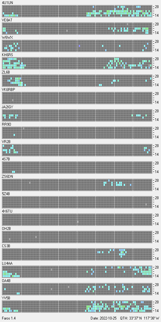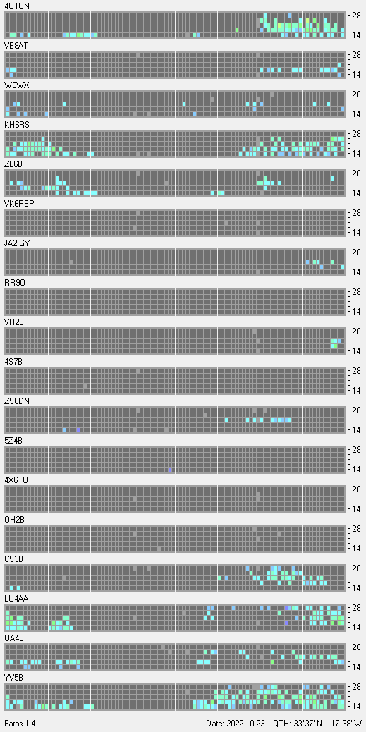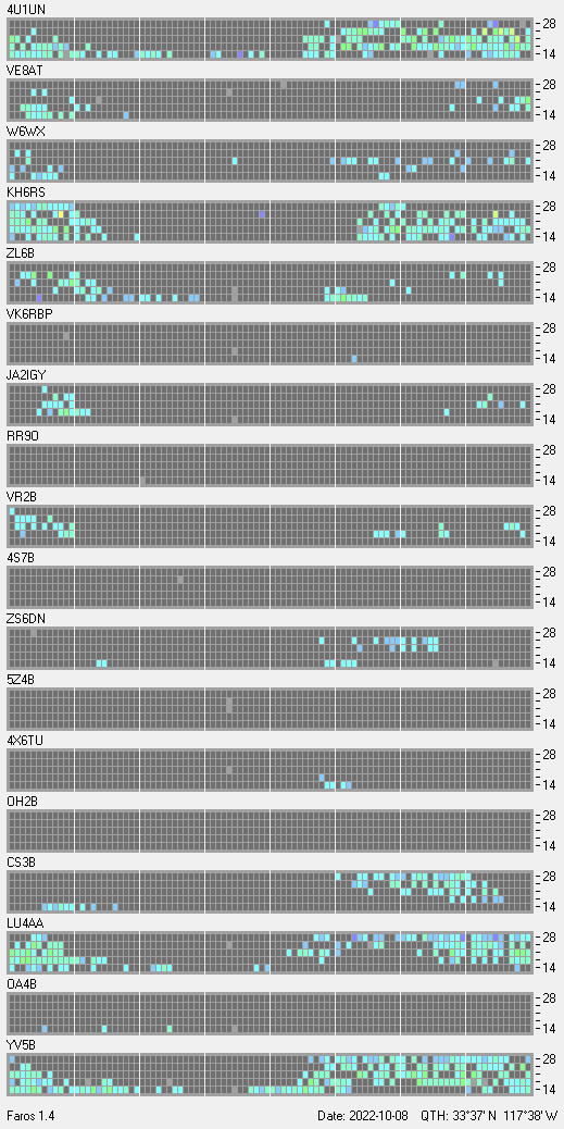 This is a record of NCDXF Beacon received at W6SI station using FAROS 1.4 monitor software. There are 18 beacons throughout the world, it records each ham band between 20m to 10m bands, including WARC bands. Each row on the given beacon block represents the band, 20, 17, 15, 12 and 10 meters, from the bottom to the top. The chart shows the relative signal strength (S/N ratio) of the received beacon. |