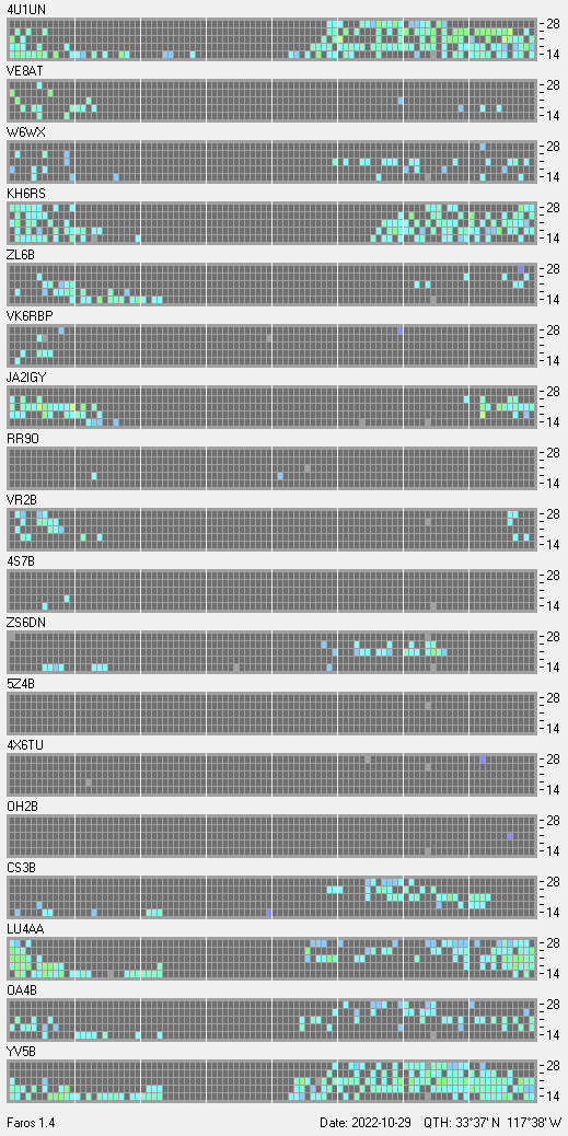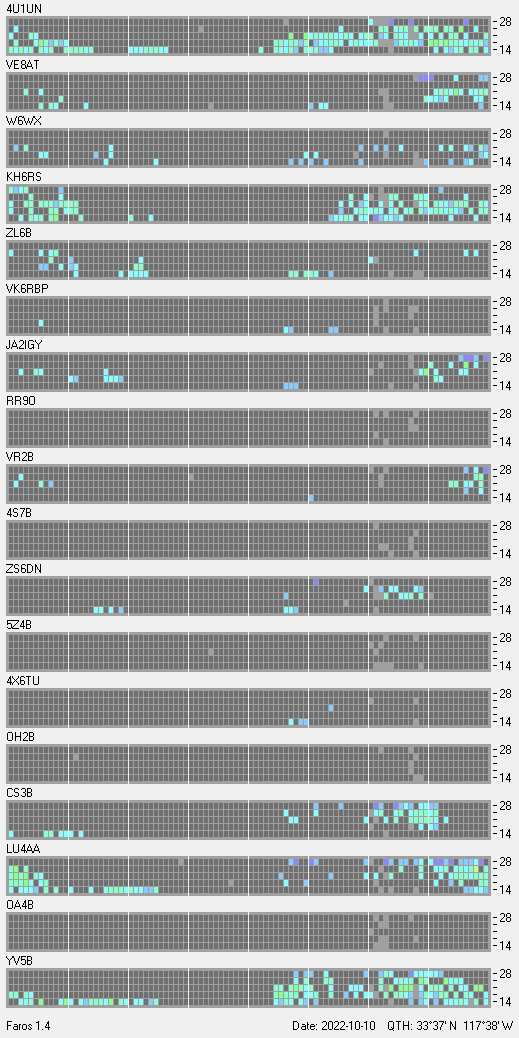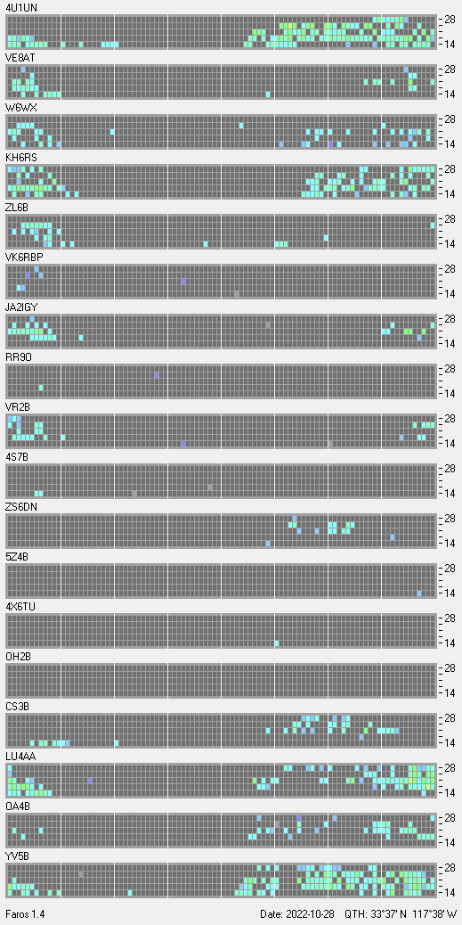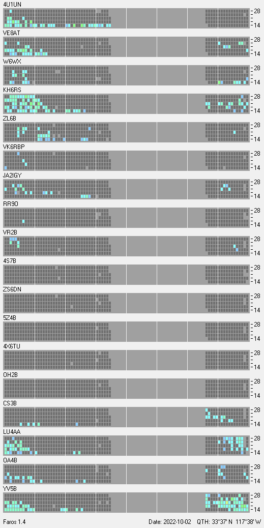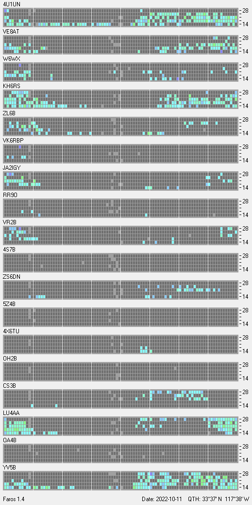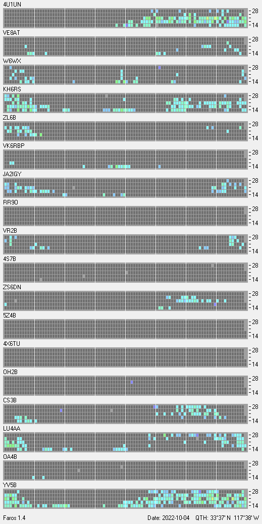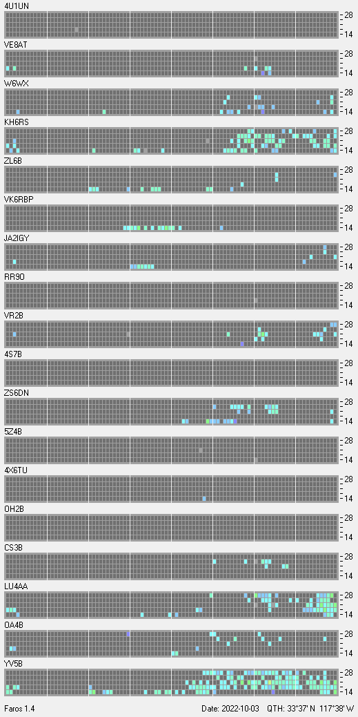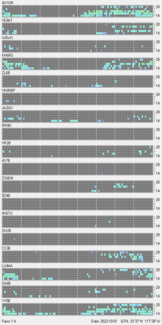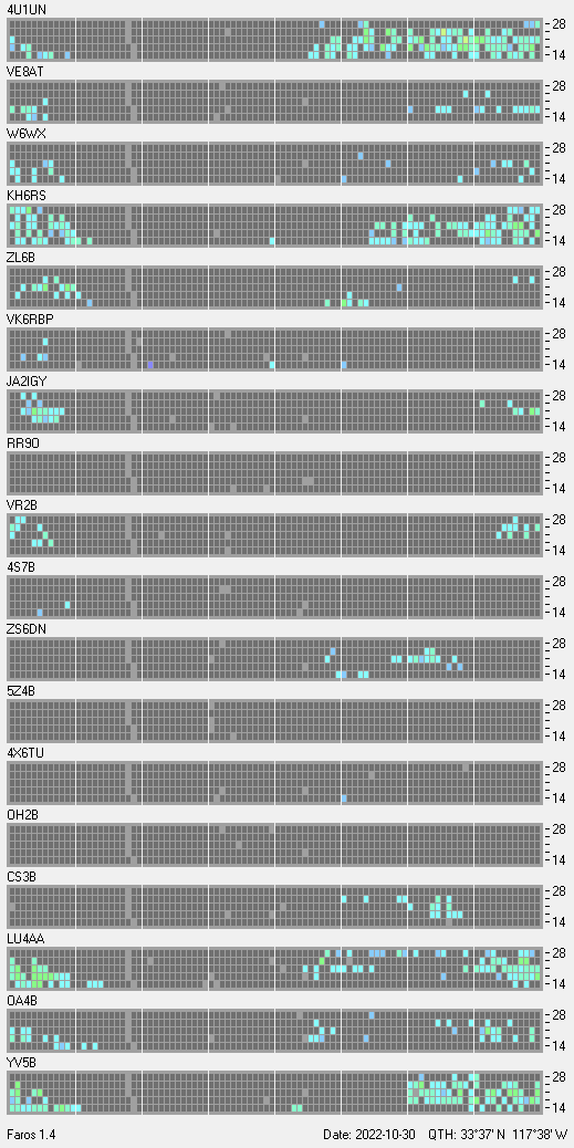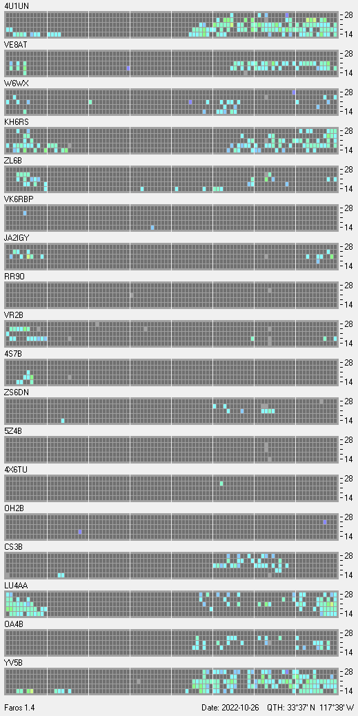This is a record of NCDXF Beacon received at W6SI station using FAROS 1.4 monitor software. There are 18 beacons throughout the world, it records each ham band between 20m to 10m bands, including WARC bands. Each row on the given beacon block represents the band, 20, 17, 15, 12 and 10 meters, from the bottom to the top. The chart shows the relative signal strength (S/N ratio) of the received beacon. |
