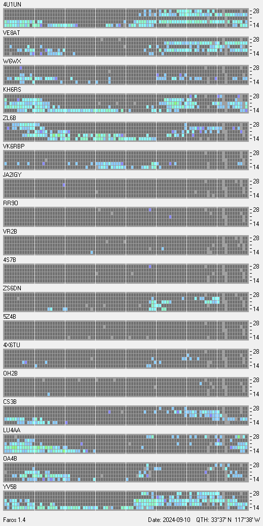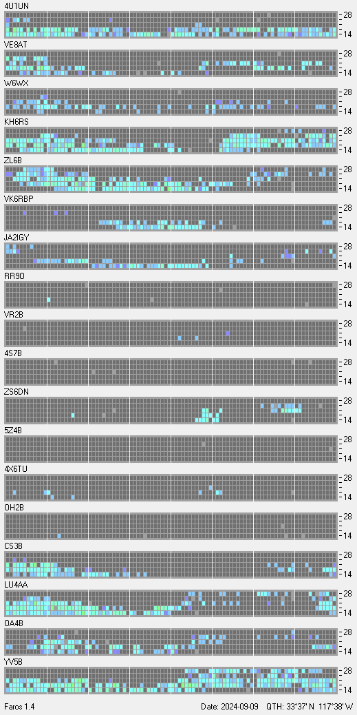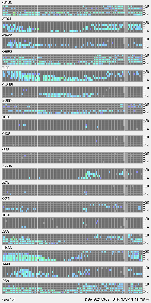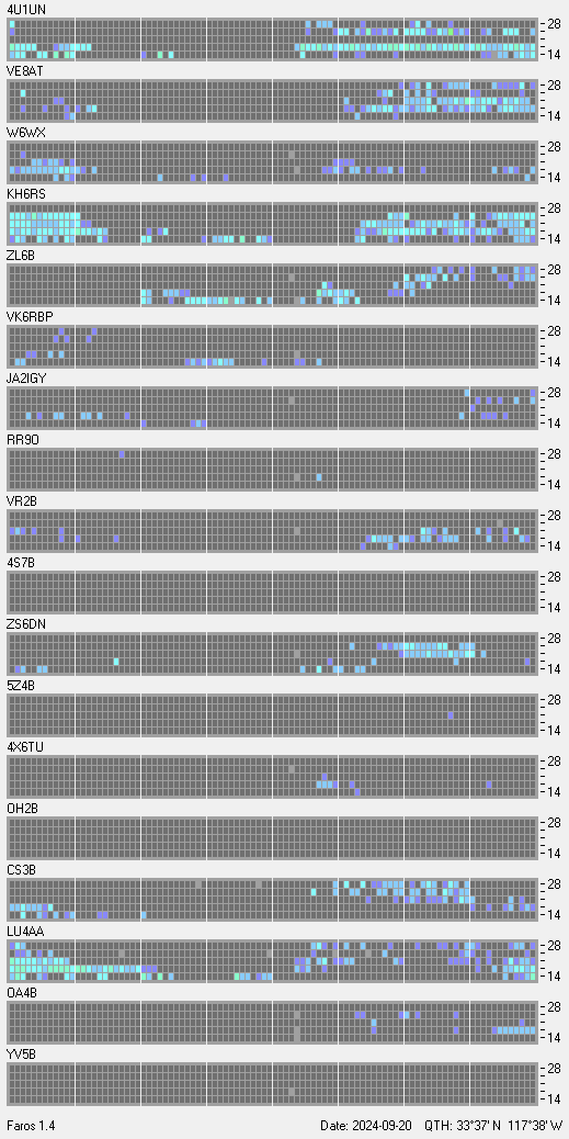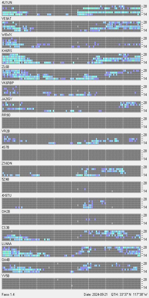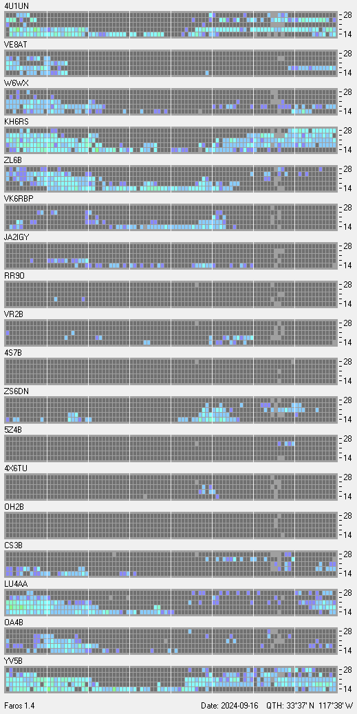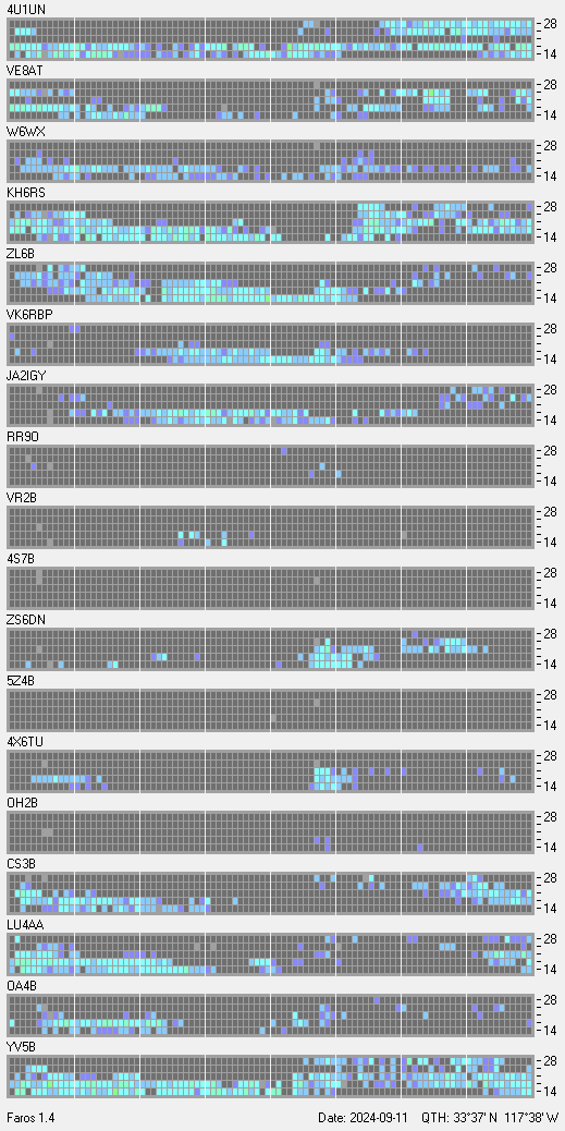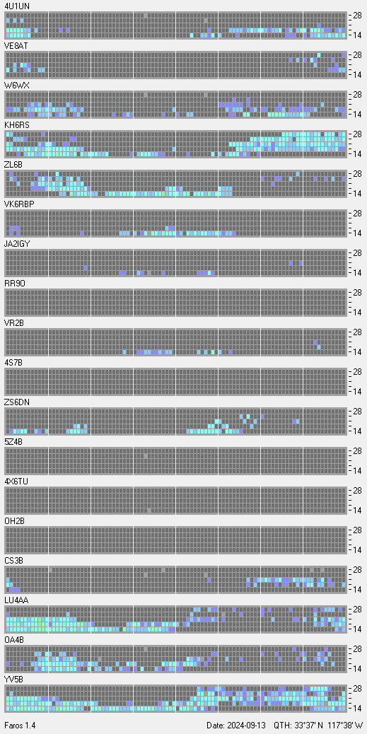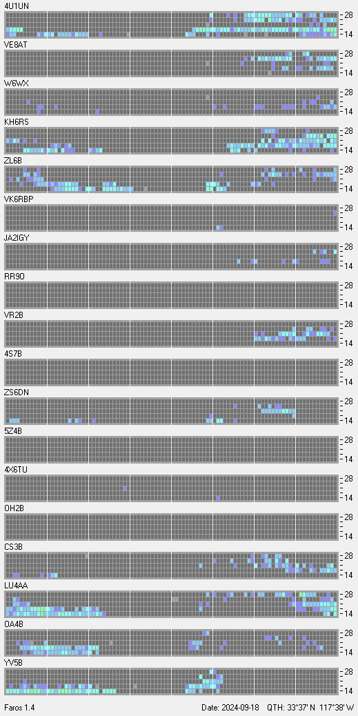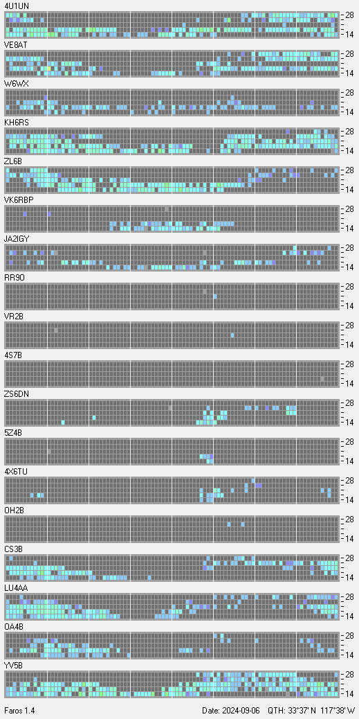 This is a record of NCDXF Beacon received at W6SI station using FAROS 1.4 monitor software. There are 18 beacons throughout the world, it records each ham band between 20m to 10m bands, including WARC bands. Each row on the given beacon block represents the band, 20, 17, 15, 12 and 10 meters, from the bottom to the top. The chart shows the relative signal strength (S/N ratio) of the received beacon. |