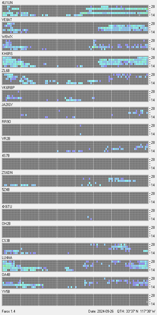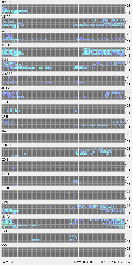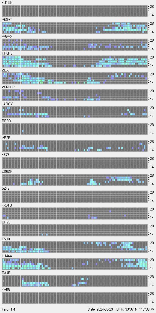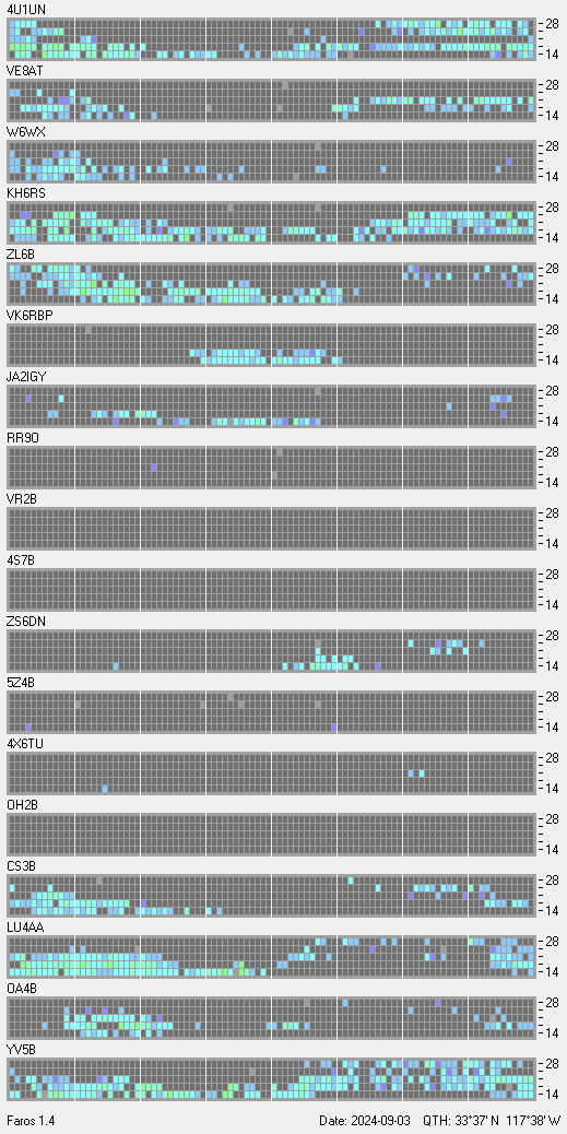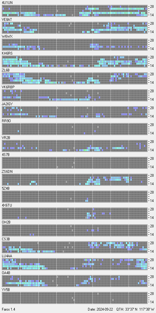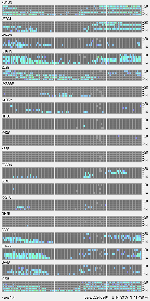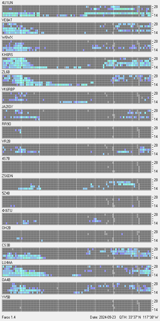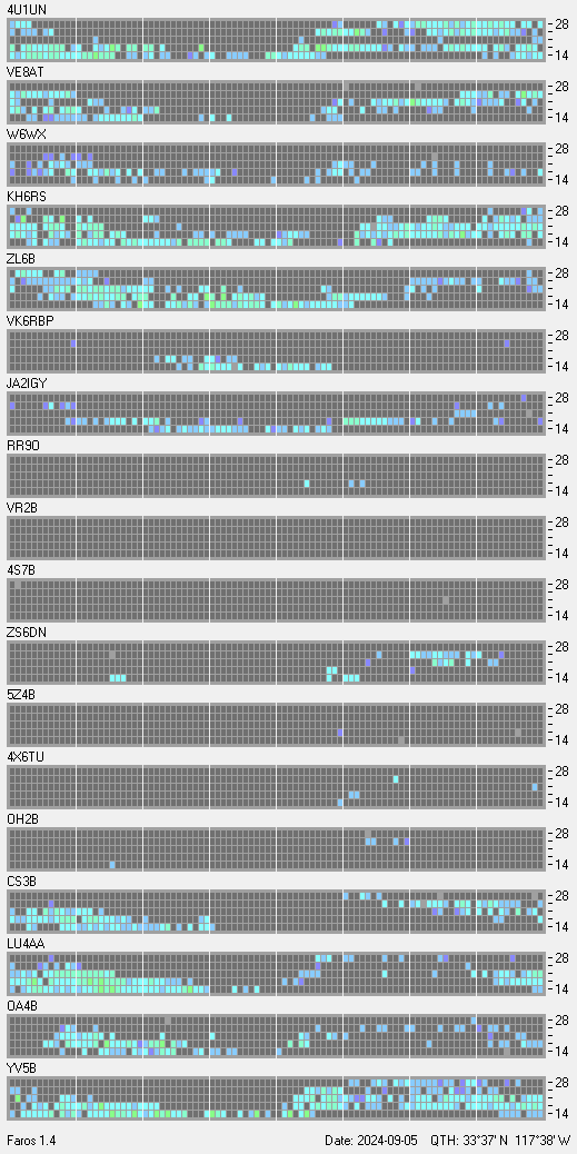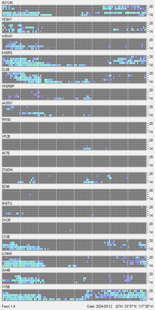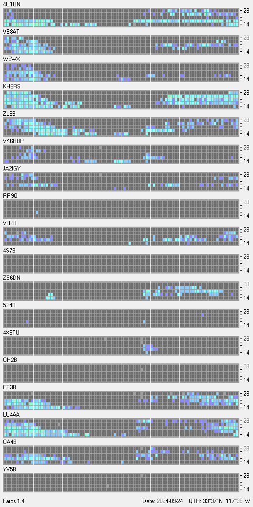 This is a record of NCDXF Beacon received at W6SI station using FAROS 1.4 monitor software. There are 18 beacons throughout the world, it records each ham band between 20m to 10m bands, including WARC bands. Each row on the given beacon block represents the band, 20, 17, 15, 12 and 10 meters, from the bottom to the top. The chart shows the relative signal strength (S/N ratio) of the received beacon. |