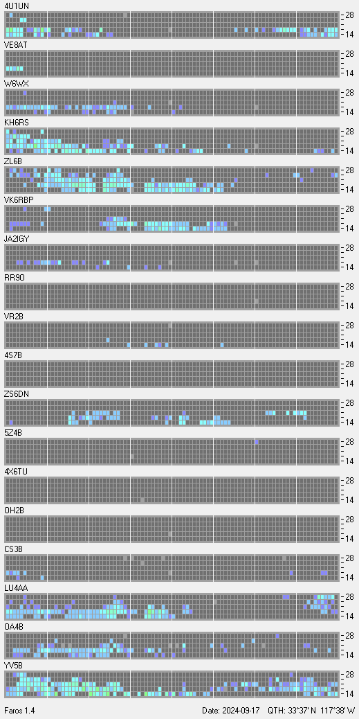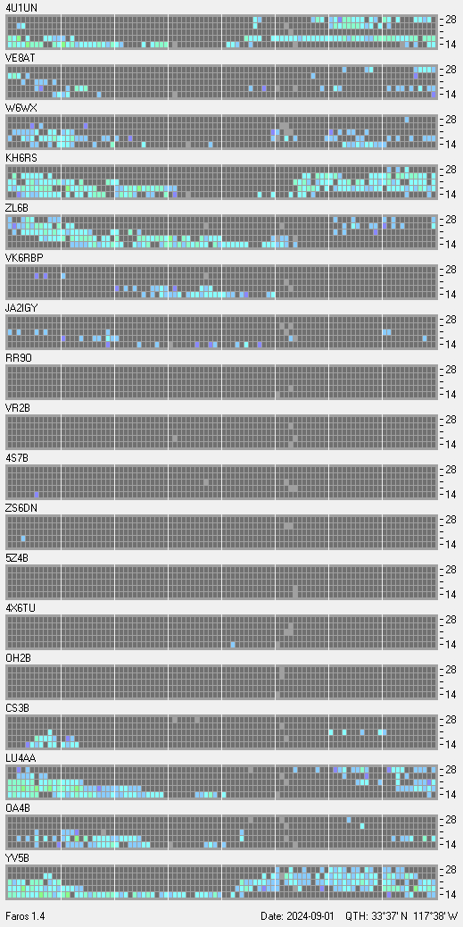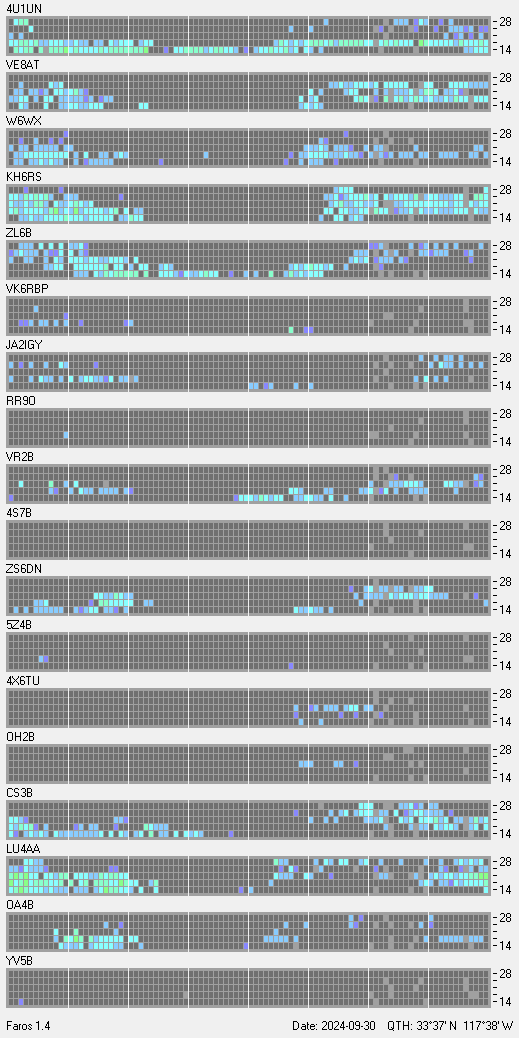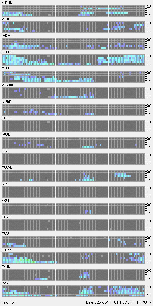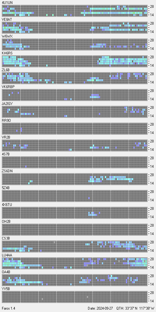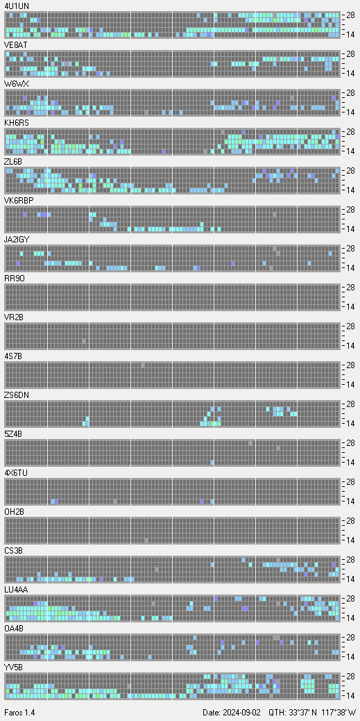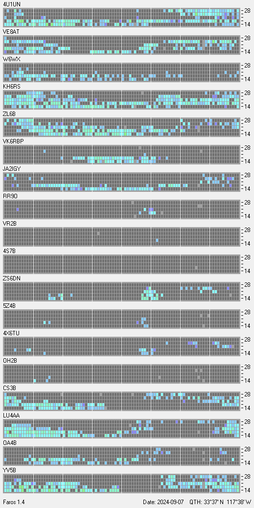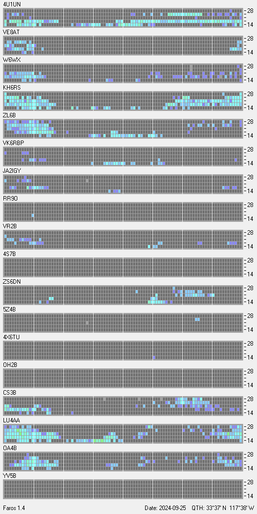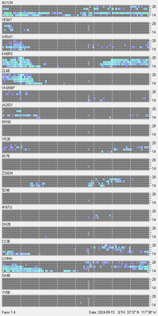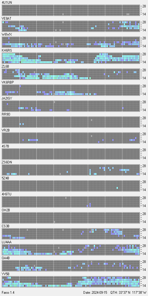 This is a record of NCDXF Beacon received at W6SI station using FAROS 1.4 monitor software. There are 18 beacons throughout the world, it records each ham band between 20m to 10m bands, including WARC bands. Each row on the given beacon block represents the band, 20, 17, 15, 12 and 10 meters, from the bottom to the top. The chart shows the relative signal strength (S/N ratio) of the received beacon. |