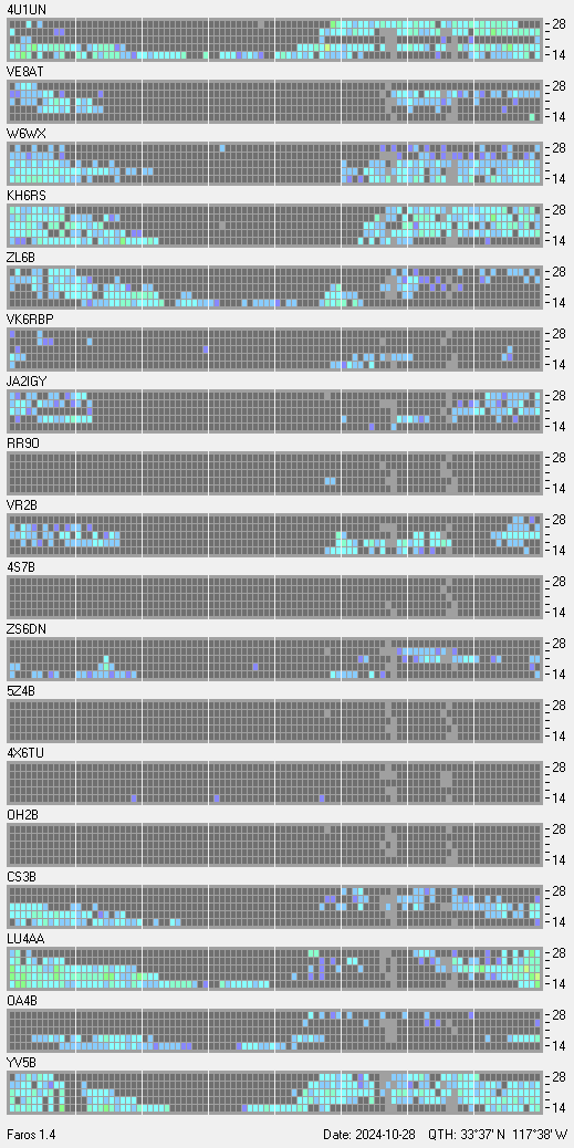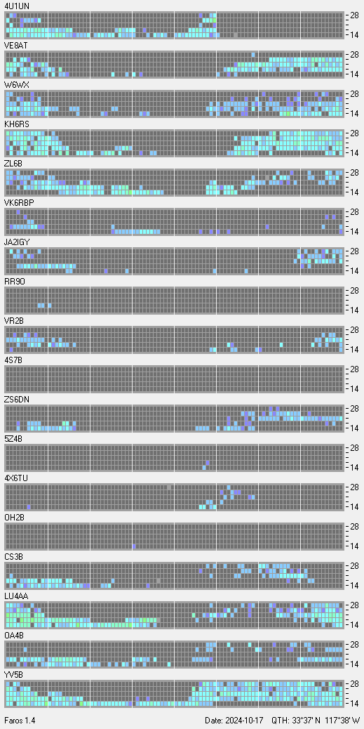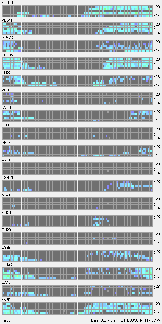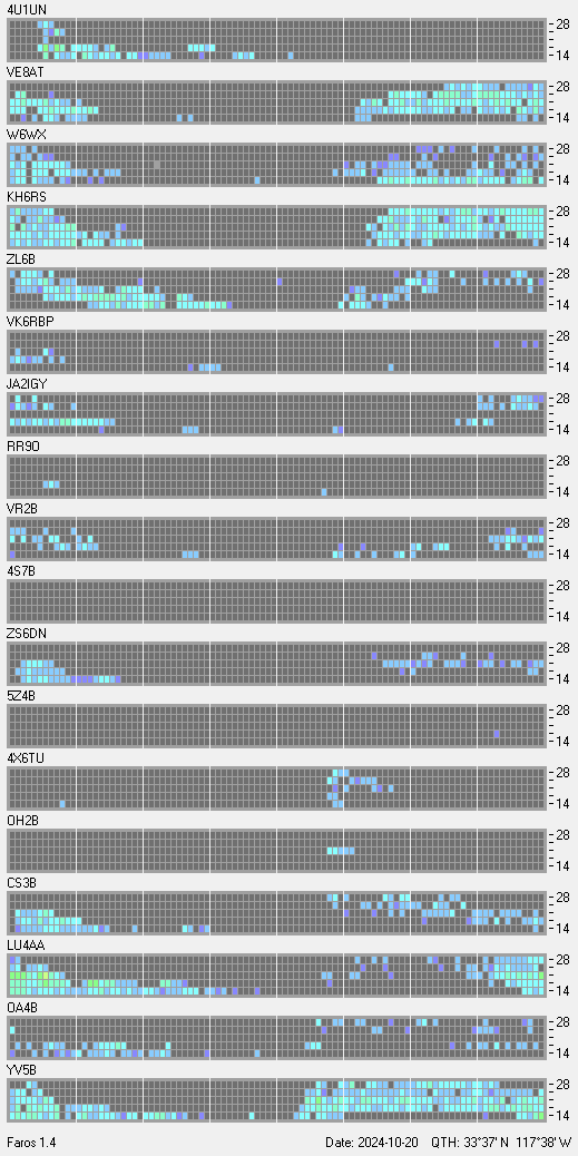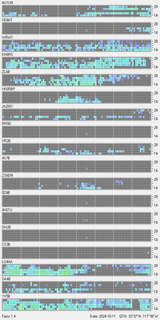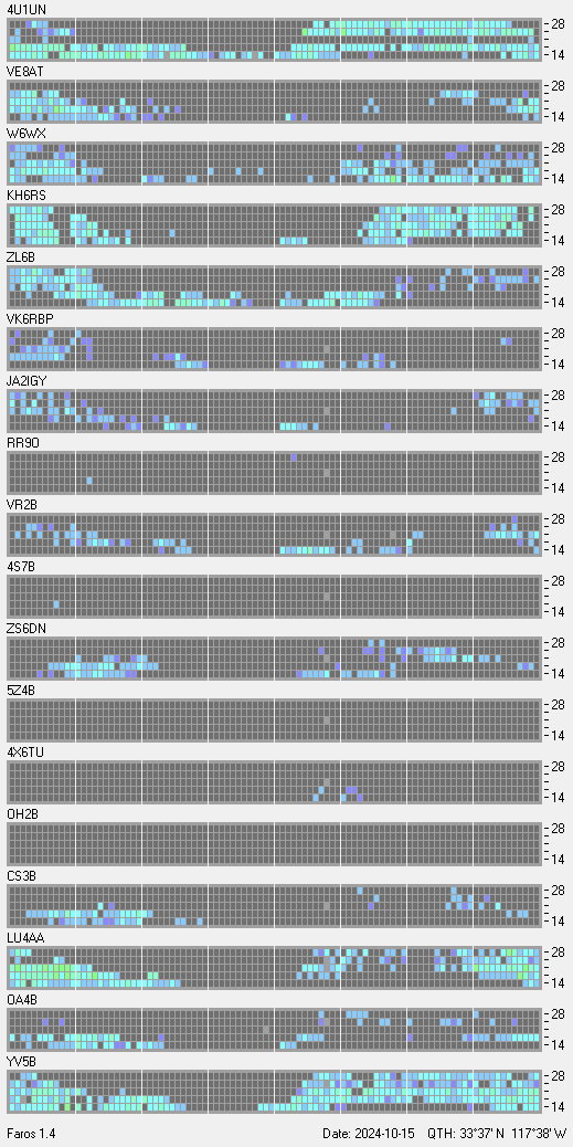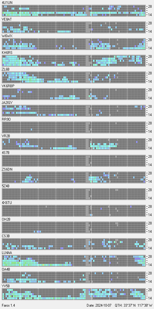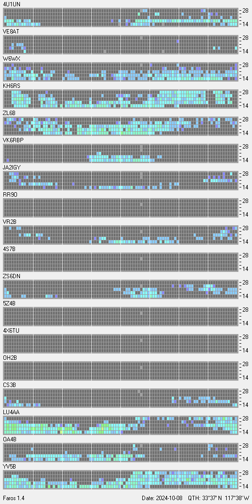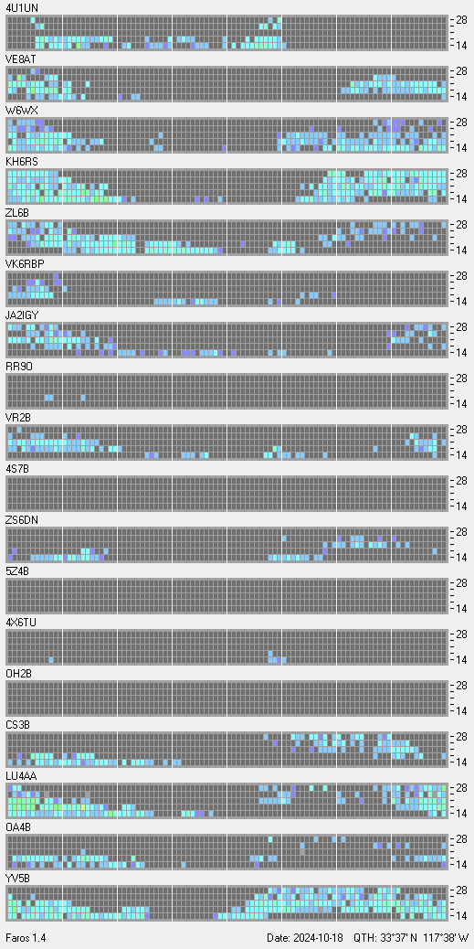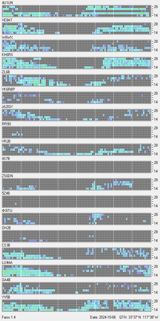 This is a record of NCDXF Beacon received at W6SI station using FAROS 1.4 monitor software. There are 18 beacons throughout the world, it records each ham band between 20m to 10m bands, including WARC bands. Each row on the given beacon block represents the band, 20, 17, 15, 12 and 10 meters, from the bottom to the top. The chart shows the relative signal strength (S/N ratio) of the received beacon. |