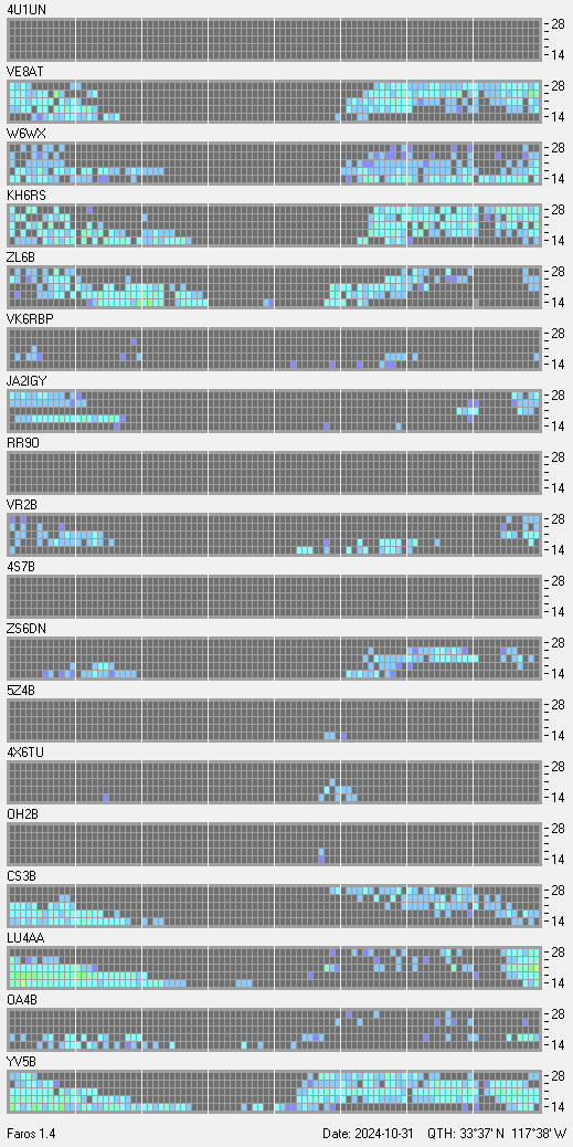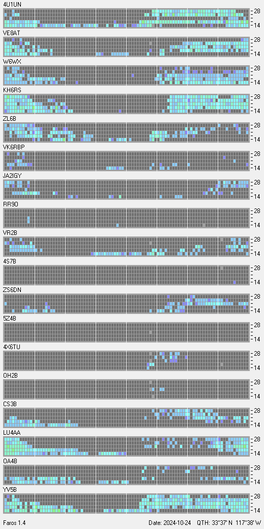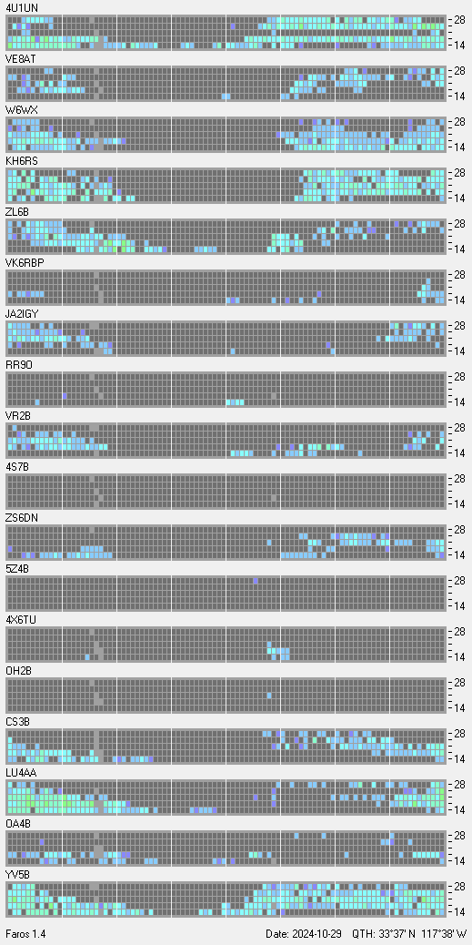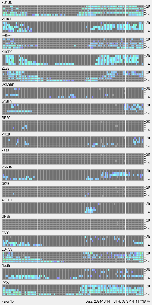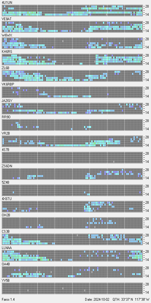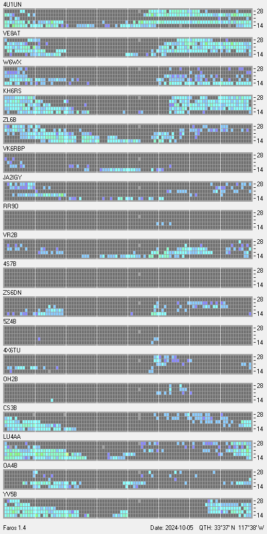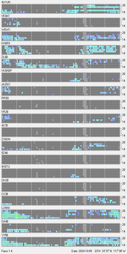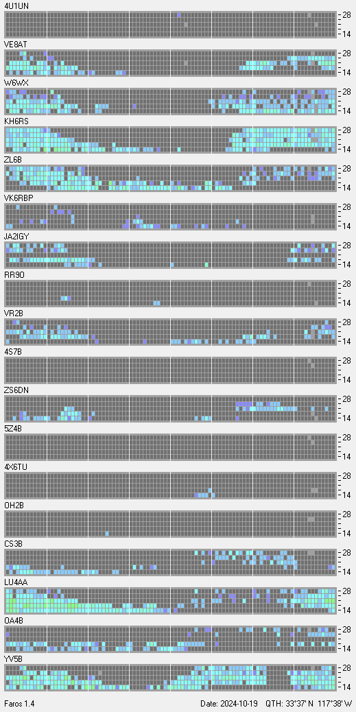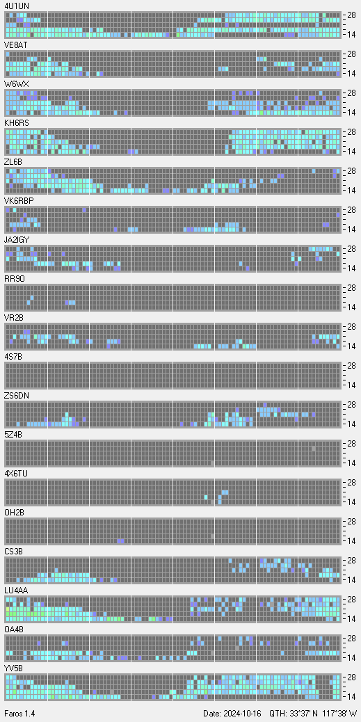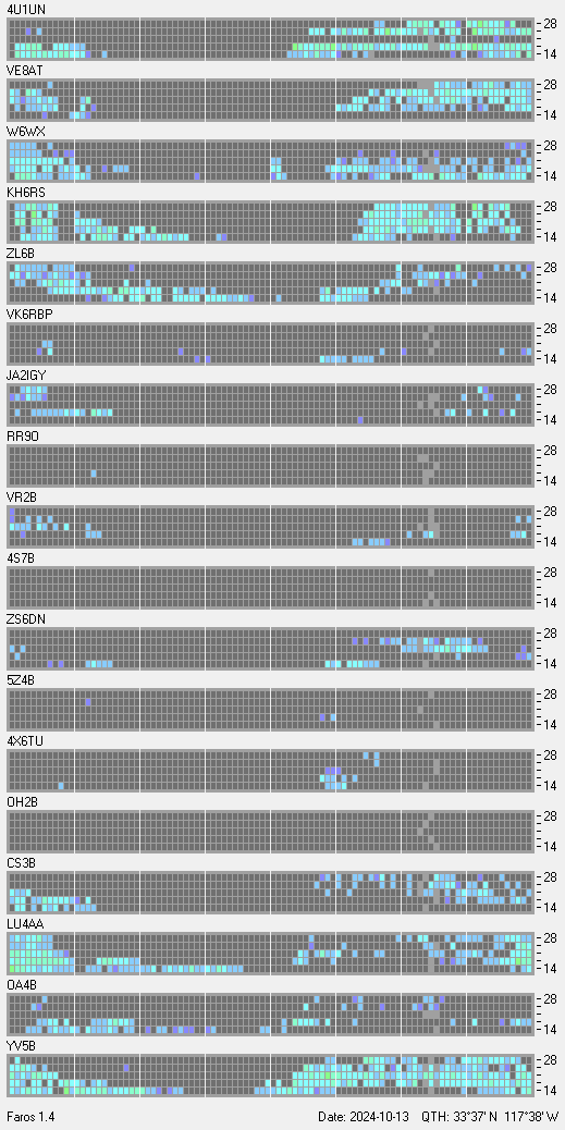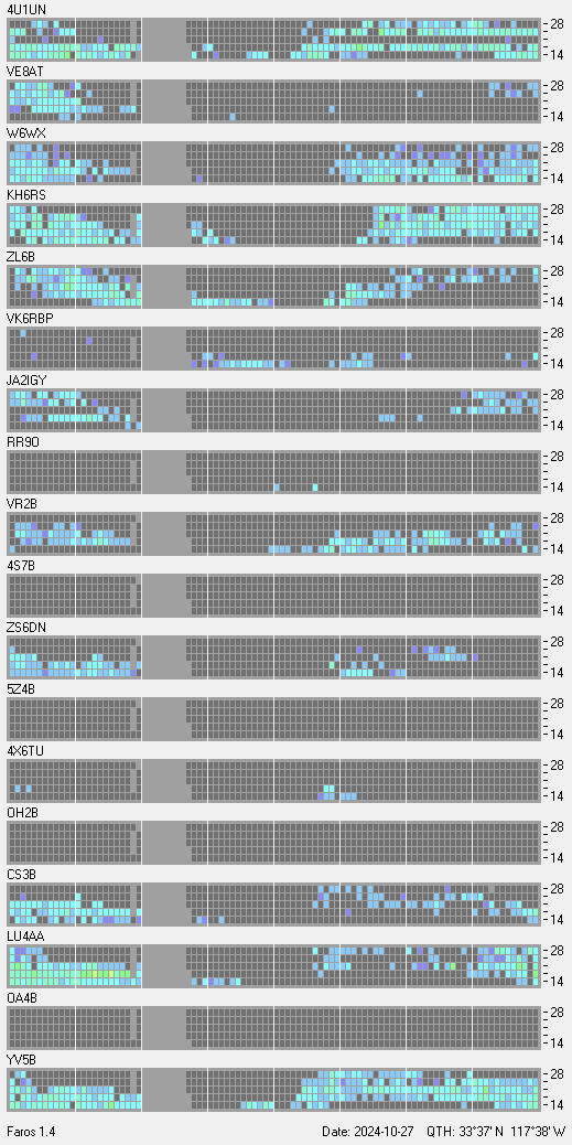 This is a record of NCDXF Beacon received at W6SI station using FAROS 1.4 monitor software. There are 18 beacons throughout the world, it records each ham band between 20m to 10m bands, including WARC bands. Each row on the given beacon block represents the band, 20, 17, 15, 12 and 10 meters, from the bottom to the top. The chart shows the relative signal strength (S/N ratio) of the received beacon. |