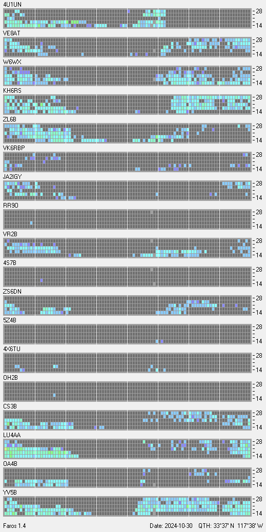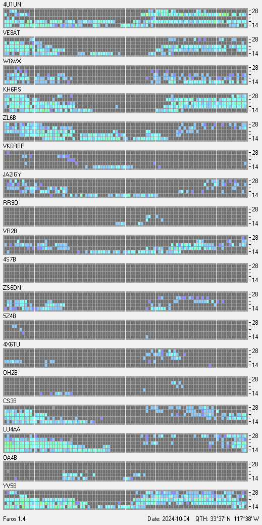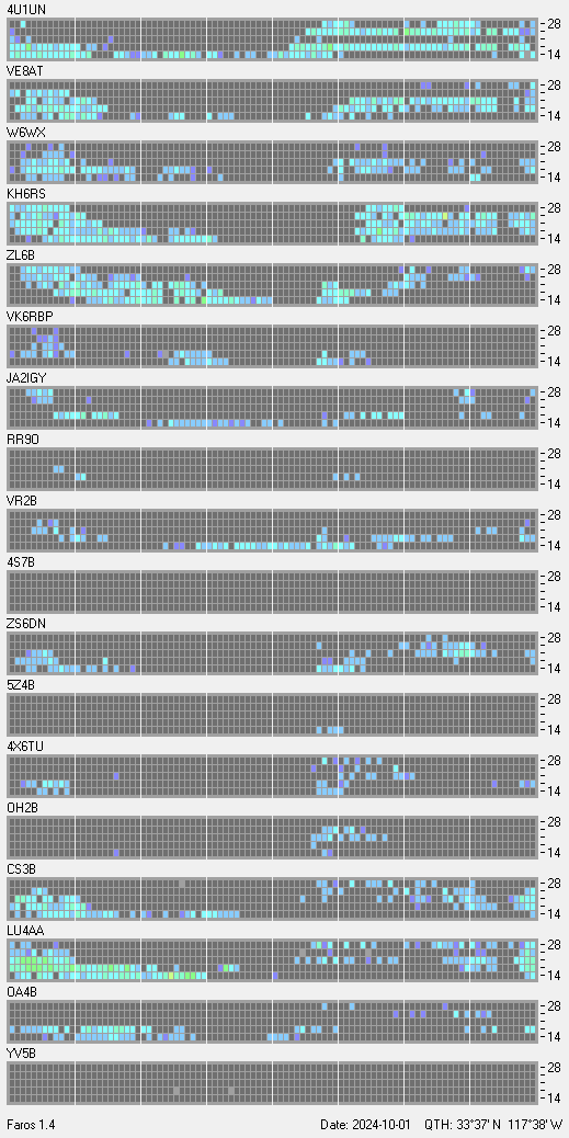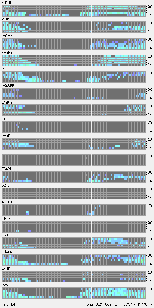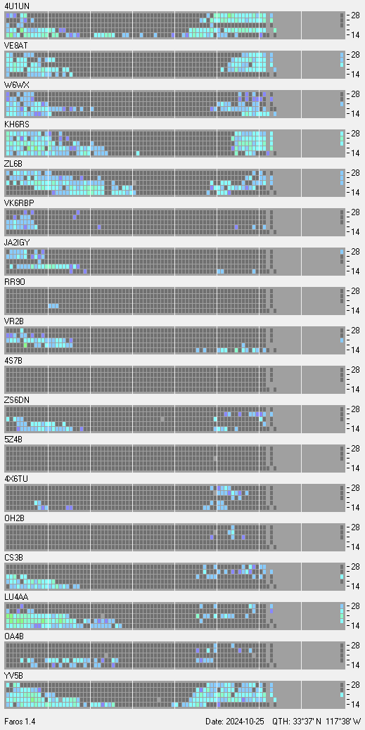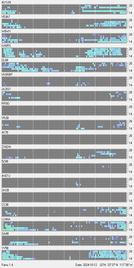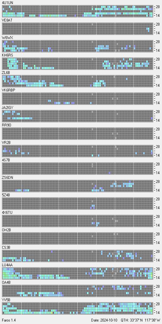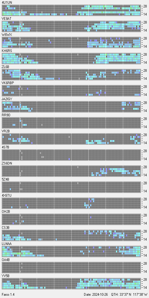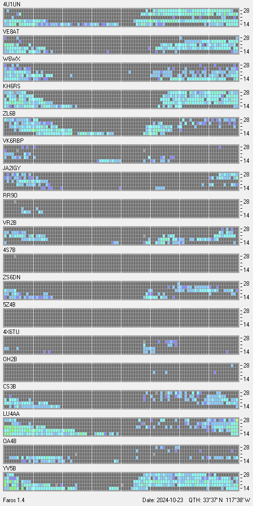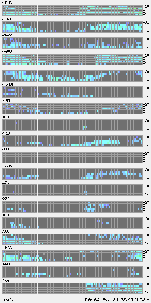 This is a record of NCDXF Beacon received at W6SI station using FAROS 1.4 monitor software. There are 18 beacons throughout the world, it records each ham band between 20m to 10m bands, including WARC bands. Each row on the given beacon block represents the band, 20, 17, 15, 12 and 10 meters, from the bottom to the top. The chart shows the relative signal strength (S/N ratio) of the received beacon. |