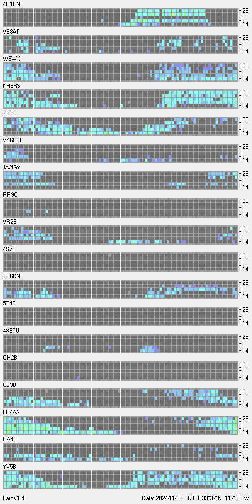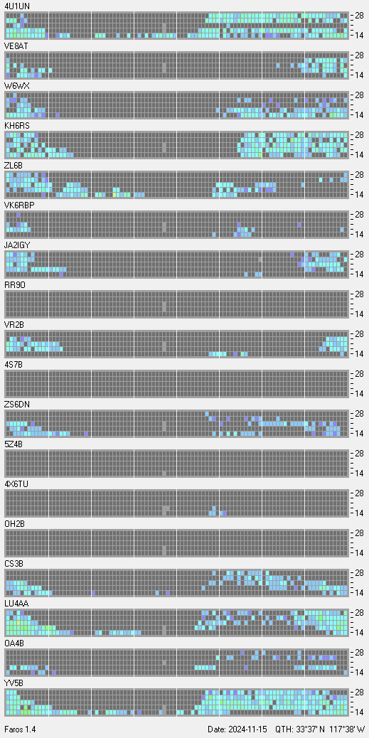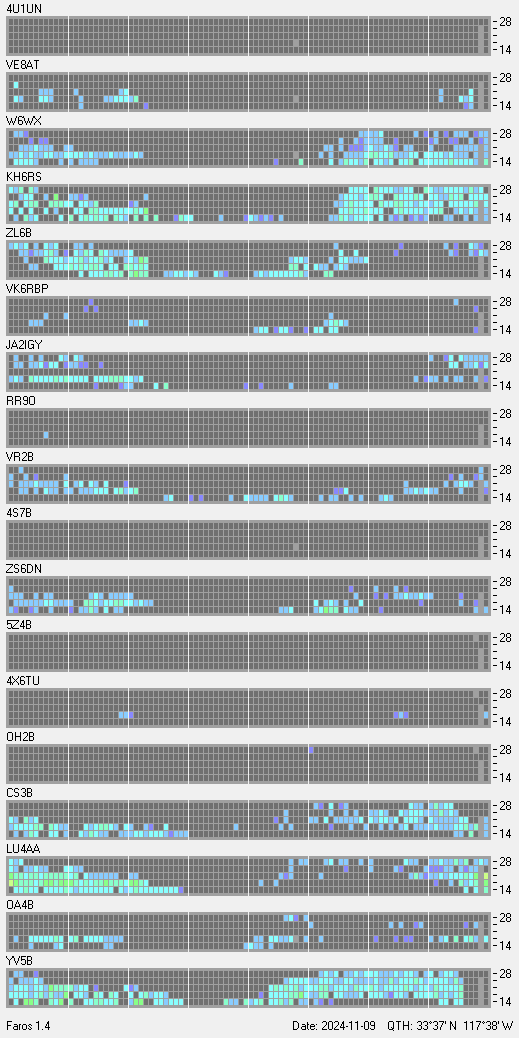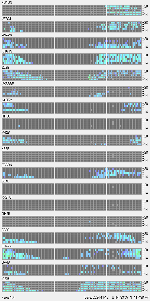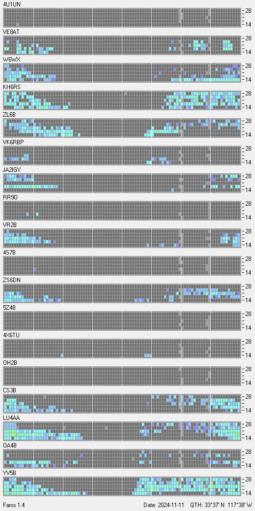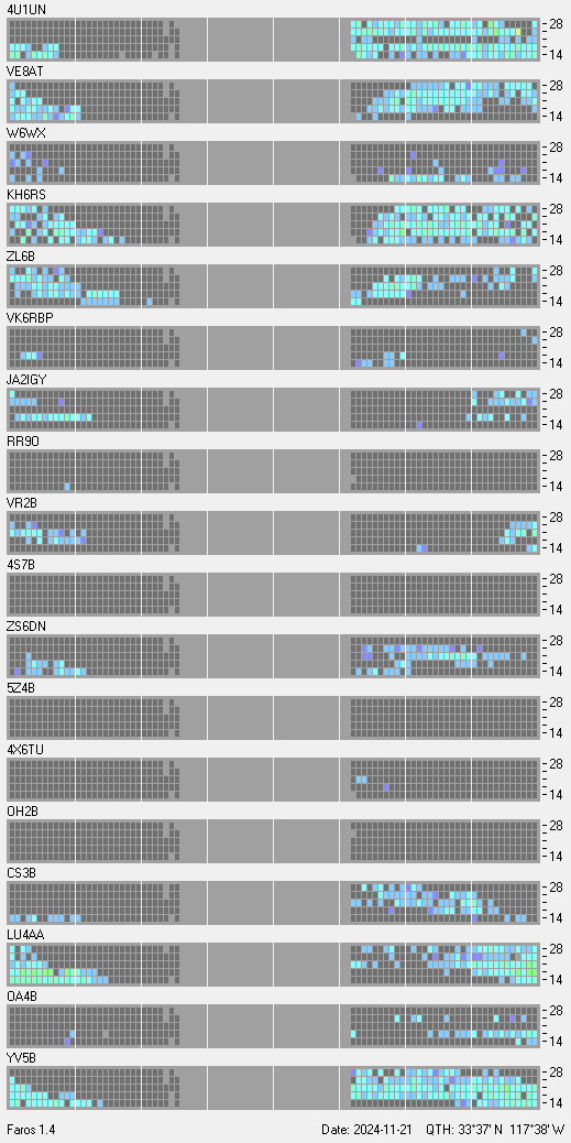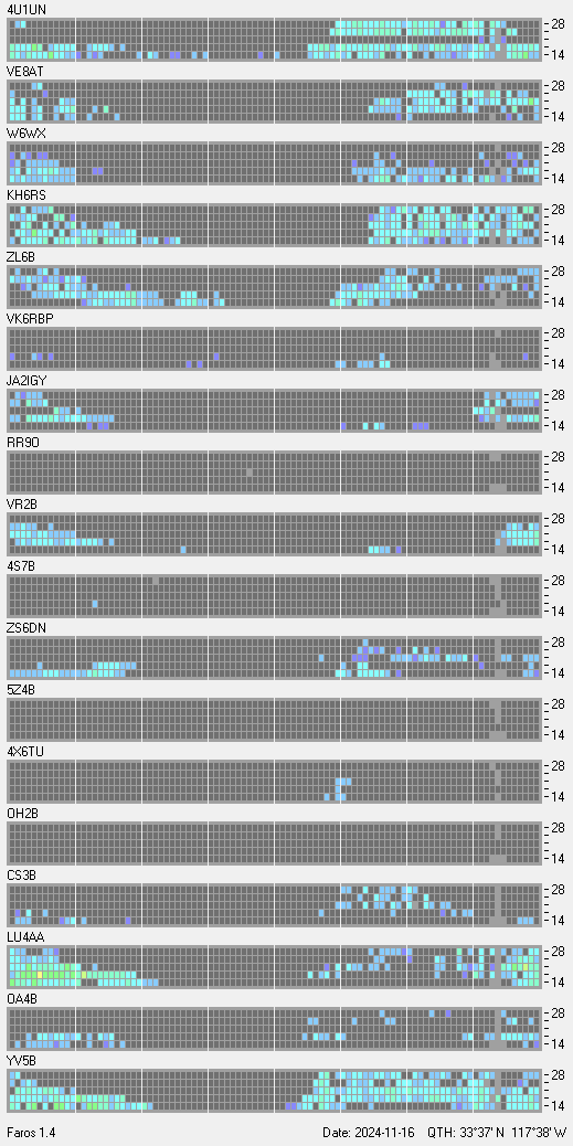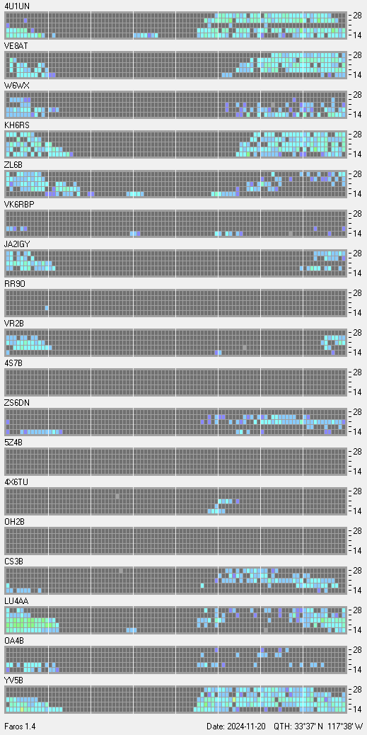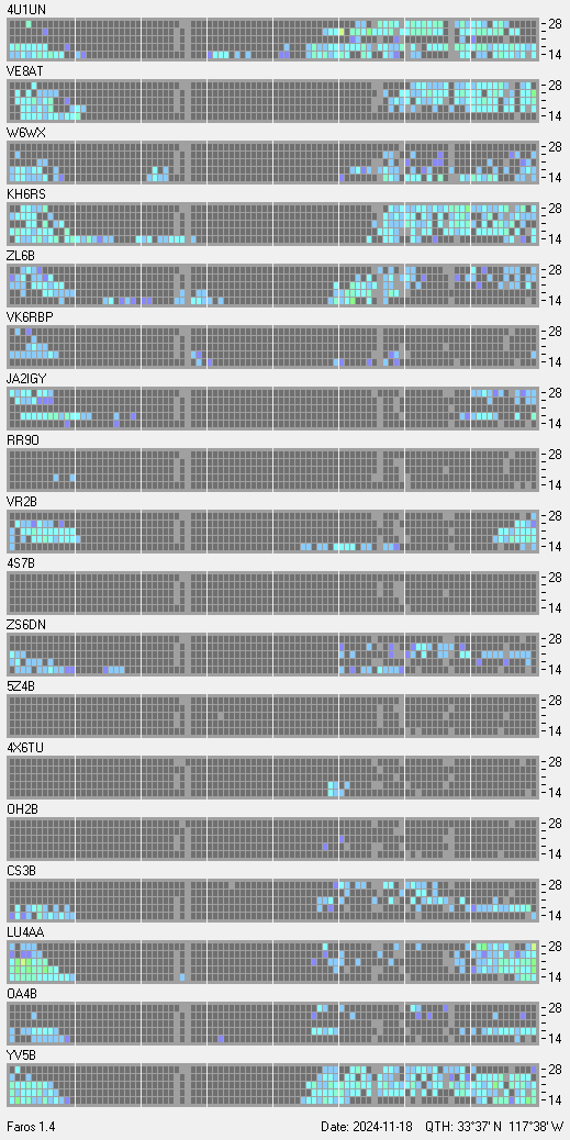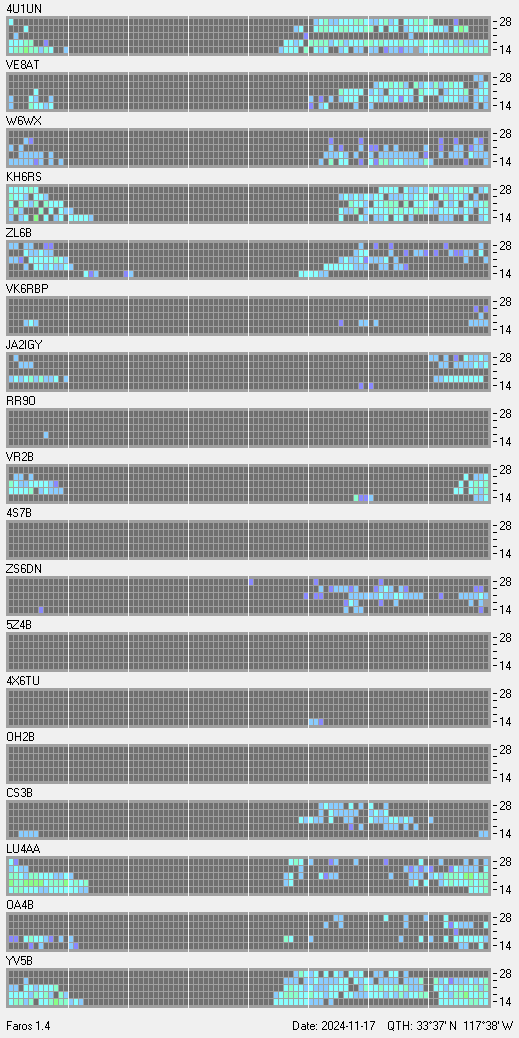 This is a record of NCDXF Beacon received at W6SI station using FAROS 1.4 monitor software. There are 18 beacons throughout the world, it records each ham band between 20m to 10m bands, including WARC bands. Each row on the given beacon block represents the band, 20, 17, 15, 12 and 10 meters, from the bottom to the top. The chart shows the relative signal strength (S/N ratio) of the received beacon. |