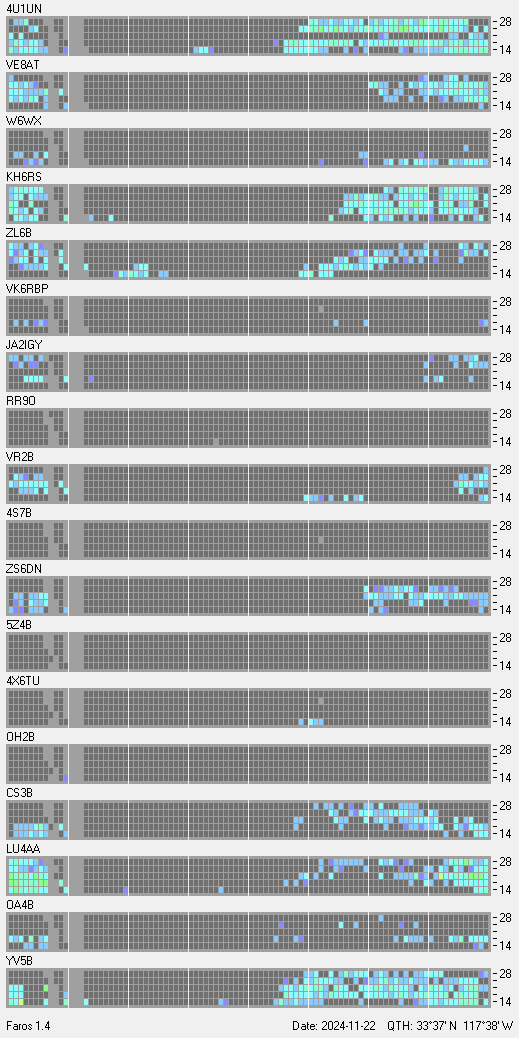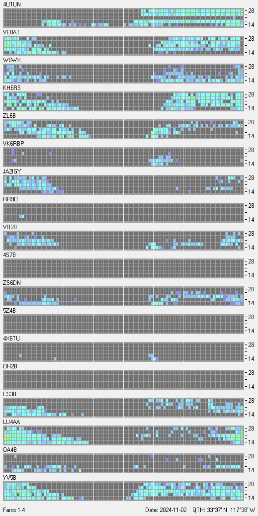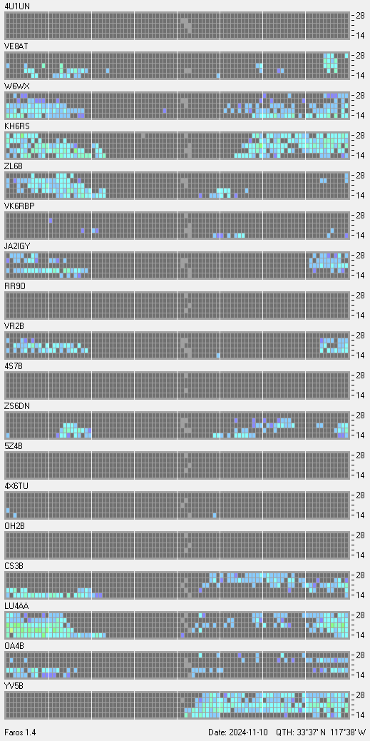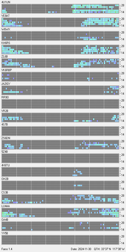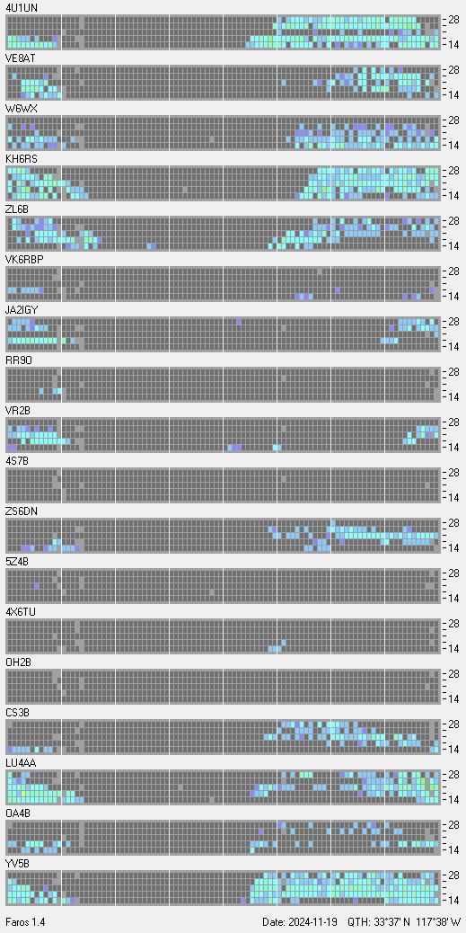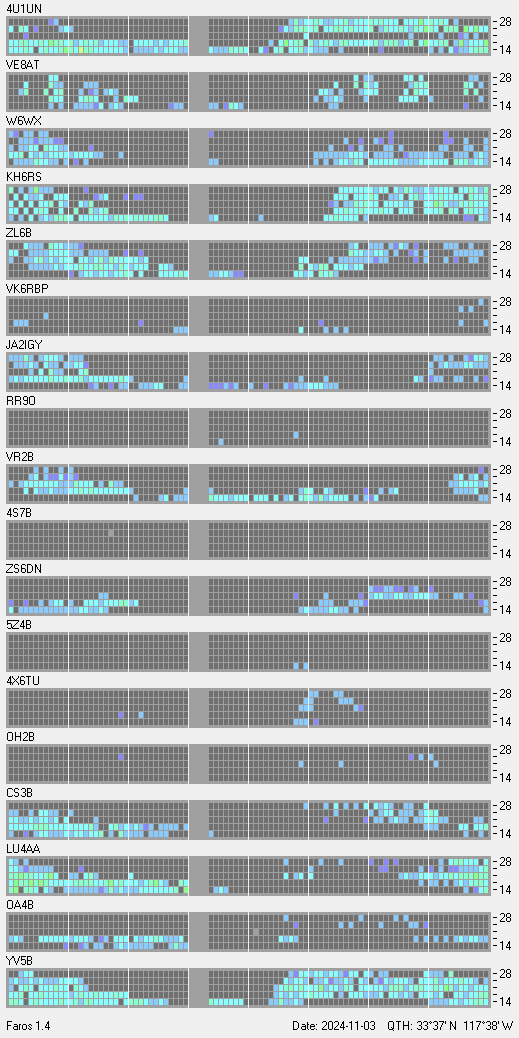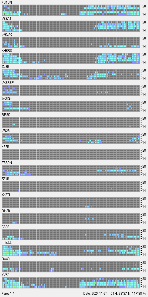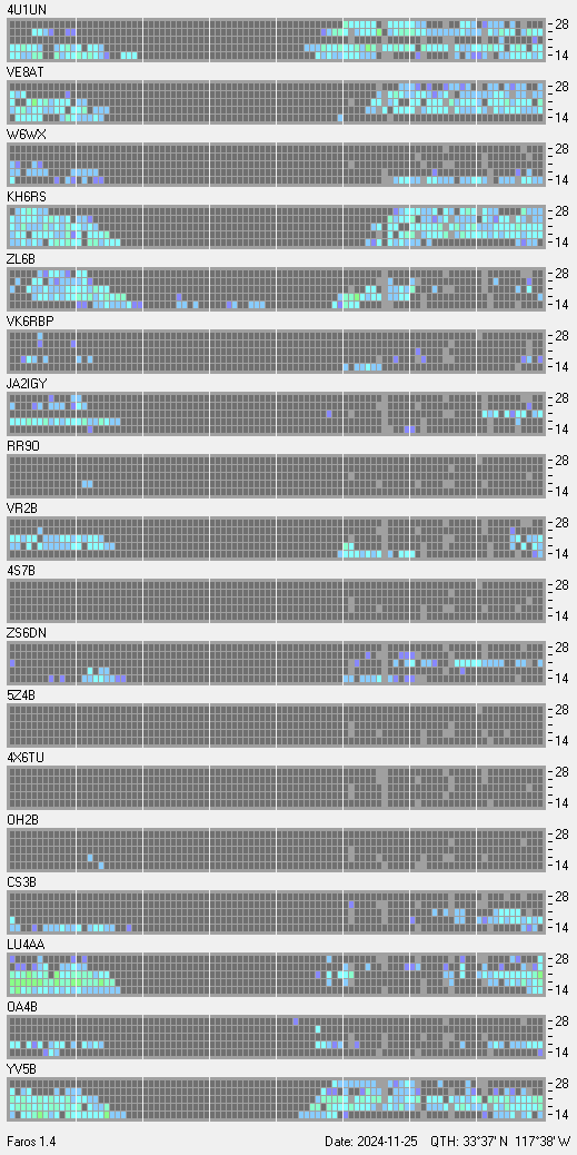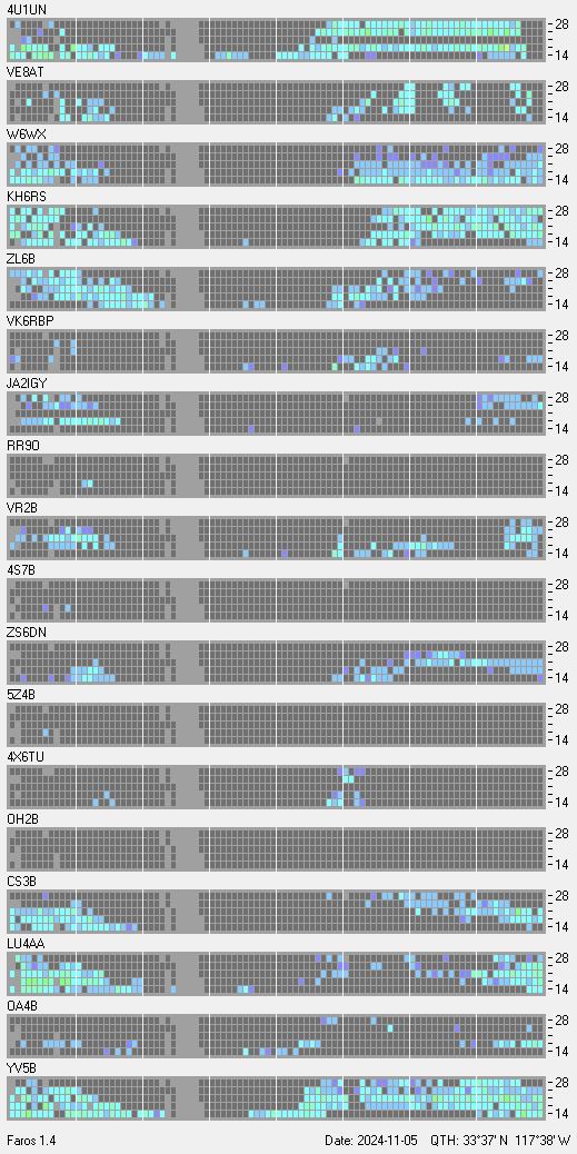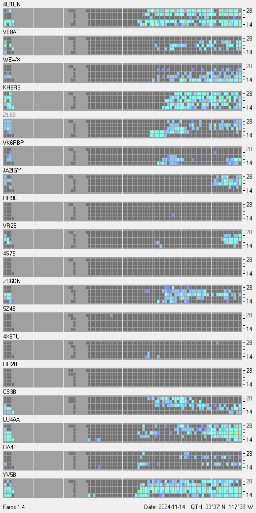 This is a record of NCDXF Beacon received at W6SI station using FAROS 1.4 monitor software. There are 18 beacons throughout the world, it records each ham band between 20m to 10m bands, including WARC bands. Each row on the given beacon block represents the band, 20, 17, 15, 12 and 10 meters, from the bottom to the top. The chart shows the relative signal strength (S/N ratio) of the received beacon. |