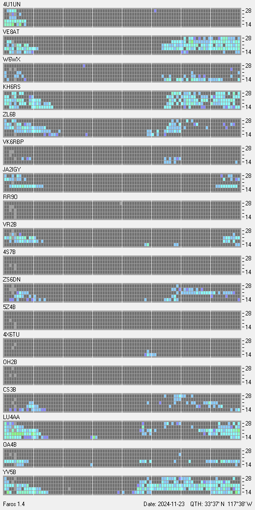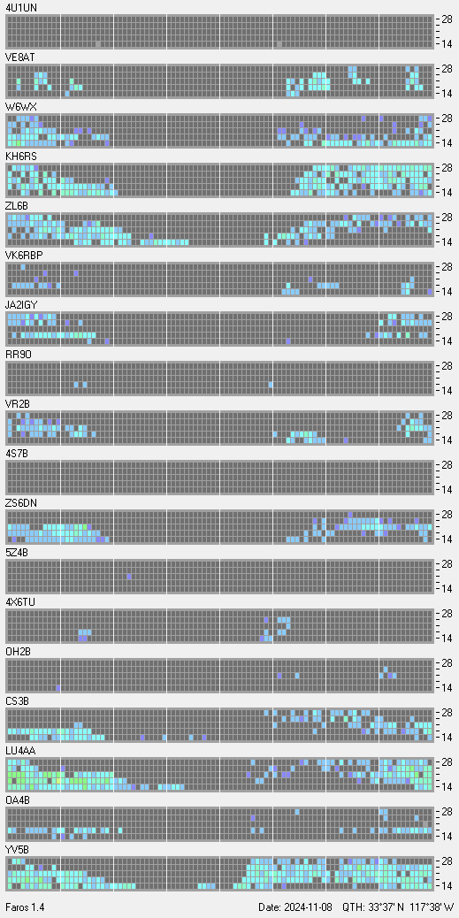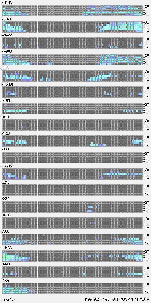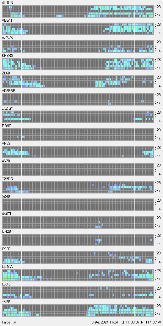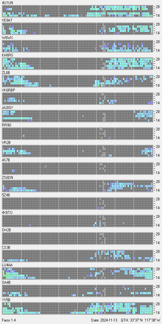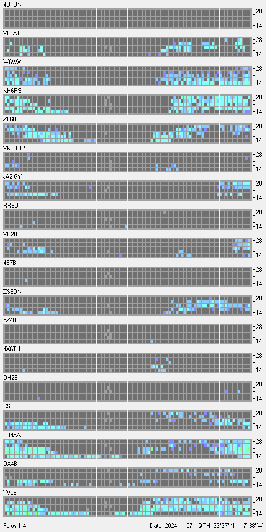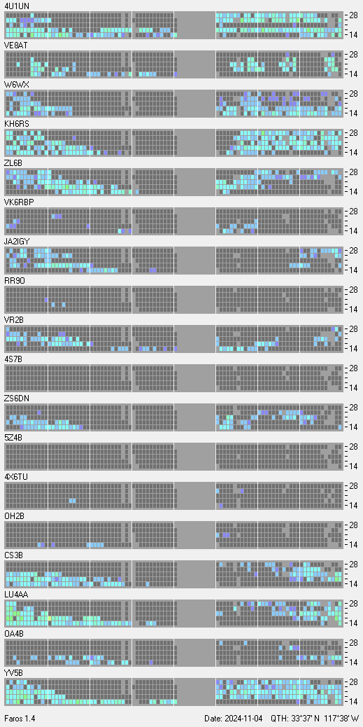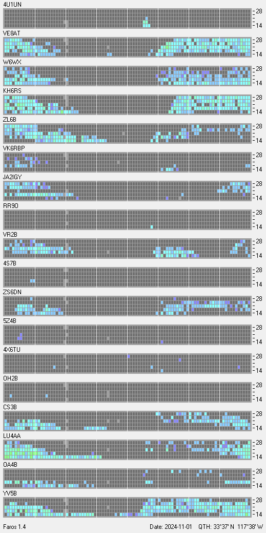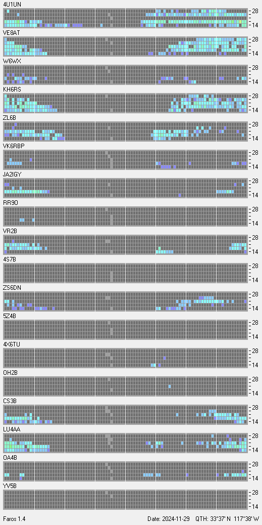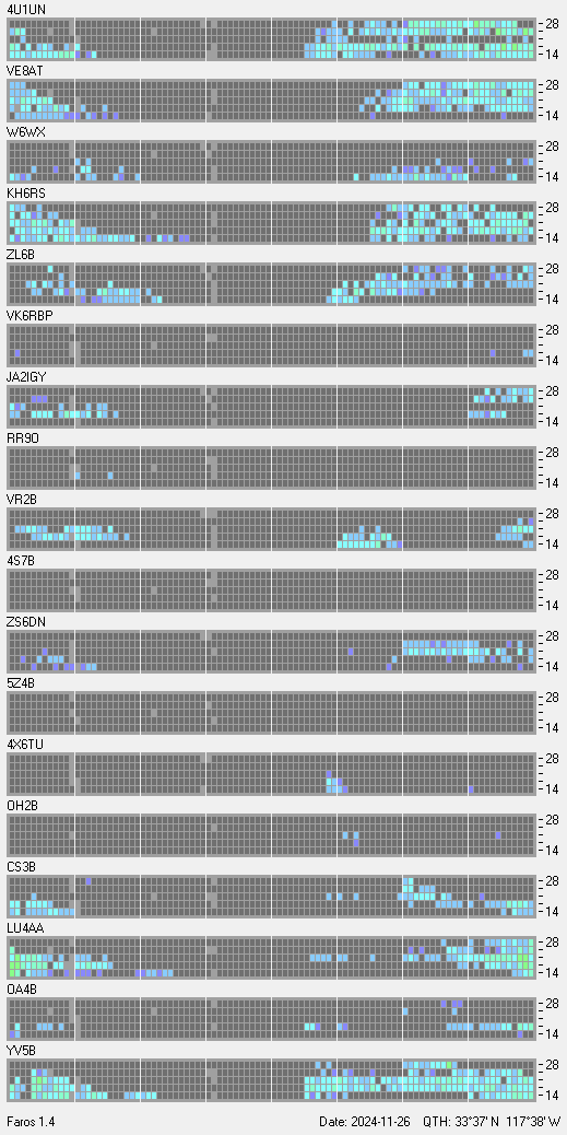 This is a record of NCDXF Beacon received at W6SI station using FAROS 1.4 monitor software. There are 18 beacons throughout the world, it records each ham band between 20m to 10m bands, including WARC bands. Each row on the given beacon block represents the band, 20, 17, 15, 12 and 10 meters, from the bottom to the top. The chart shows the relative signal strength (S/N ratio) of the received beacon. |
