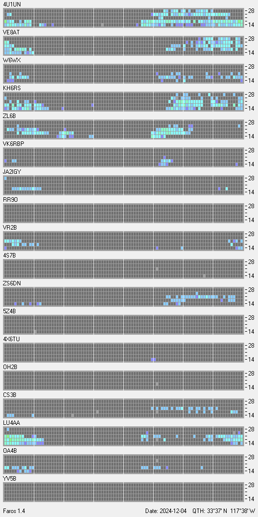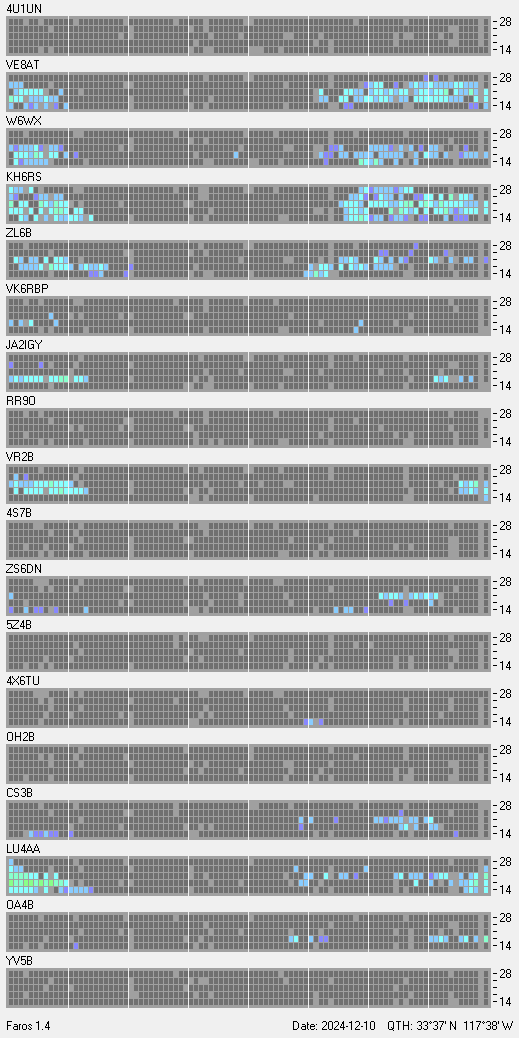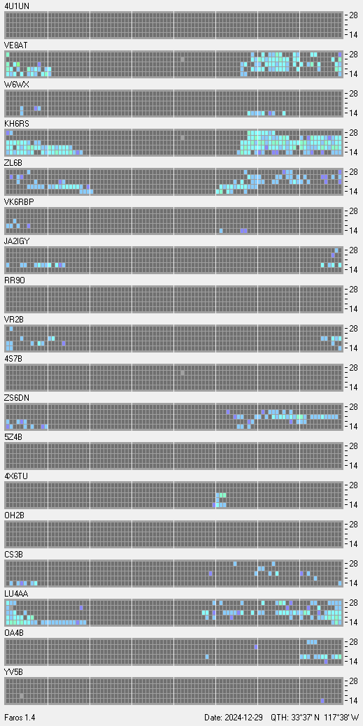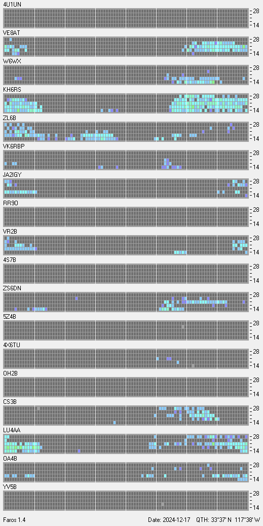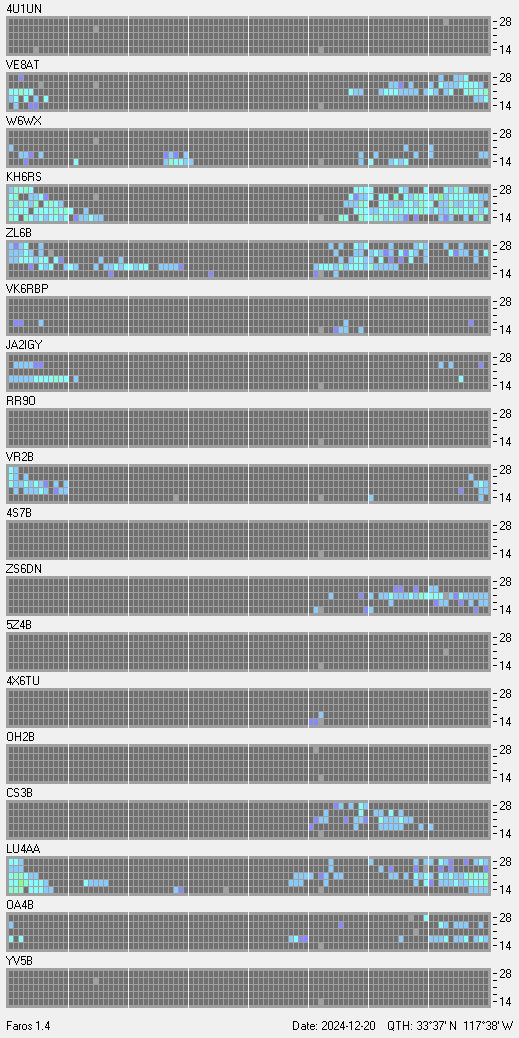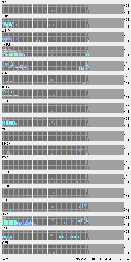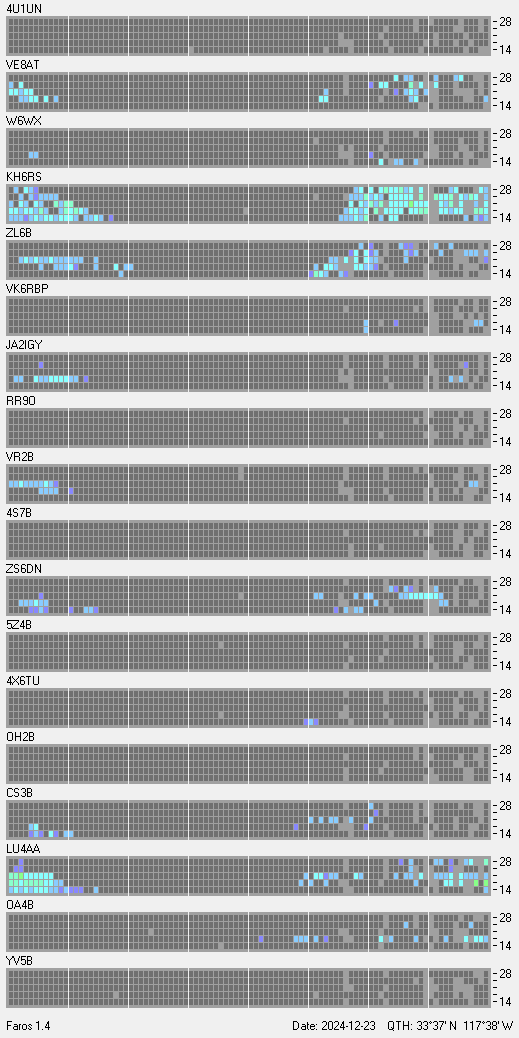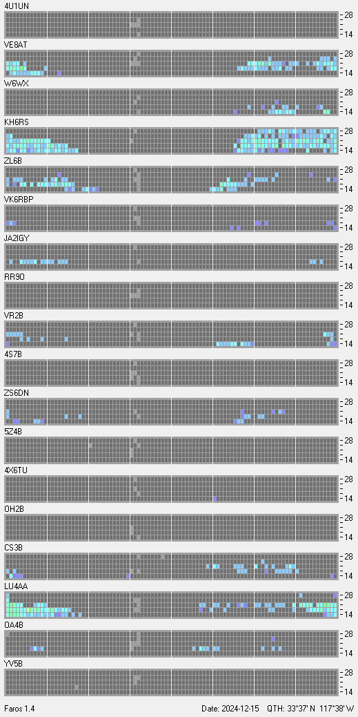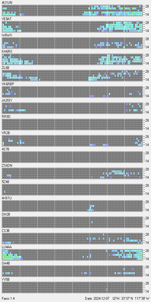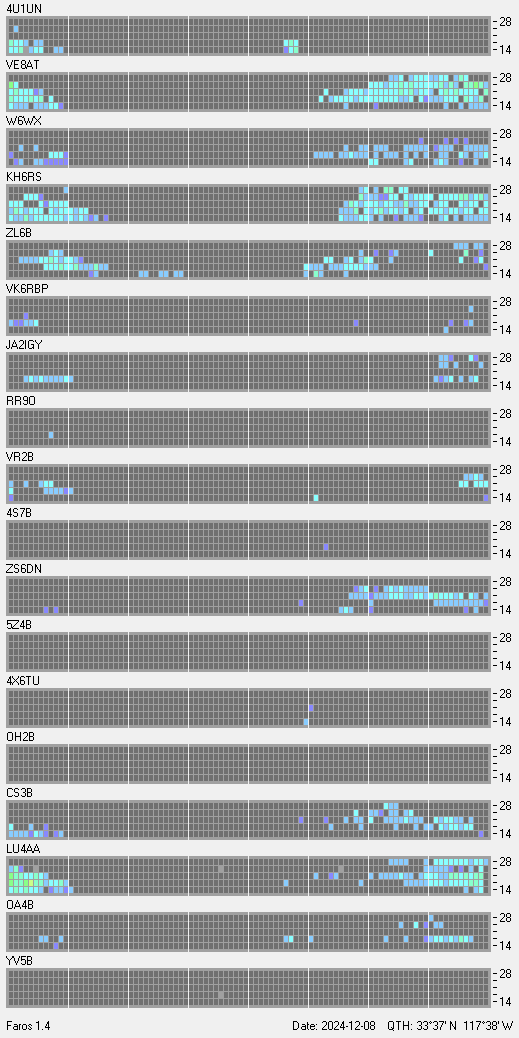 This is a record of NCDXF Beacon received at W6SI station using FAROS 1.4 monitor software. There are 18 beacons throughout the world, it records each ham band between 20m to 10m bands, including WARC bands. Each row on the given beacon block represents the band, 20, 17, 15, 12 and 10 meters, from the bottom to the top. The chart shows the relative signal strength (S/N ratio) of the received beacon. |