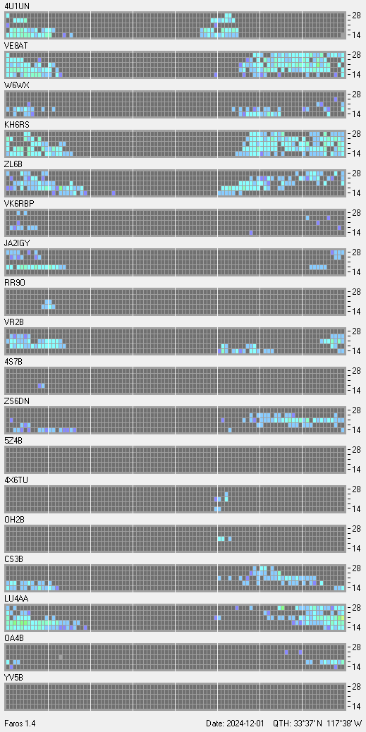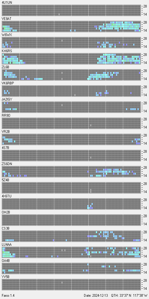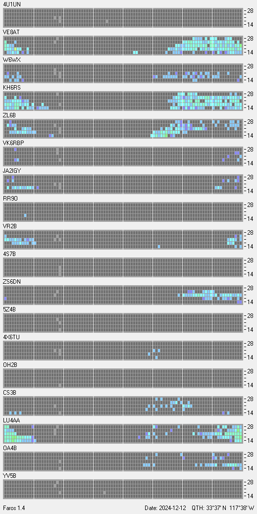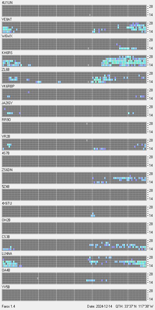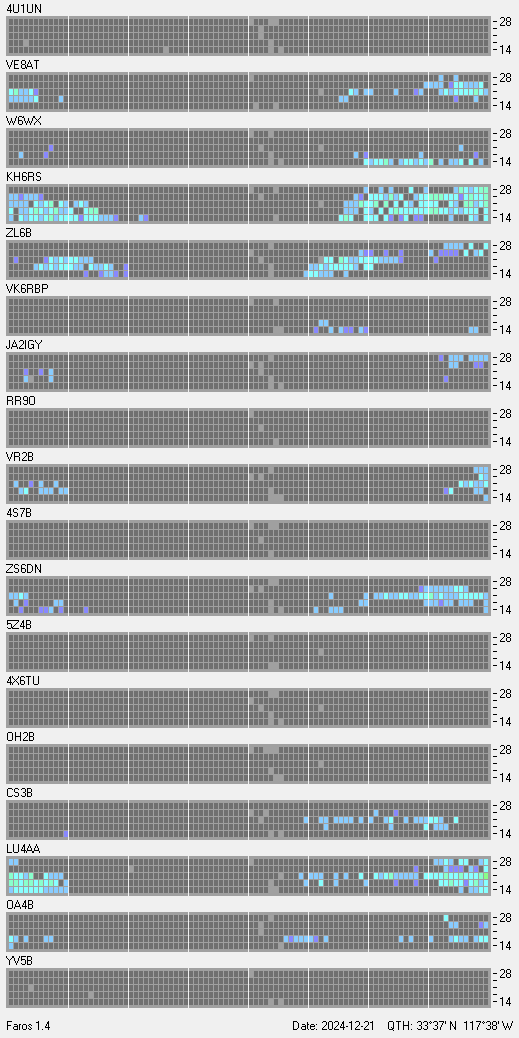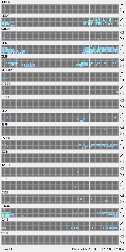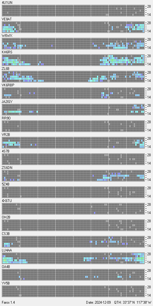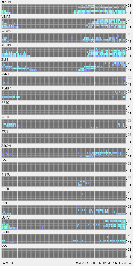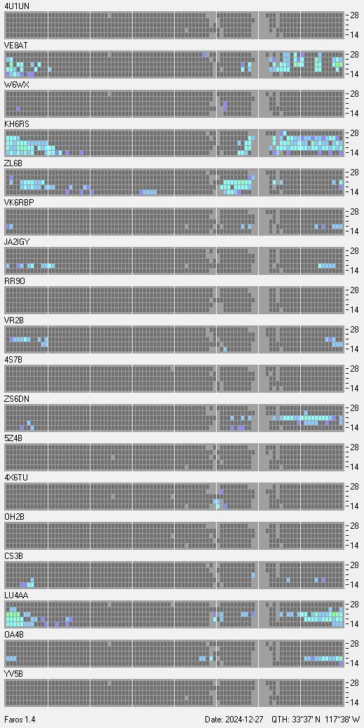 This is a record of NCDXF Beacon received at W6SI station using FAROS 1.4 monitor software. There are 18 beacons throughout the world, it records each ham band between 20m to 10m bands, including WARC bands. Each row on the given beacon block represents the band, 20, 17, 15, 12 and 10 meters, from the bottom to the top. The chart shows the relative signal strength (S/N ratio) of the received beacon. |