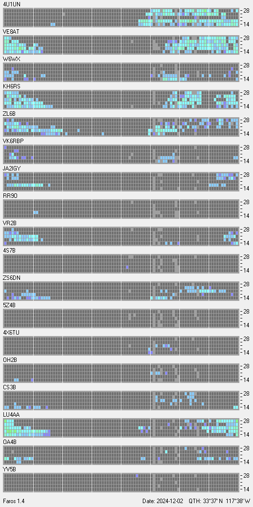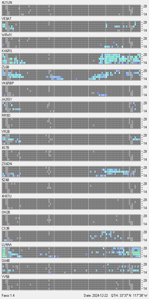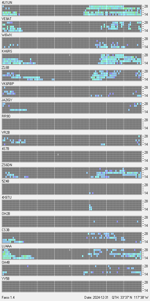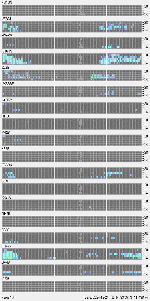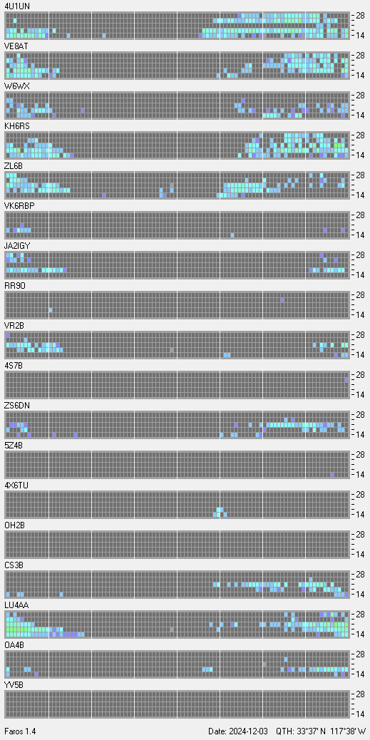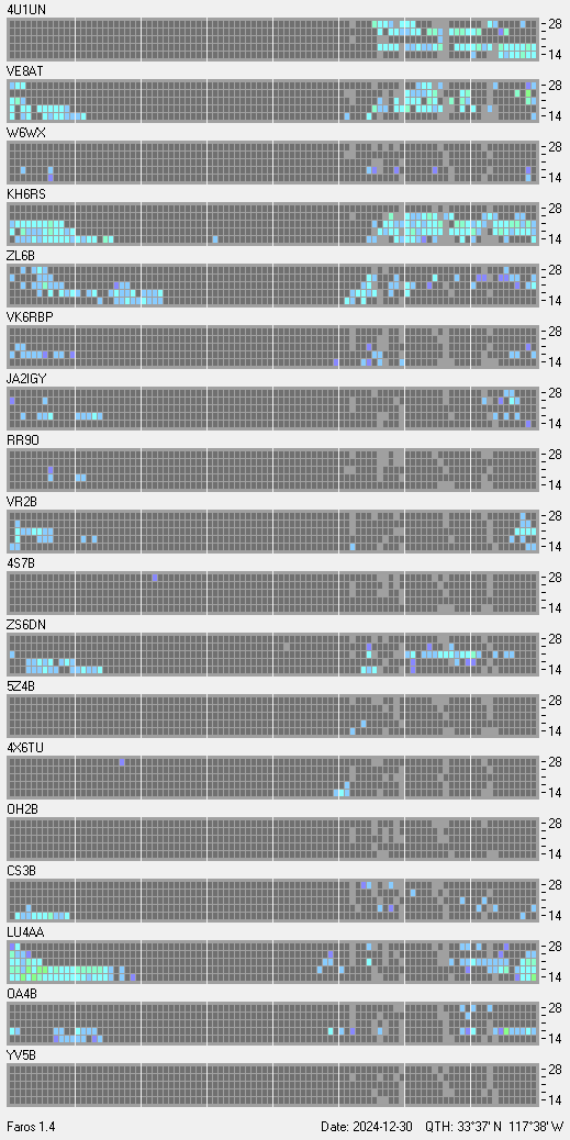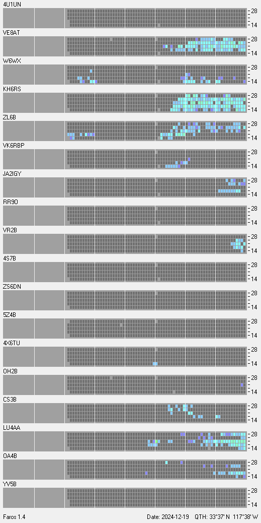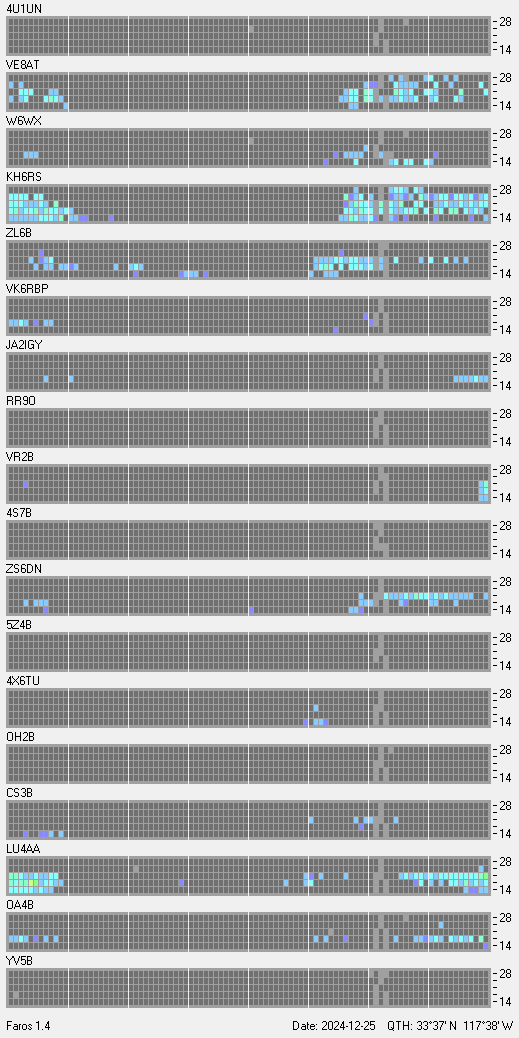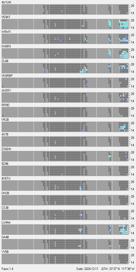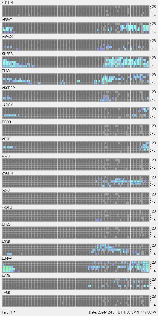 This is a record of NCDXF Beacon received at W6SI station using FAROS 1.4 monitor software. There are 18 beacons throughout the world, it records each ham band between 20m to 10m bands, including WARC bands. Each row on the given beacon block represents the band, 20, 17, 15, 12 and 10 meters, from the bottom to the top. The chart shows the relative signal strength (S/N ratio) of the received beacon. |