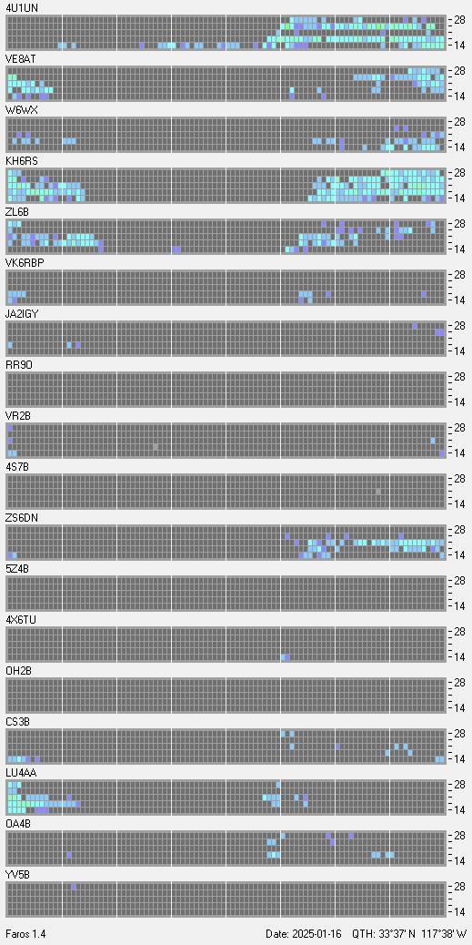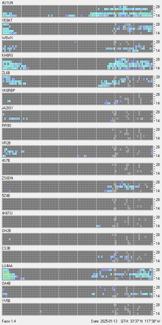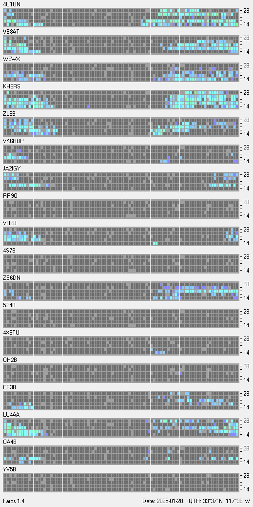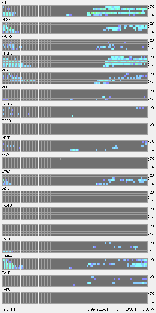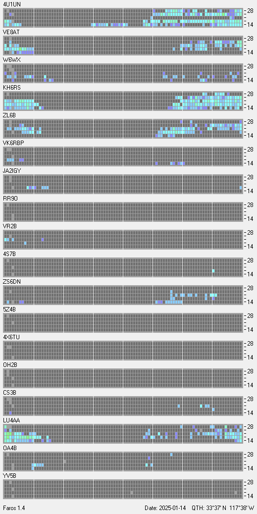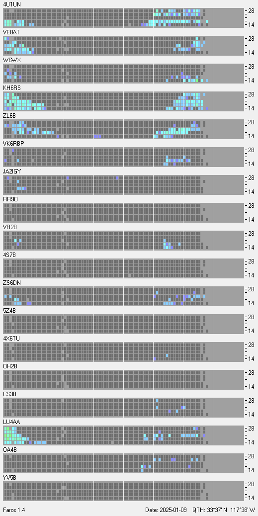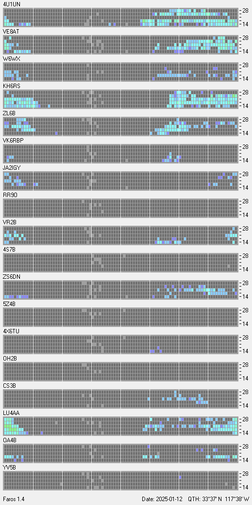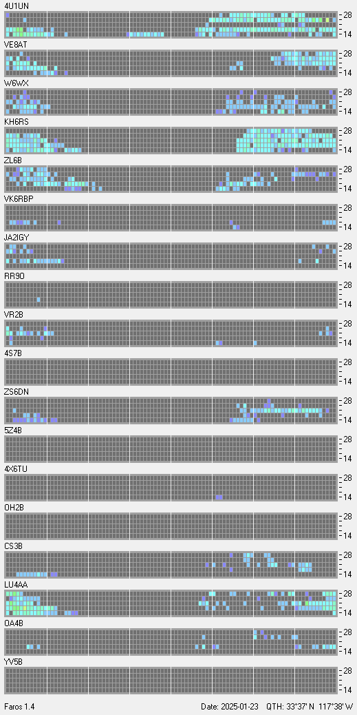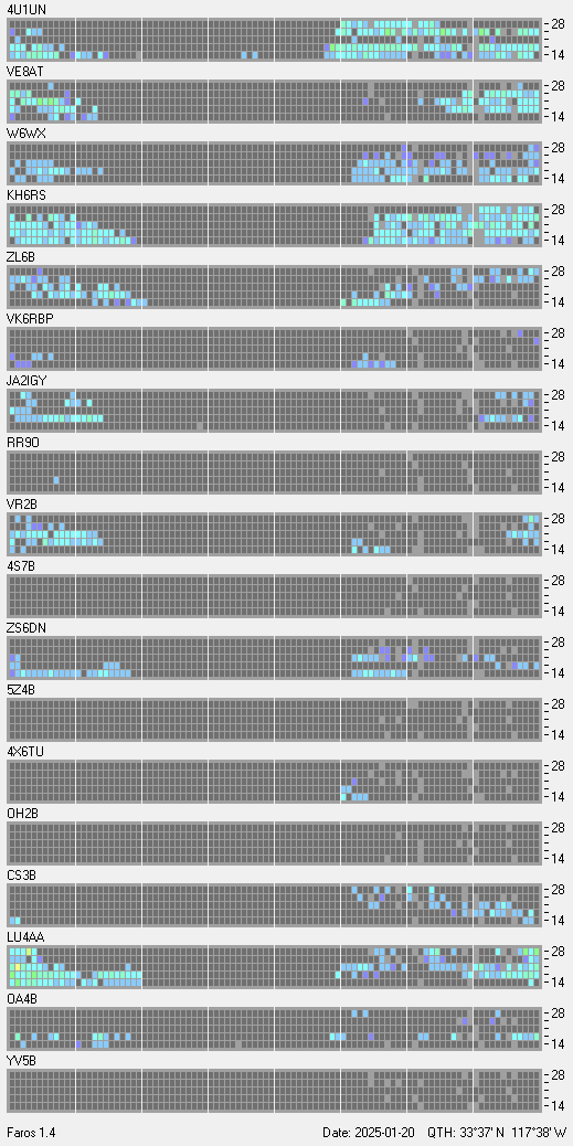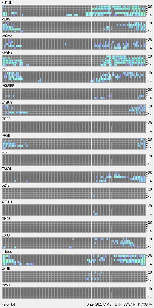 This is a record of NCDXF Beacon received at W6SI station using FAROS 1.4 monitor software. There are 18 beacons throughout the world, it records each ham band between 20m to 10m bands, including WARC bands. Each row on the given beacon block represents the band, 20, 17, 15, 12 and 10 meters, from the bottom to the top. The chart shows the relative signal strength (S/N ratio) of the received beacon. |